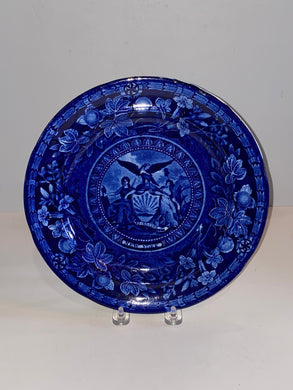 Historical Staffordshire Blue Dinner Plate with Arms of New York Ca. 1825