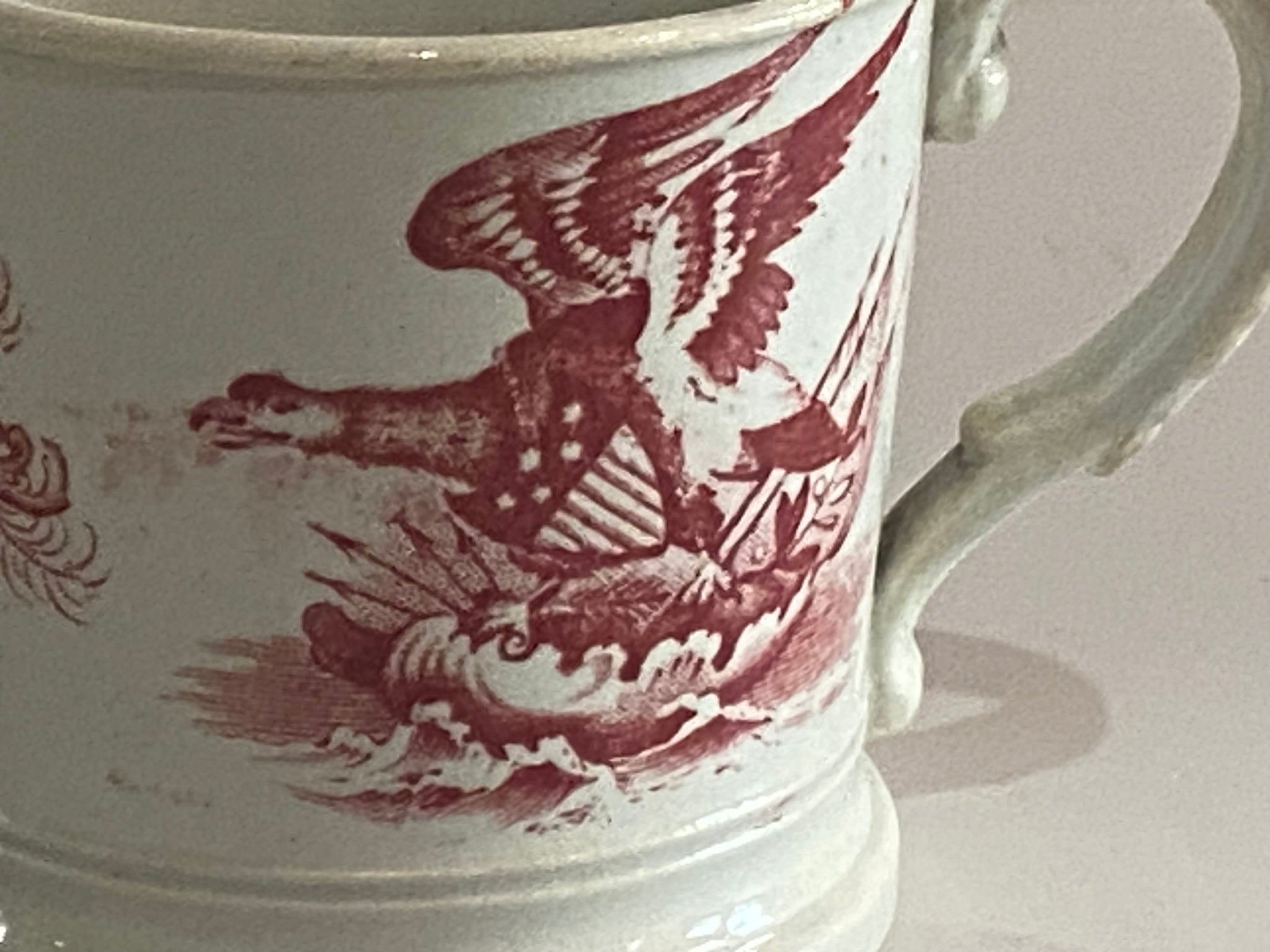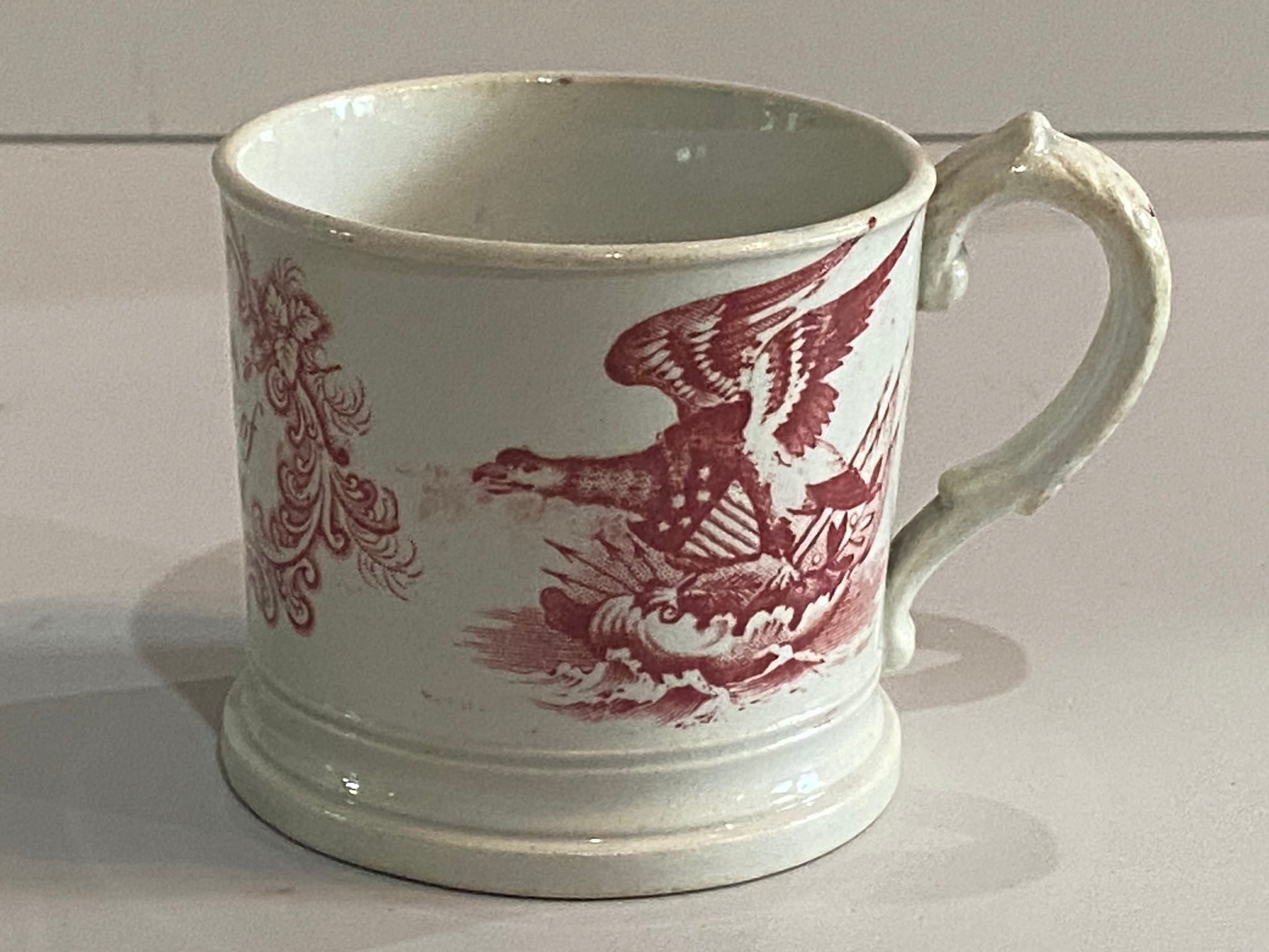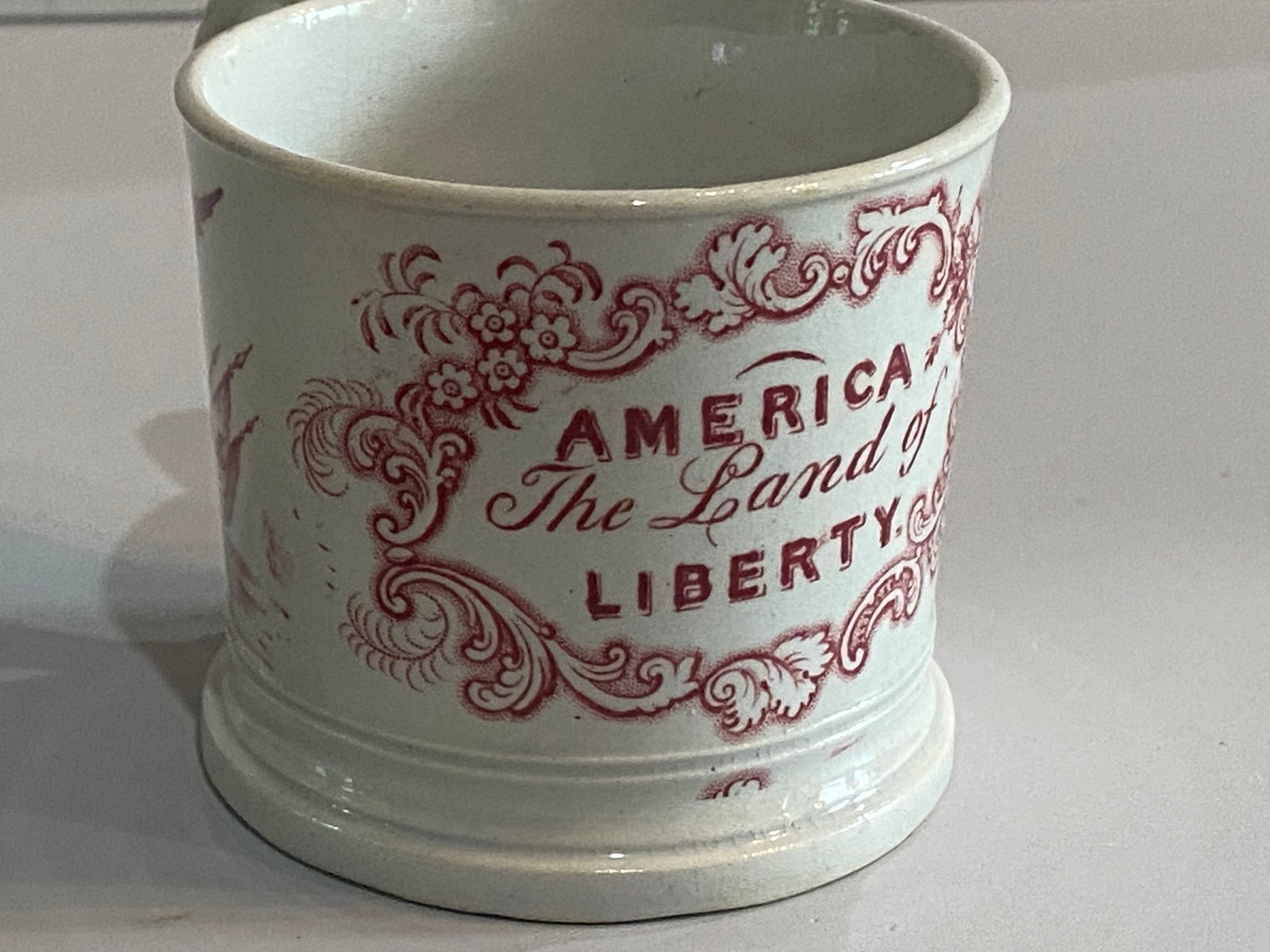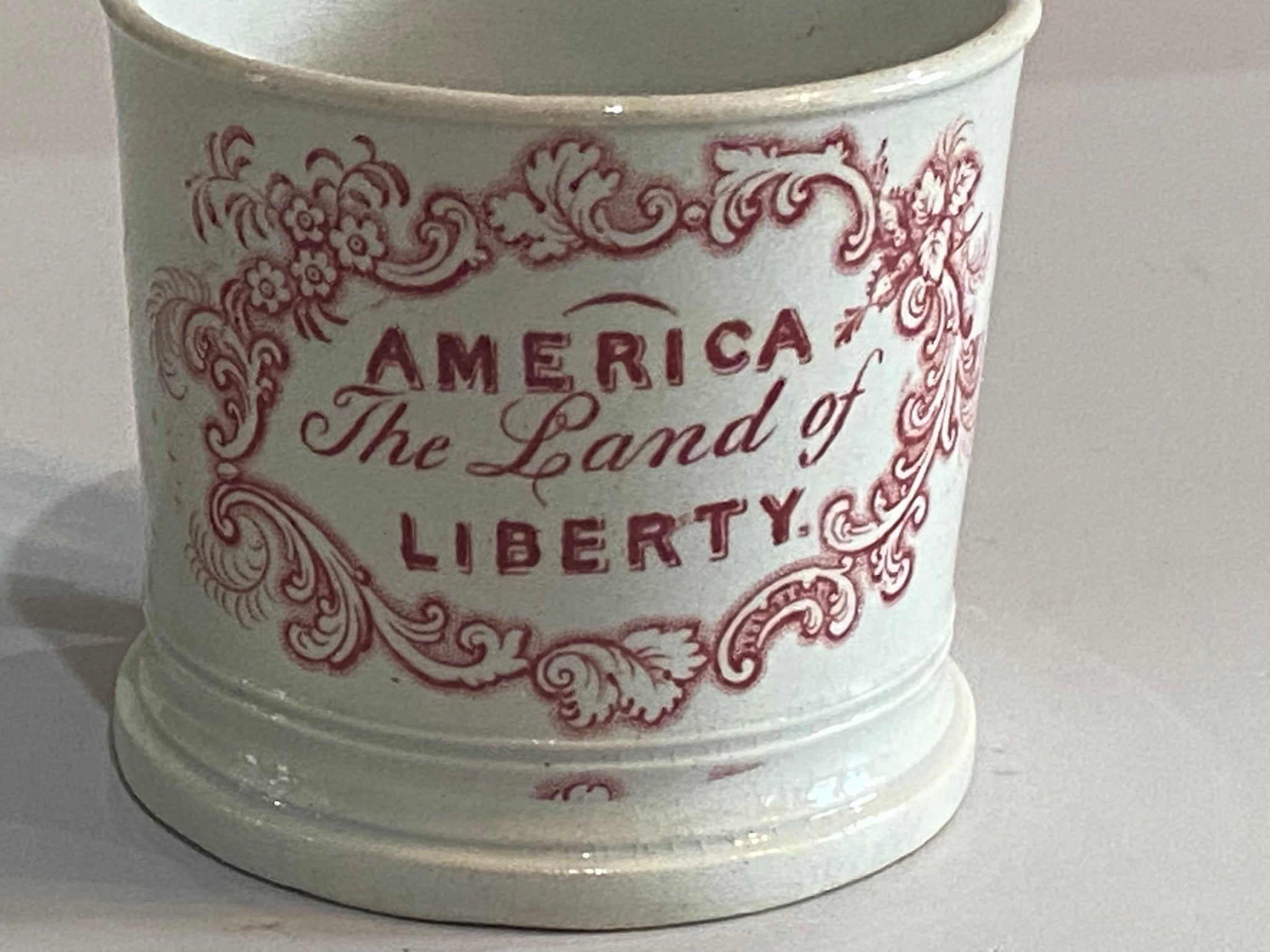 Staffordshire Pearlware pink transfer “America The Land of Liberty” surrounded by eagle and shields childs mug. Perfect condition with no chips, cracks or repairs. It measures 2 3/8” tall and dates circa 1830’s.