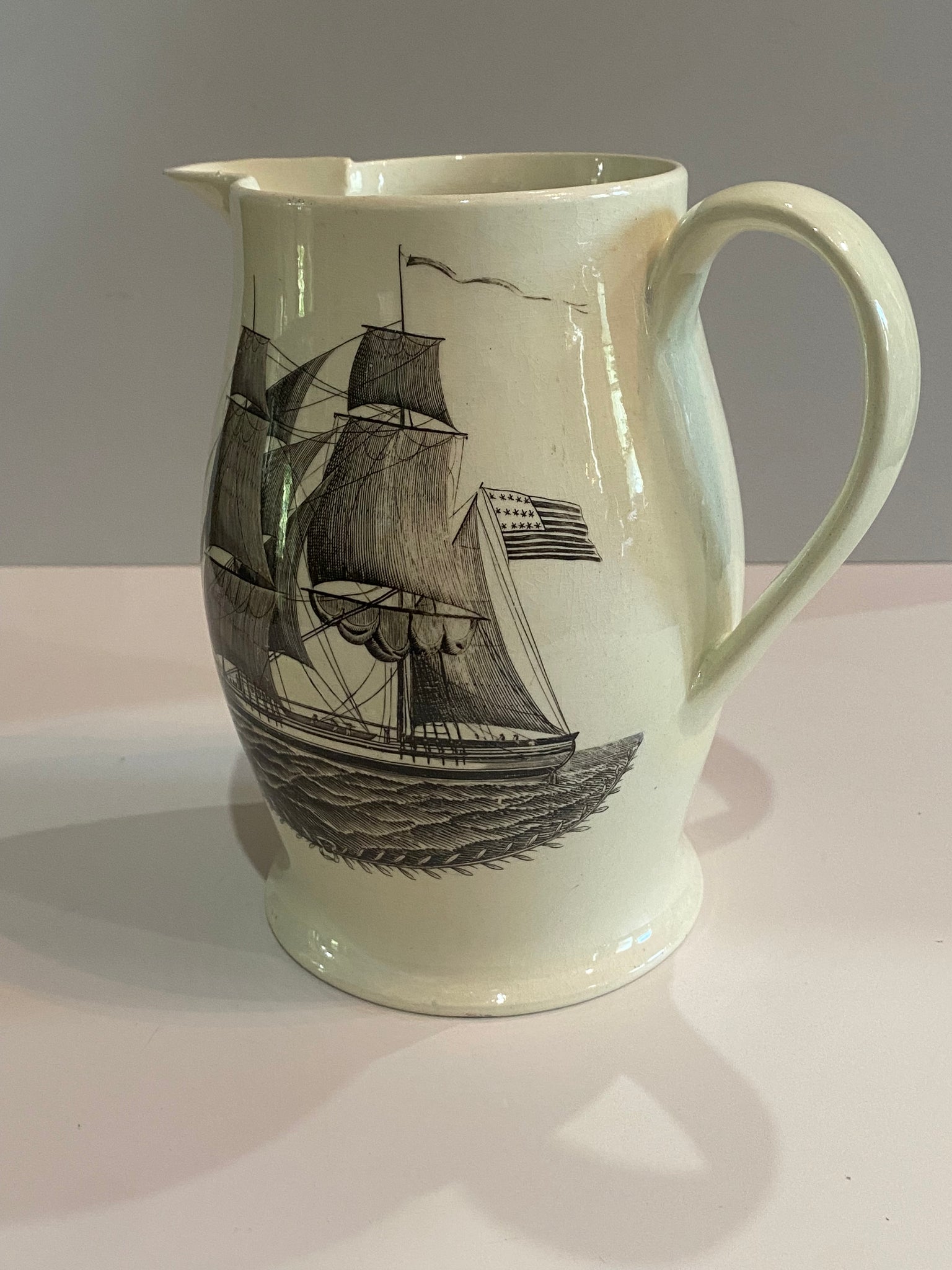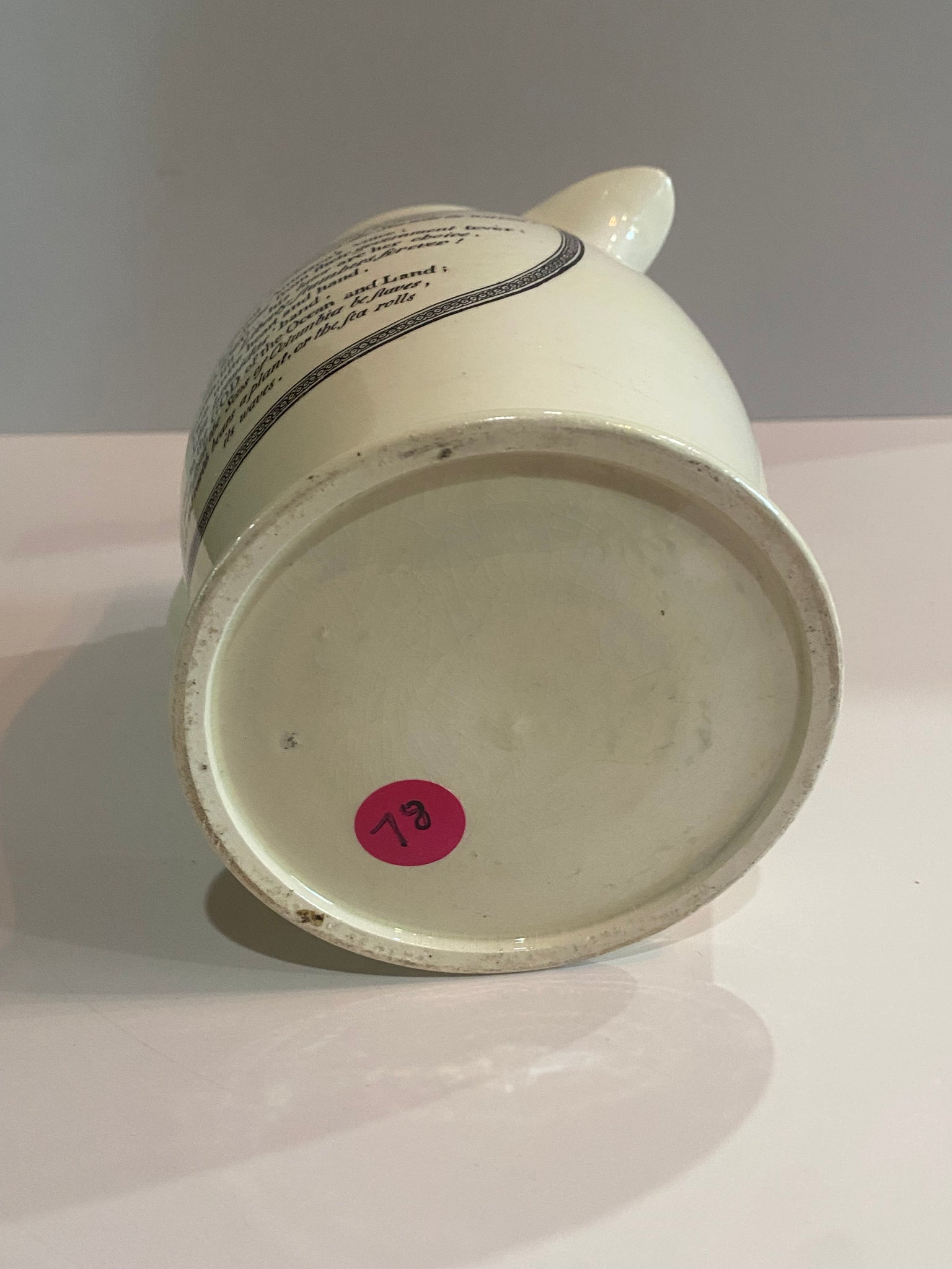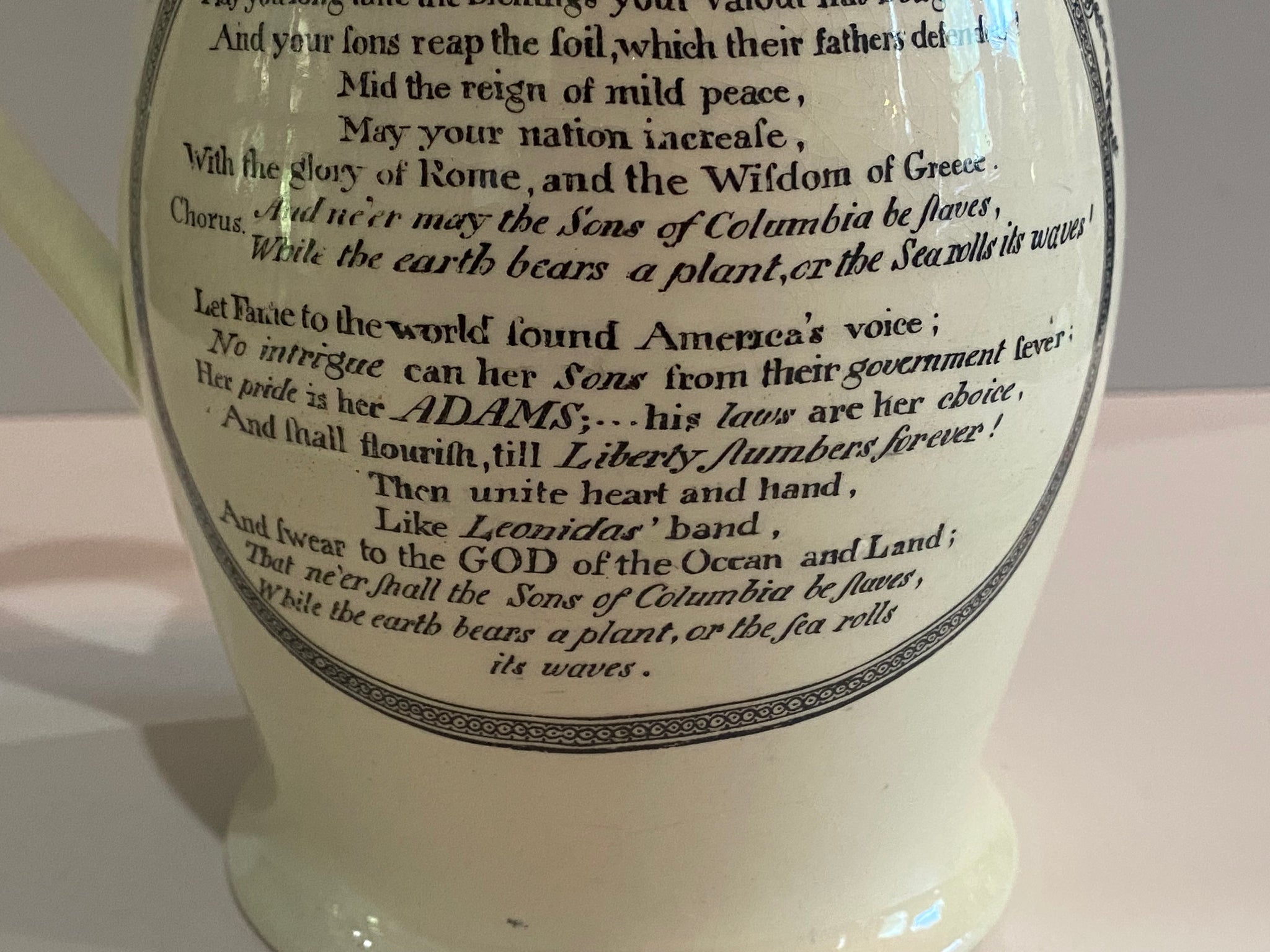 Staffordshire Creamware John Adams and Liberty Poem with American Ship on reverse. Displays as perfect with professional repairs to the handle, spout and base chip. It measures 6 7/8” tall by 7” from the tip of the spout to the handle and dates circa 1800.