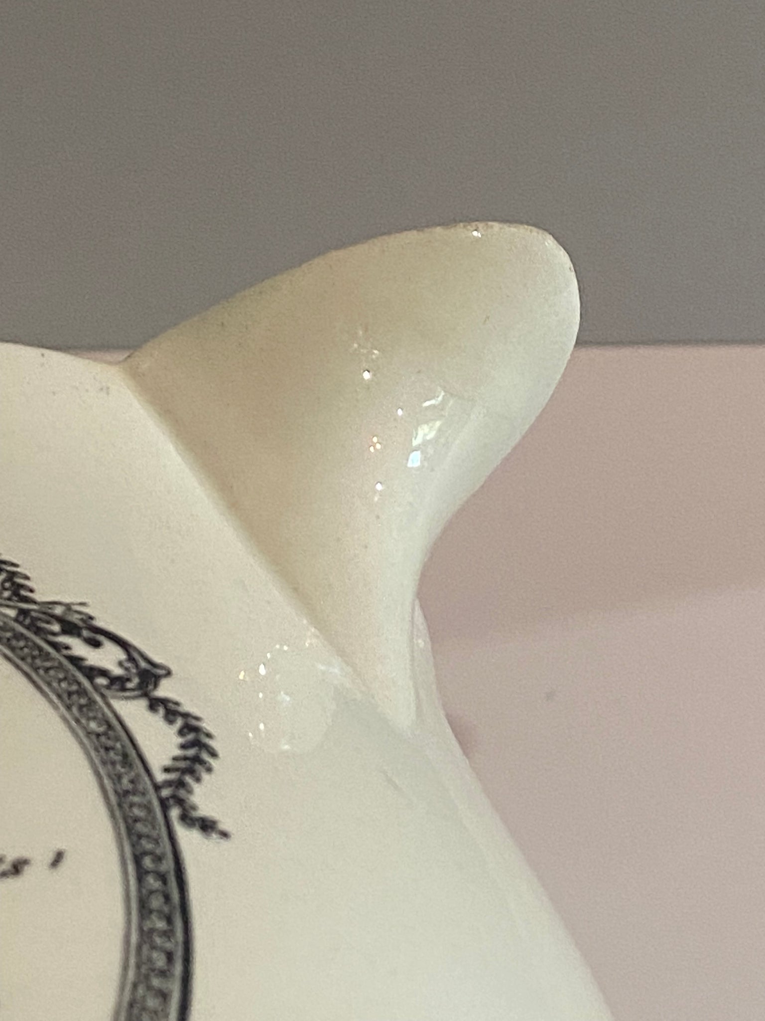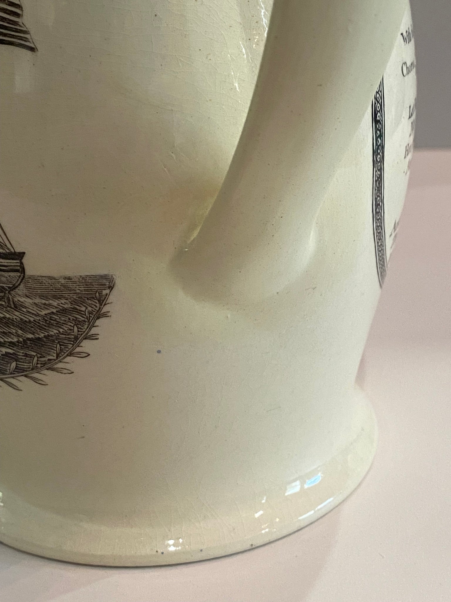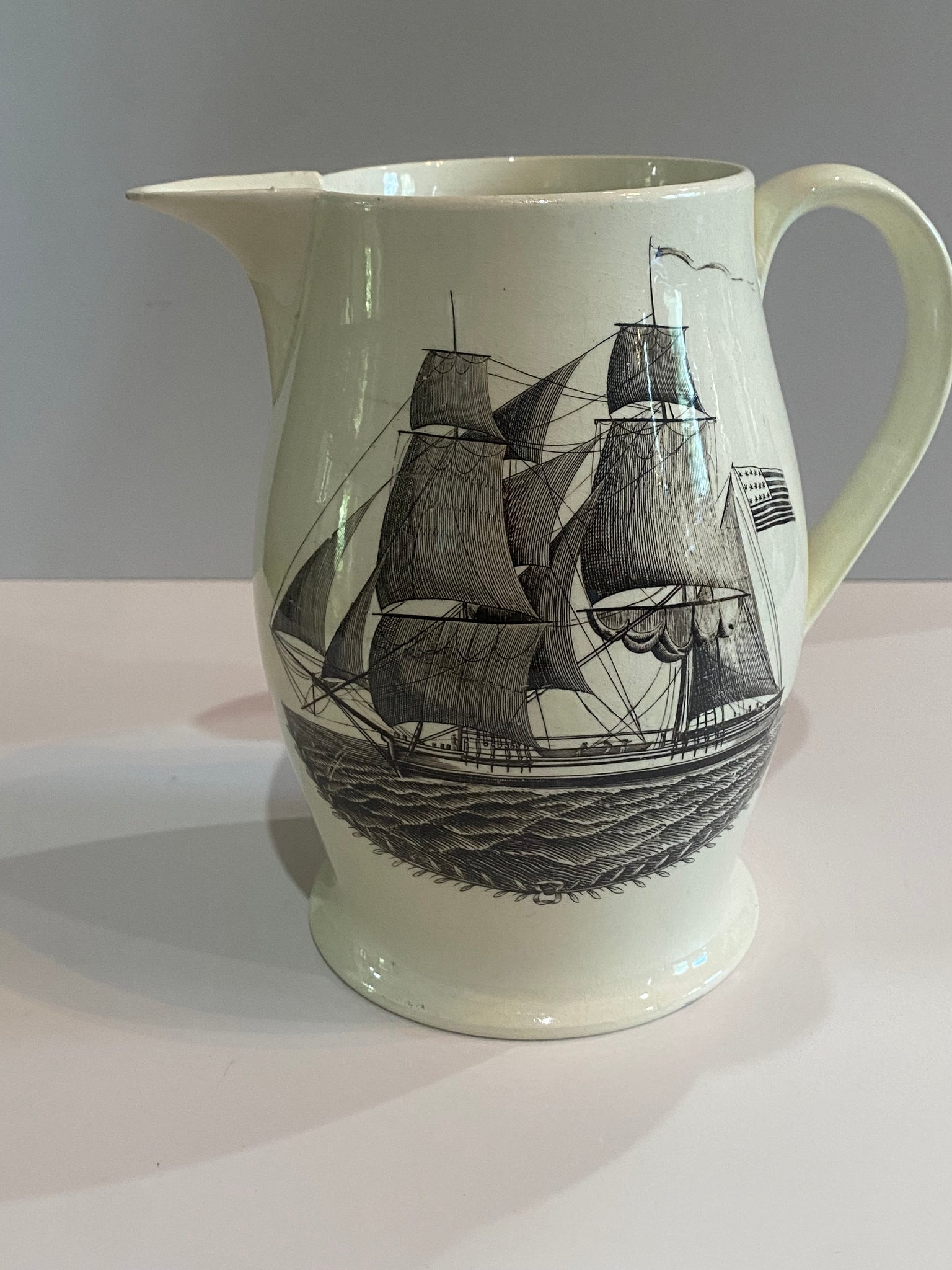 Staffordshire Creamware John Adams and Liberty Poem with American Ship on reverse. Displays as perfect with professional repairs to the handle, spout and base chip. It measures 6 7/8” tall by 7” from the tip of the spout to the handle and dates circa 1800.