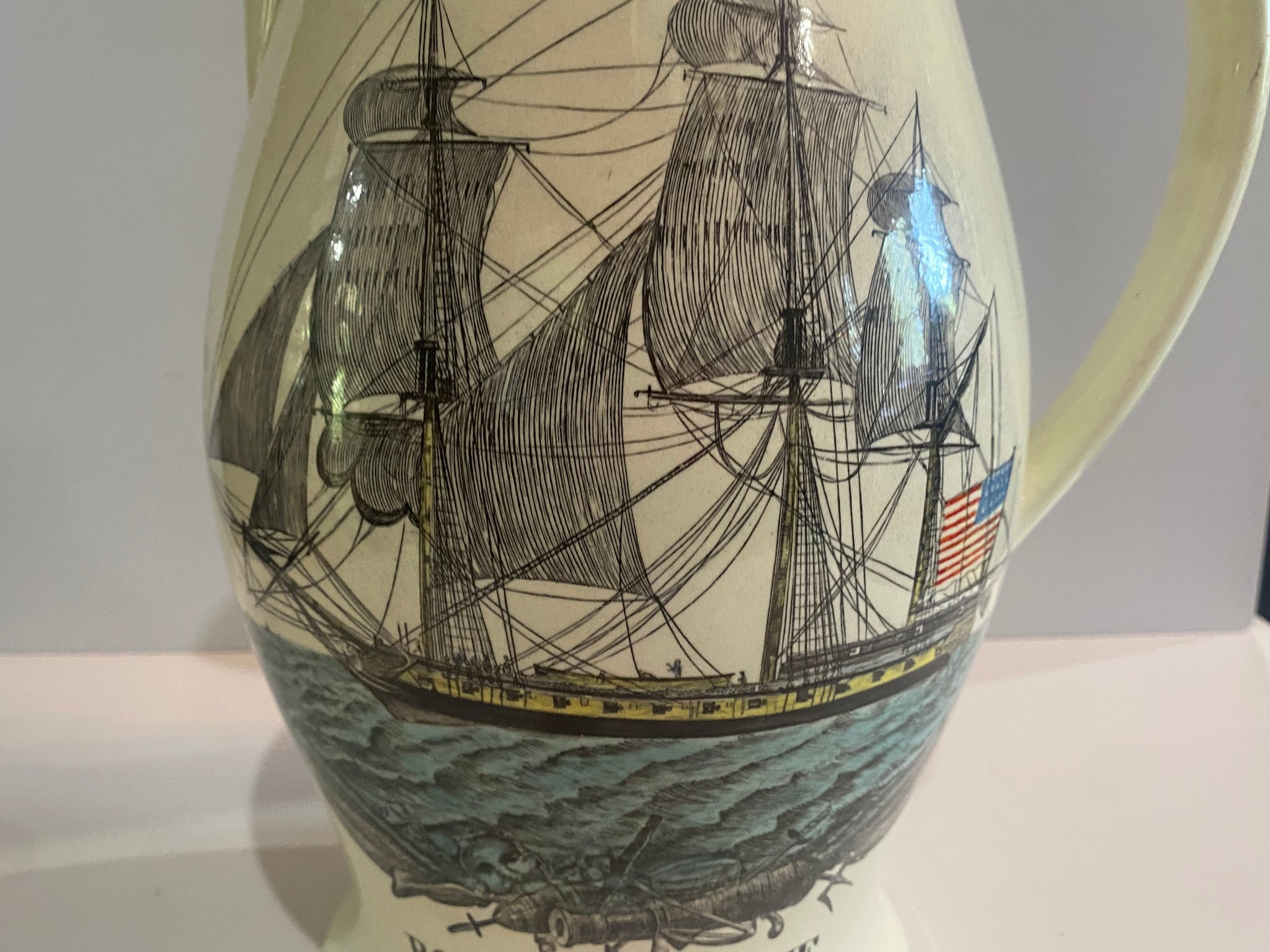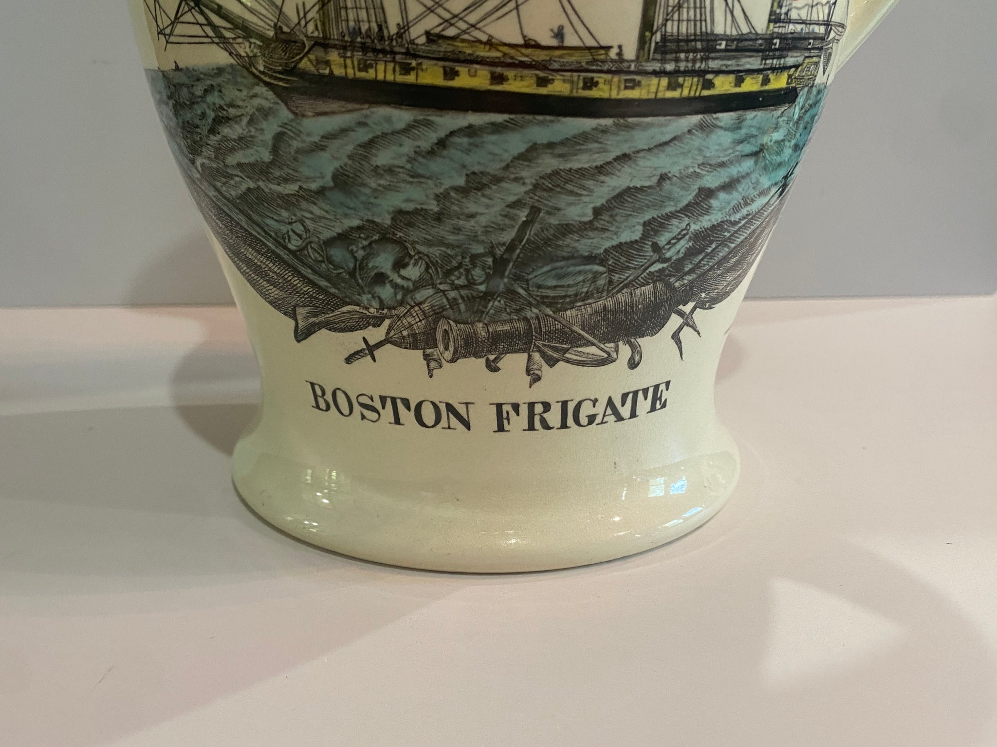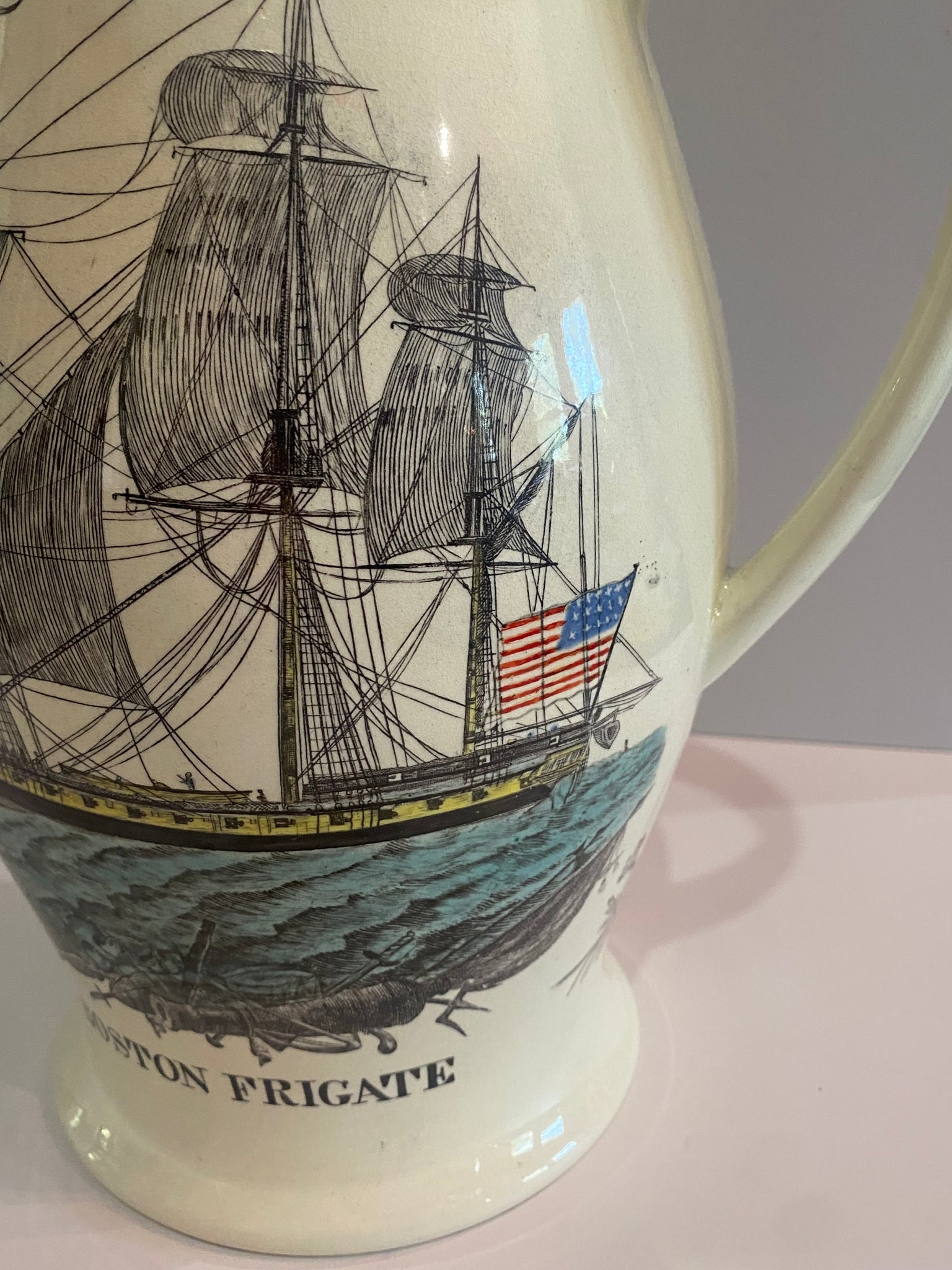 Staffordshire Creamware Liverpool Pitcher Boston Frigate Polychrome Ship Building Scene