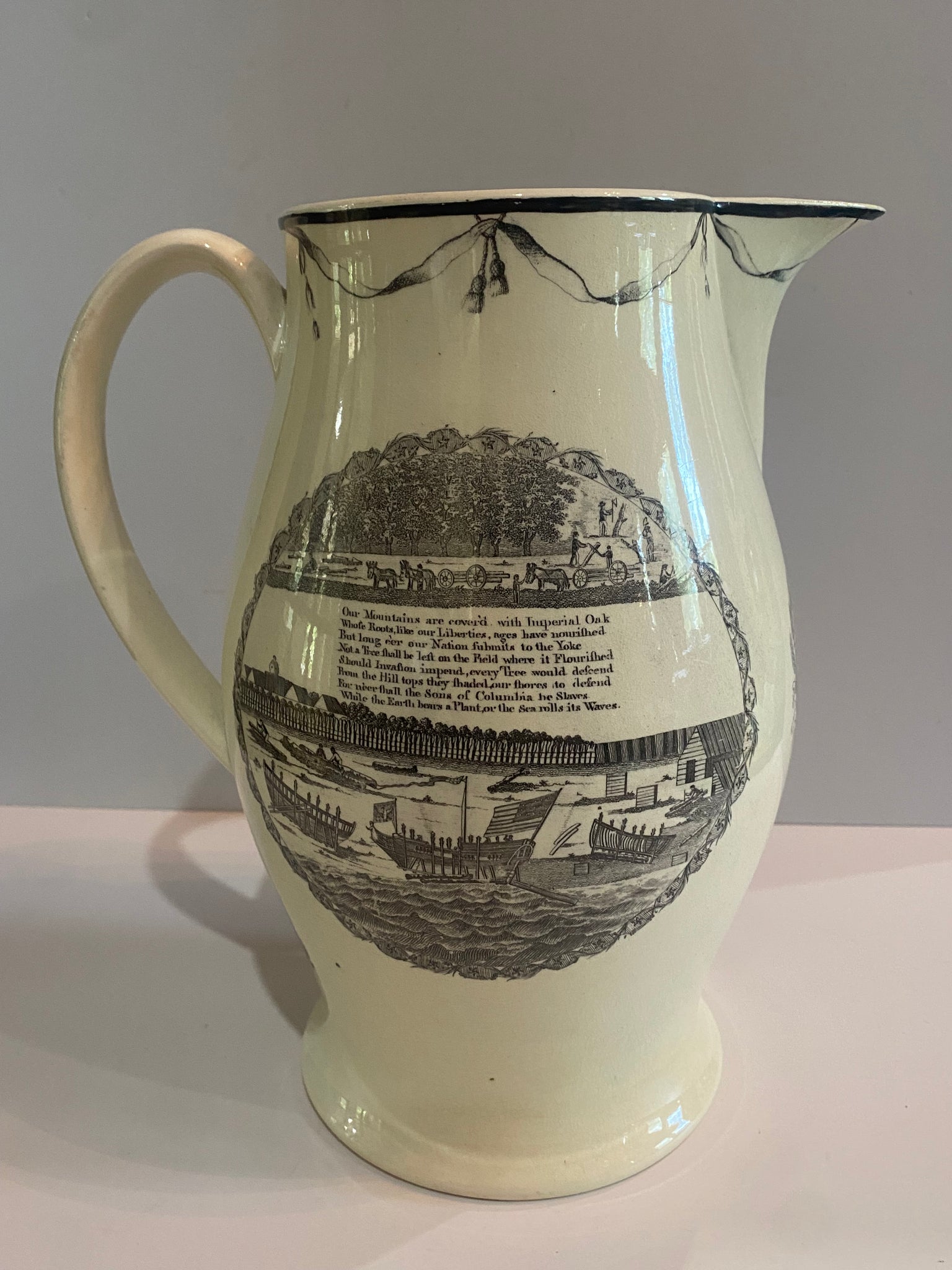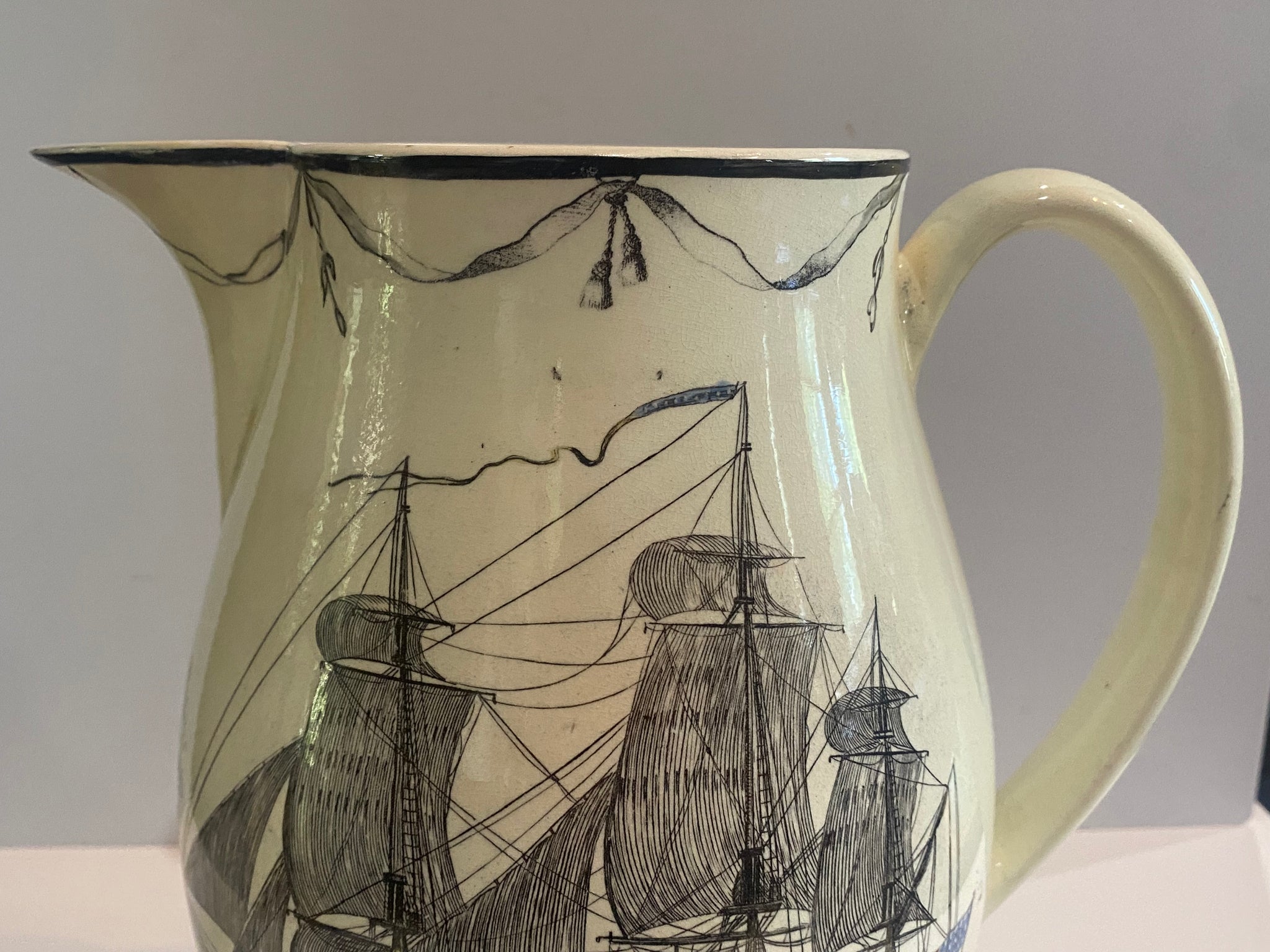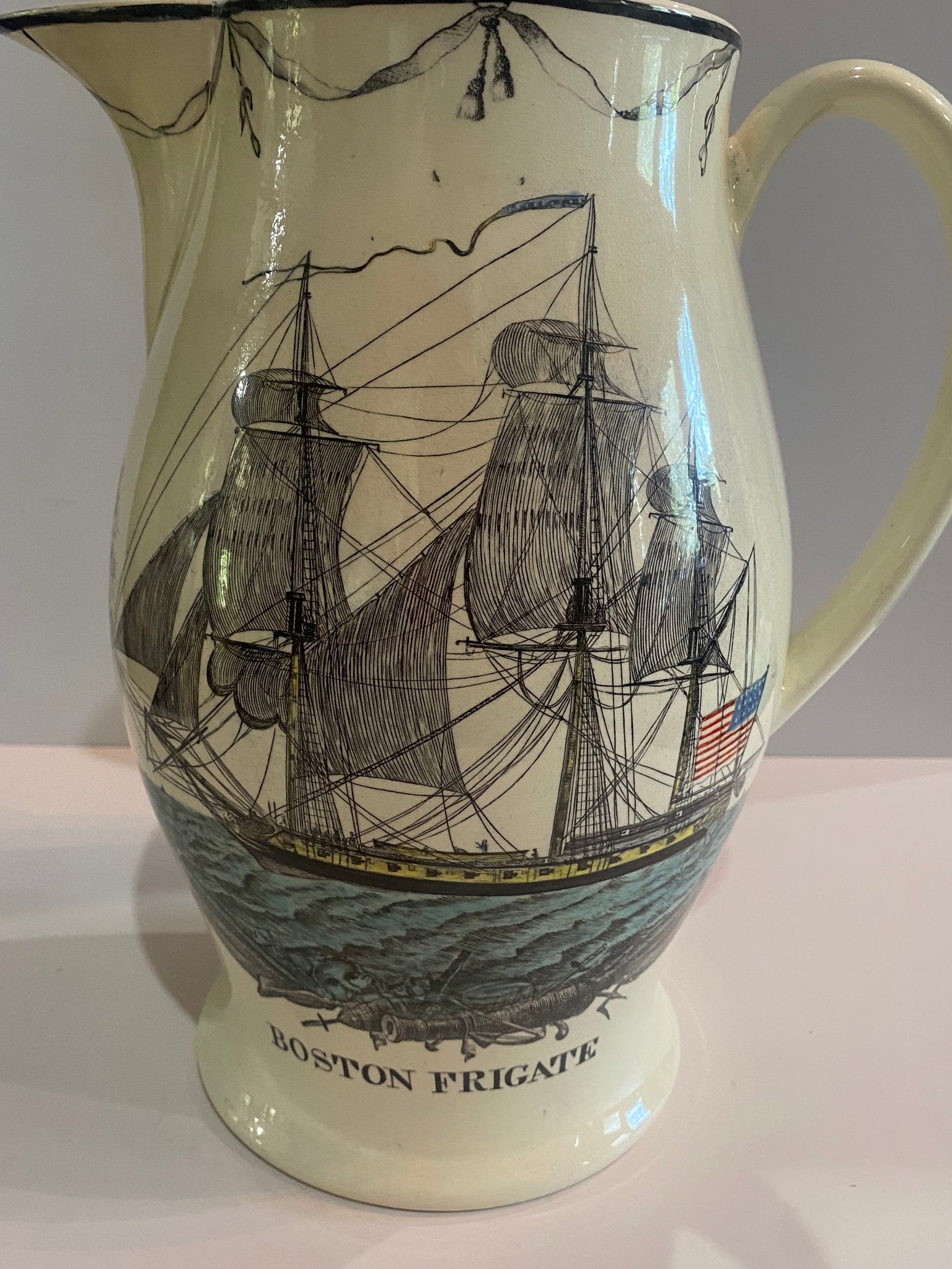 Staffordshire Creamware Liverpool Pitcher Boston Frigate Polychrome Ship Building Scene