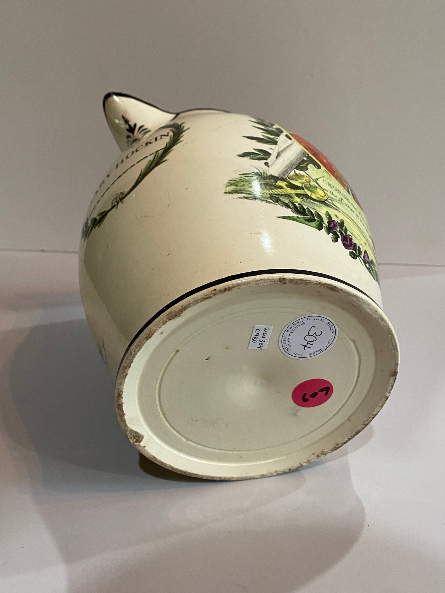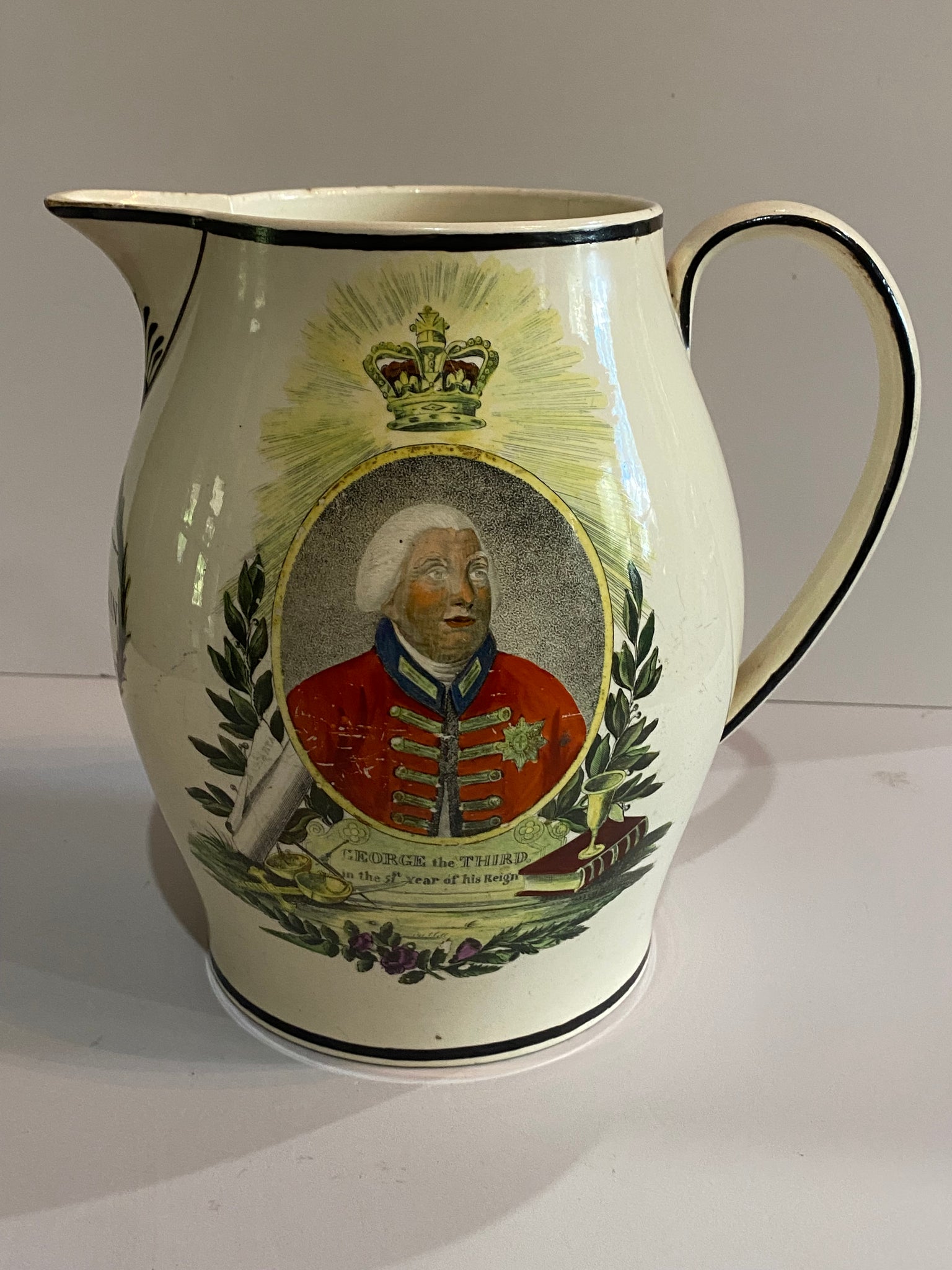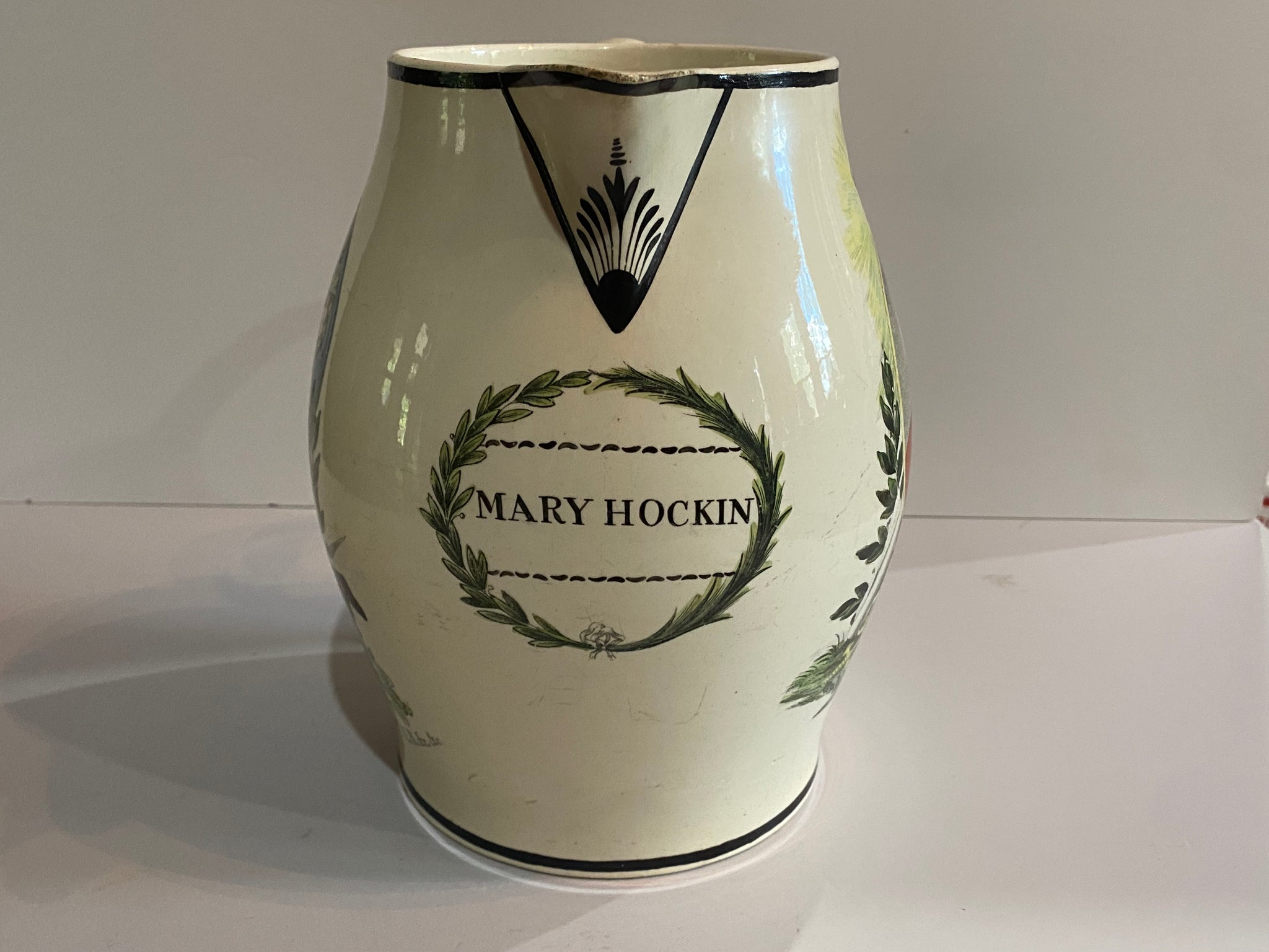 Staffordshire creamware Liverpool pitcher with polychrome transfers of the Duke of Wellington and George the Third. Shows original owners name Mary Hockin” in a nice colored cartouche. Very minor chip repair on rim and spout repair. It measures 7 3/4” tall and dates circa 1800. I can’t recall seeing one of these in color and believe it’s quite scarce.