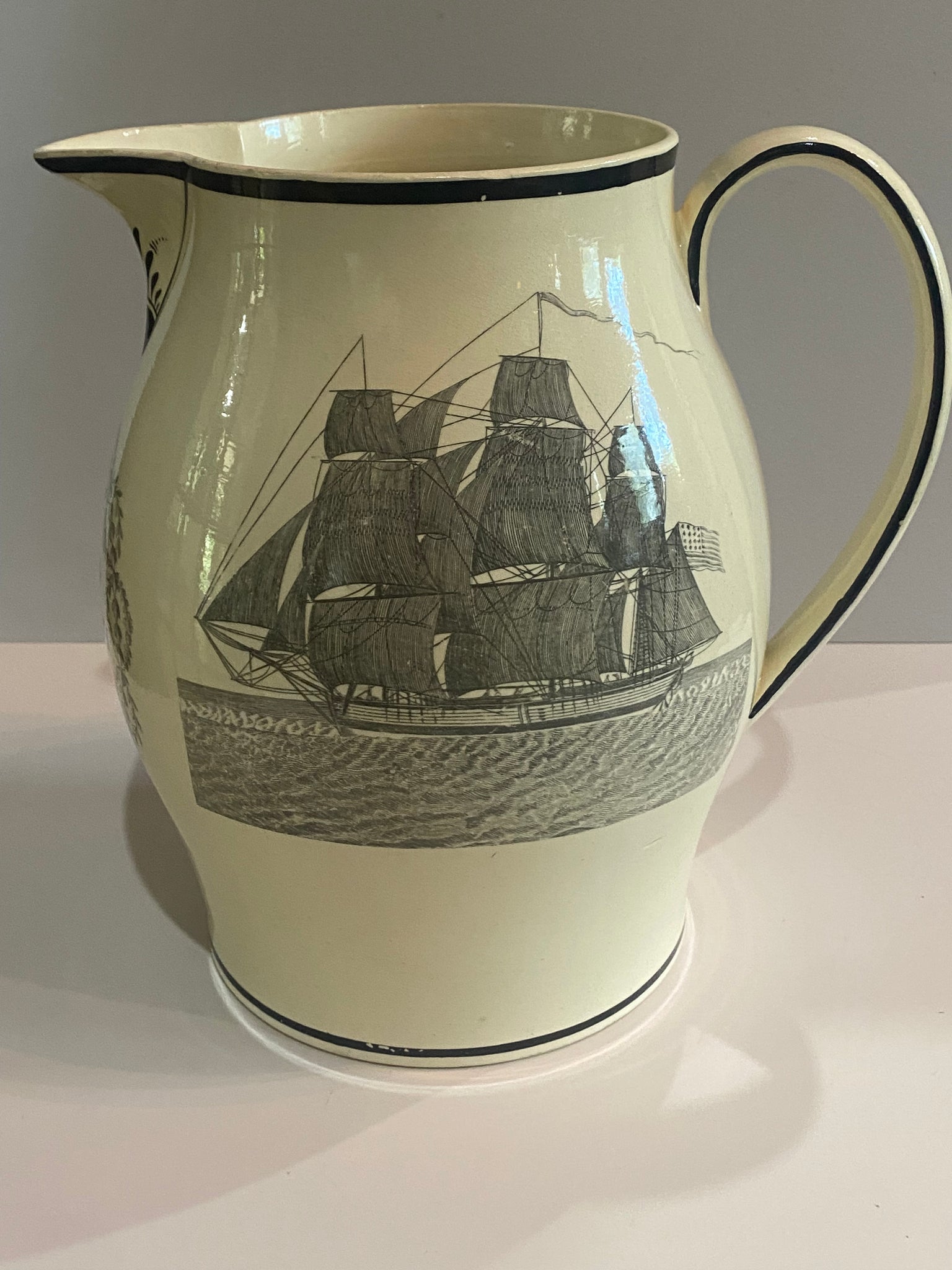 Staffordshire Creamware Liverpool pitcher with American Ship and Washington with chain of states transfer. Also shows the original owners names under the spout in a cartouche. It measures 9 3/4” from the spout to the handle by 9 3/4” tall and dates circa 1800. In good condition with a highly professional repair to the handle and base.