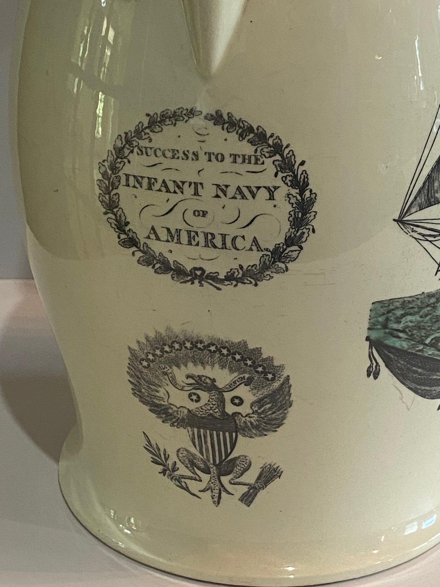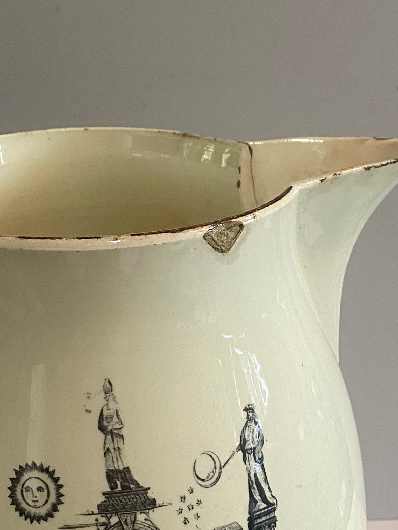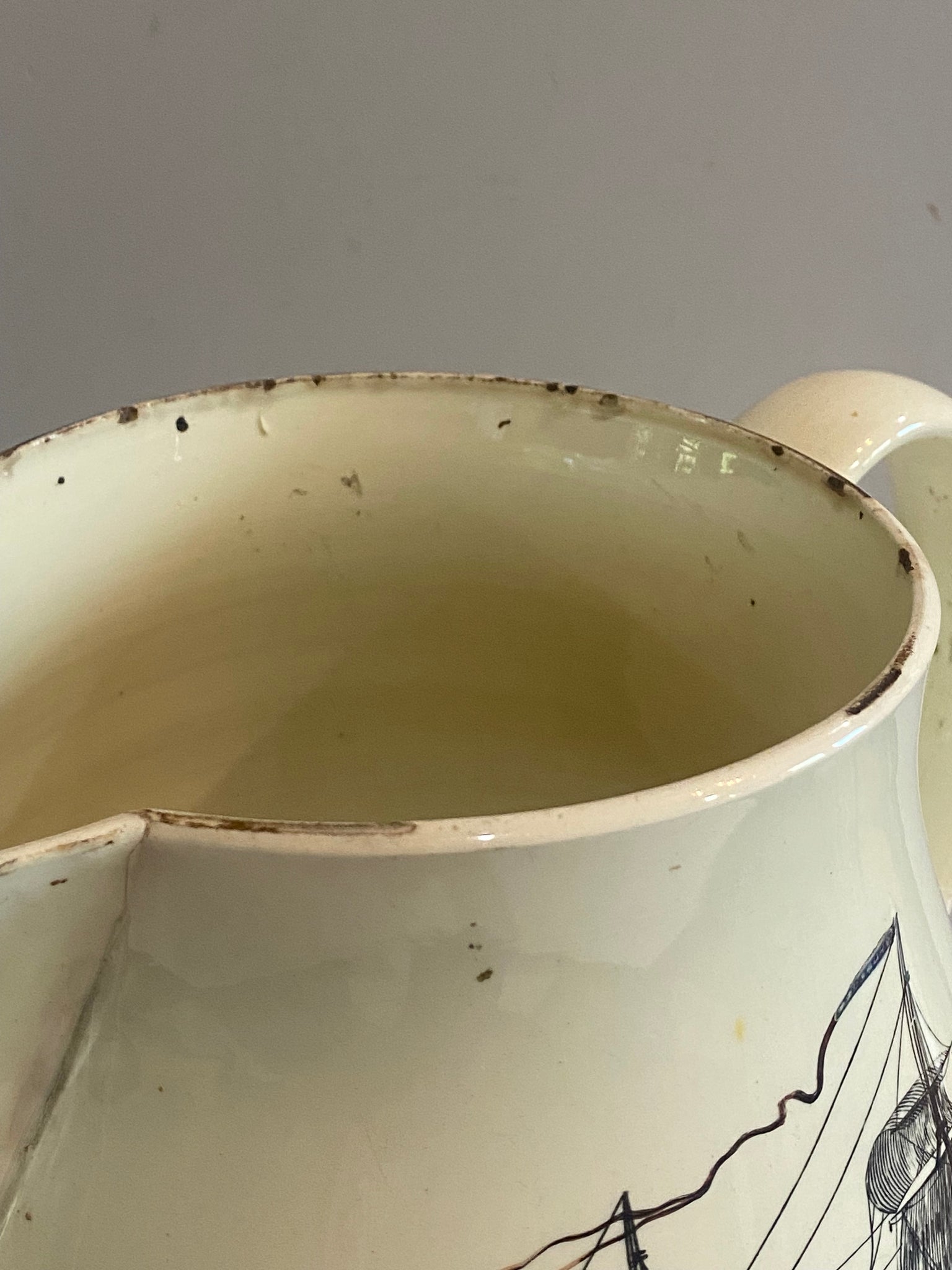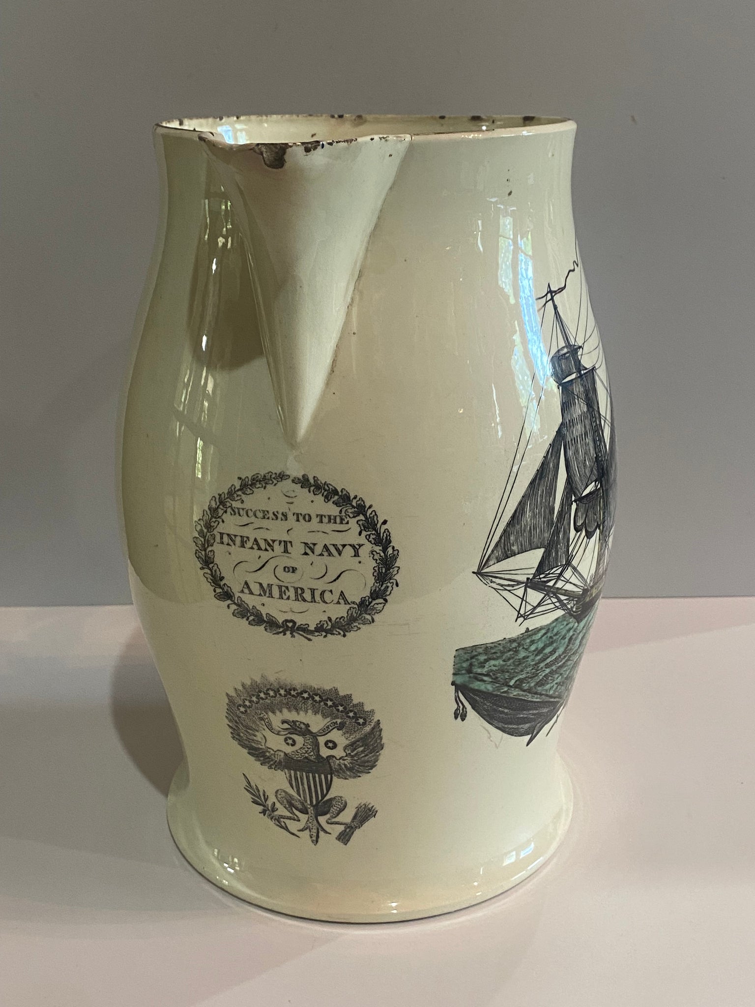 Large Staffordshire Creamware Liverpool pitcher with Polychrome American Ship and on reverse with a Masonic transfer. Under the spout shows an Eagle and Shield and above “Success to the Infant Navy Of America” in a cartouche. In good condition with no cracks or repairs. Shows several chips on the top rim and minute nibbles on the inner rim. It measures 11 1/8” tall by 10 7/8” from the tip of the spout to the handle and dates circa 1800.