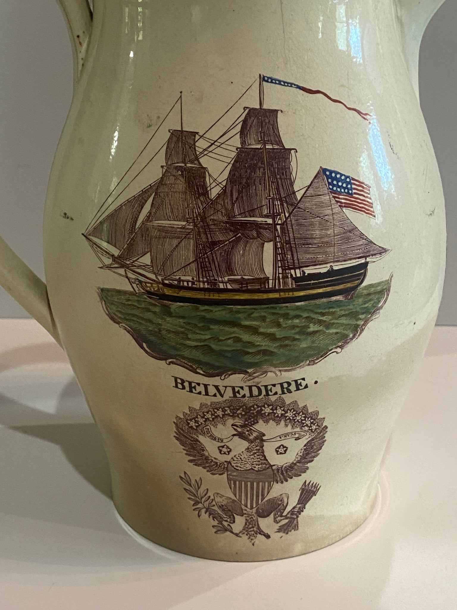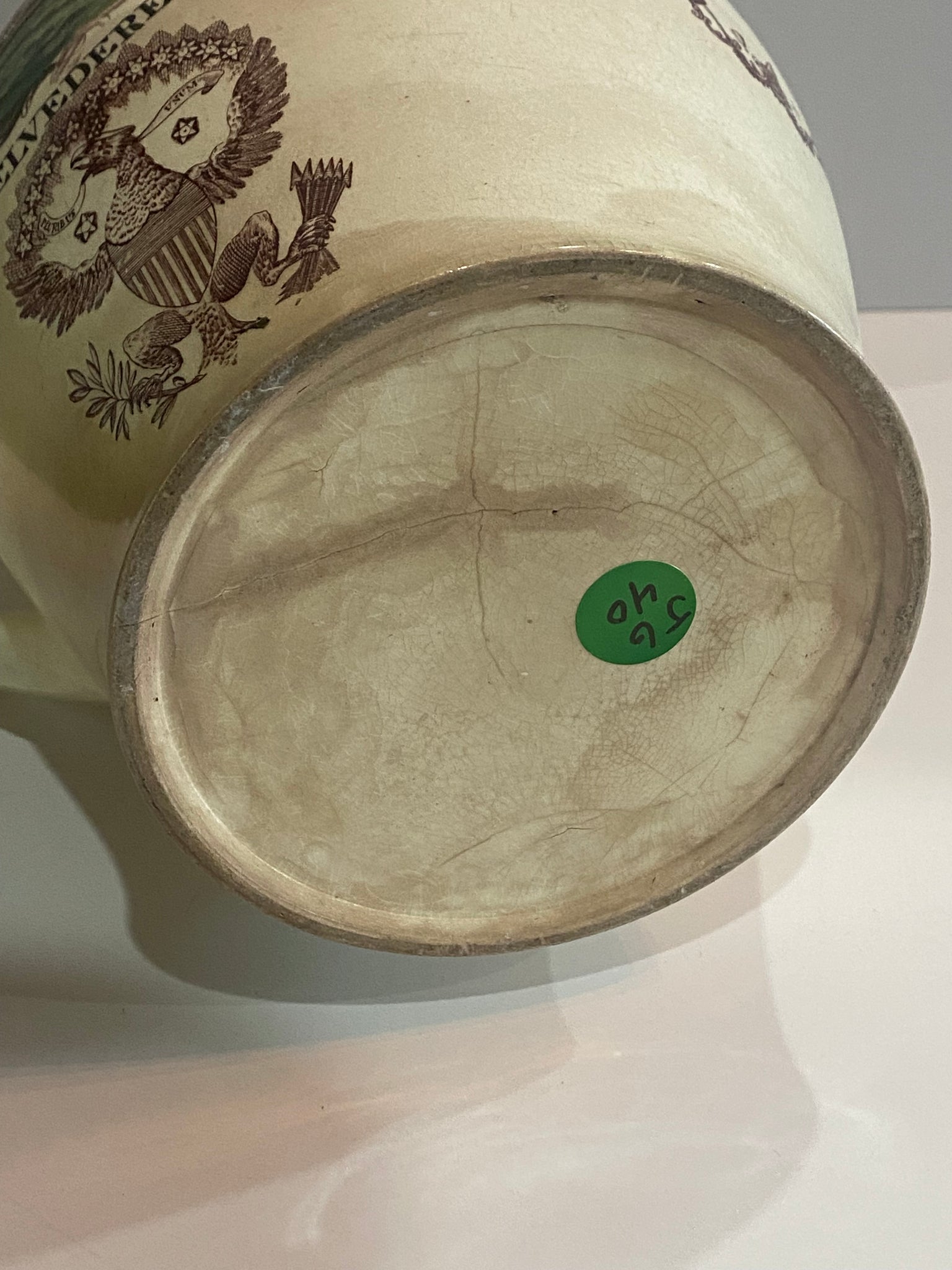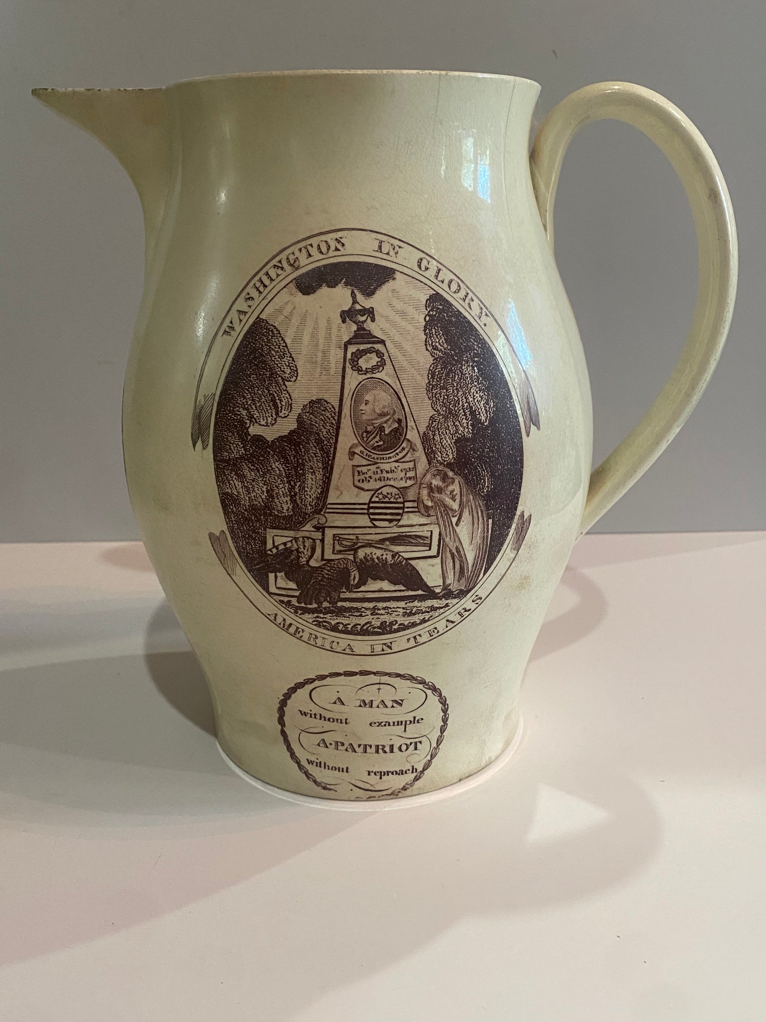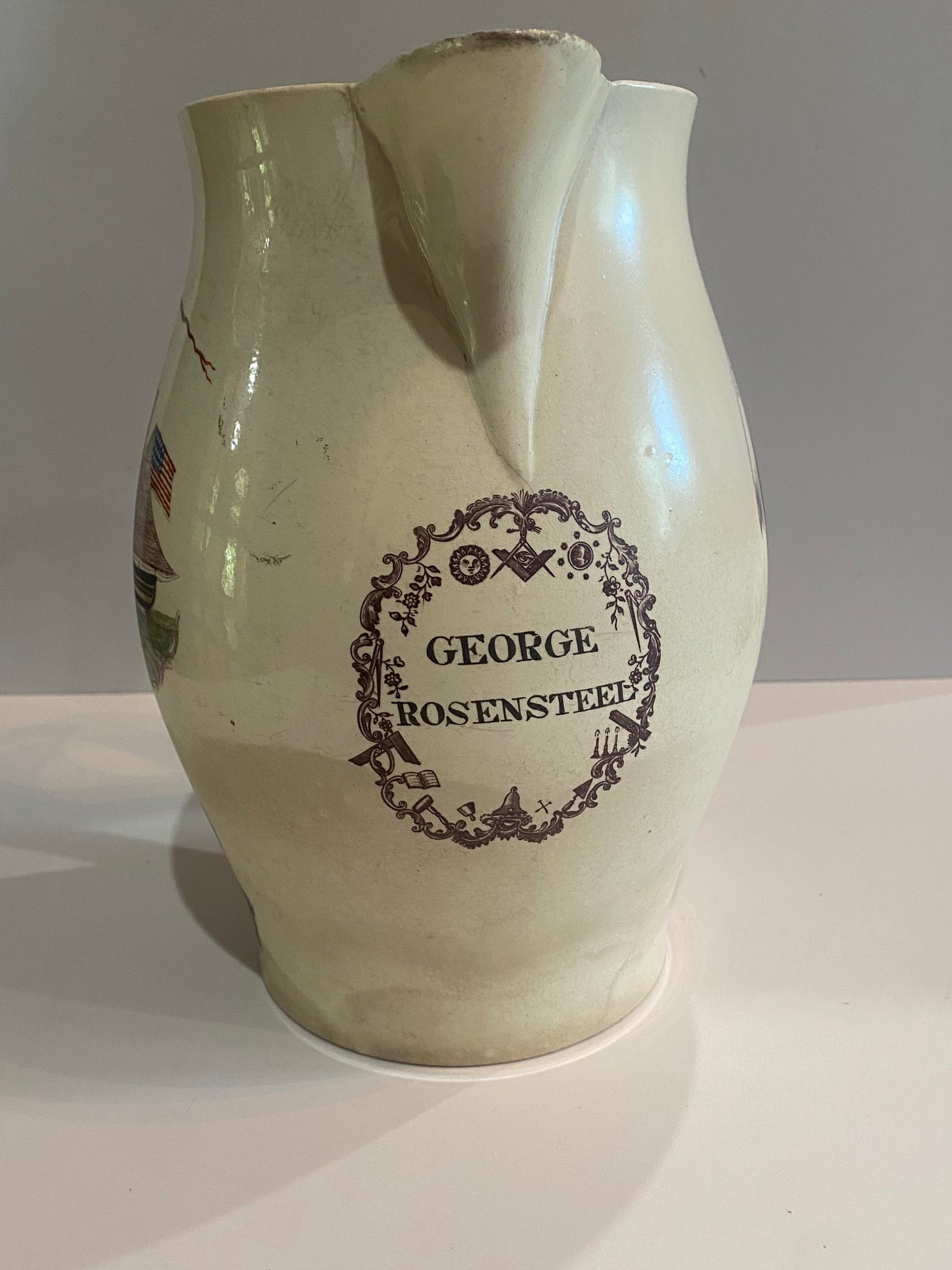 Staffordshire Creamware Liverpool Pitcher with Polychrome Ship “Belvedere” with Seal of the United States below. On the reverse “Washington In Glory, America in Tears” with “A man without example. A Patriot without reproach” in a cartouche. Original owners name “George Rosensteel” in a cartouche under the spout. So many transfers in on this one is uncommon and also the rust color transfers. Displays well with some older spout and rim repairs along with some hairlines. Base also shows some staining and lines. Certainly would be really nice freshened up or could be enjoyed the way it is. It measures 9 1/2” tall by 9 1/2” from the tip of the spout to the handle and it dates circa 1800.