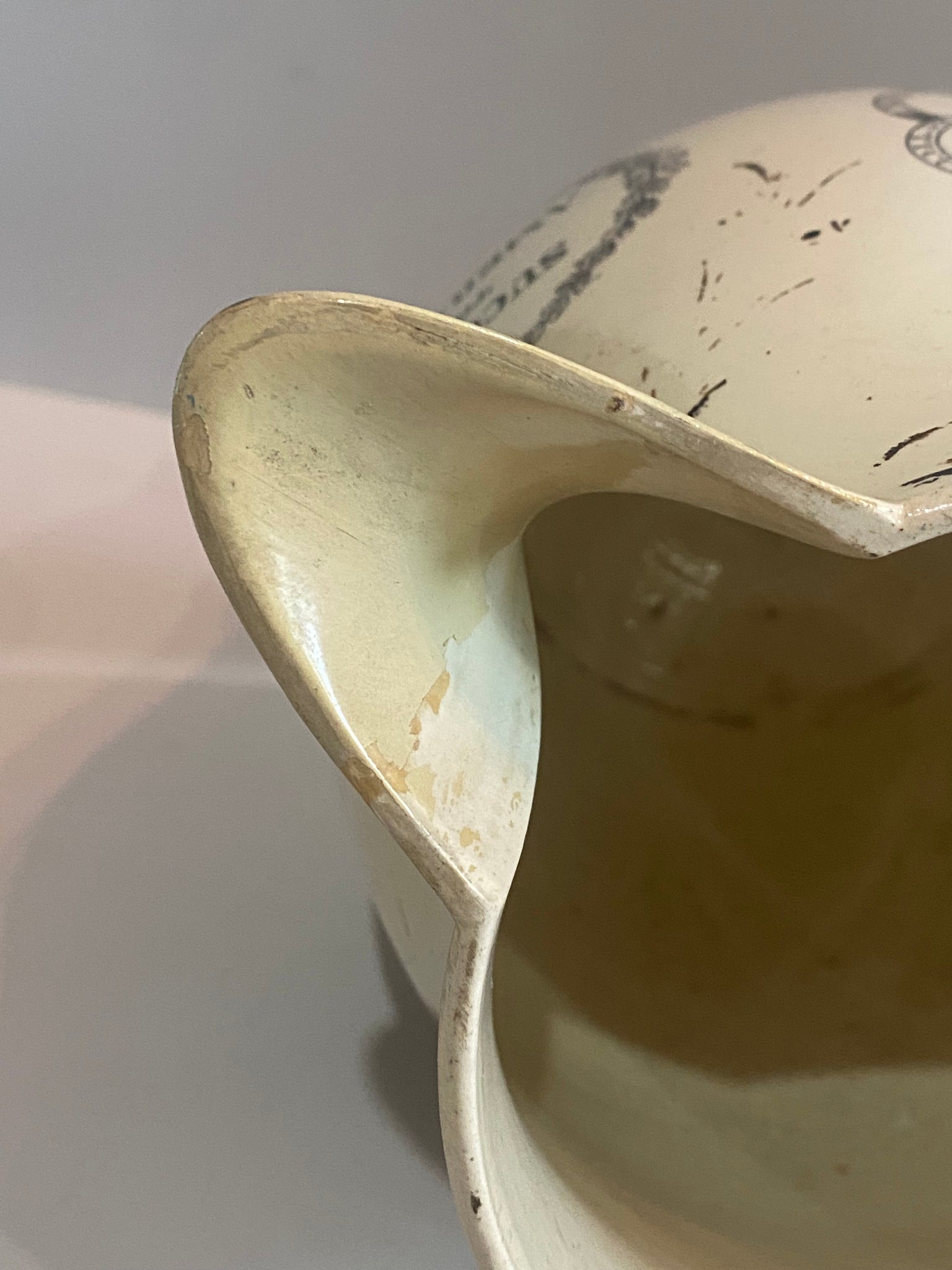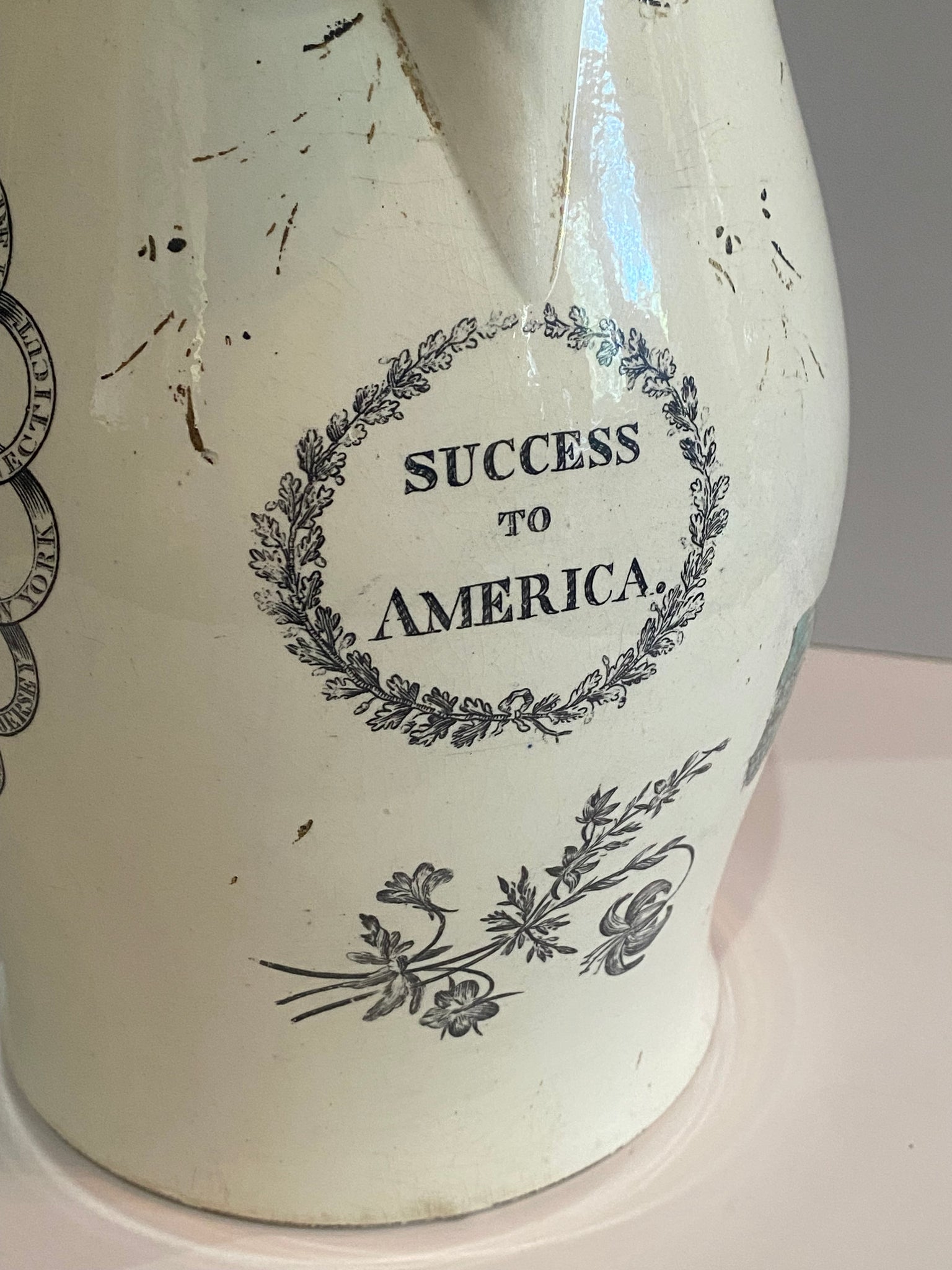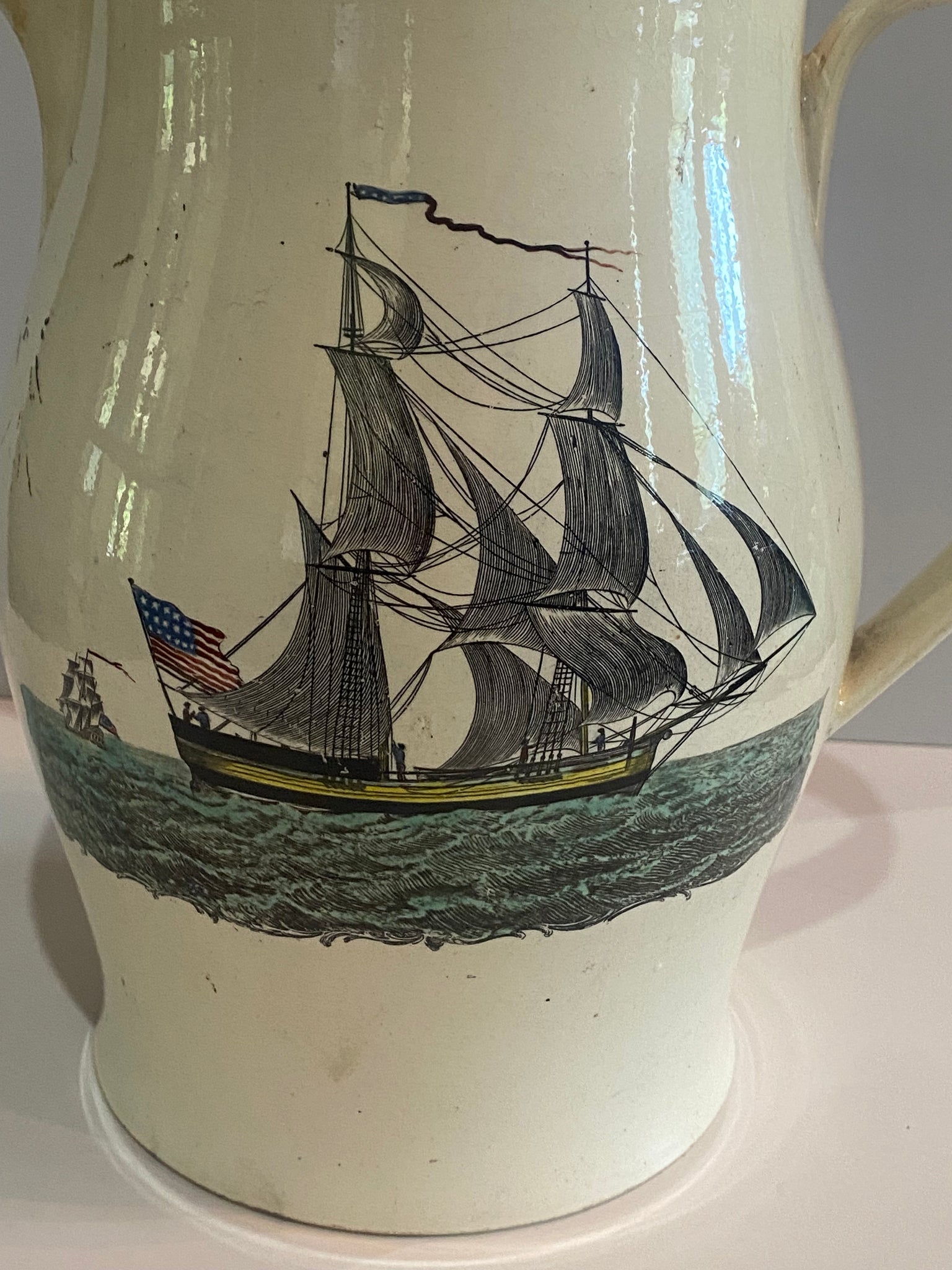 Staffordshire Creamware Liverpool Pitcher with Seal of United States with Chain of States and a Polychrome American Ship on the reverse. Under the spout “Success to America” in a cartouche. Displays good with an older spout tip repair that could be freshened up or could be left the way it is. It measures 9 1/8” tall by 9 5/8” from the tip of the spout to the handle and dates circa 1800.