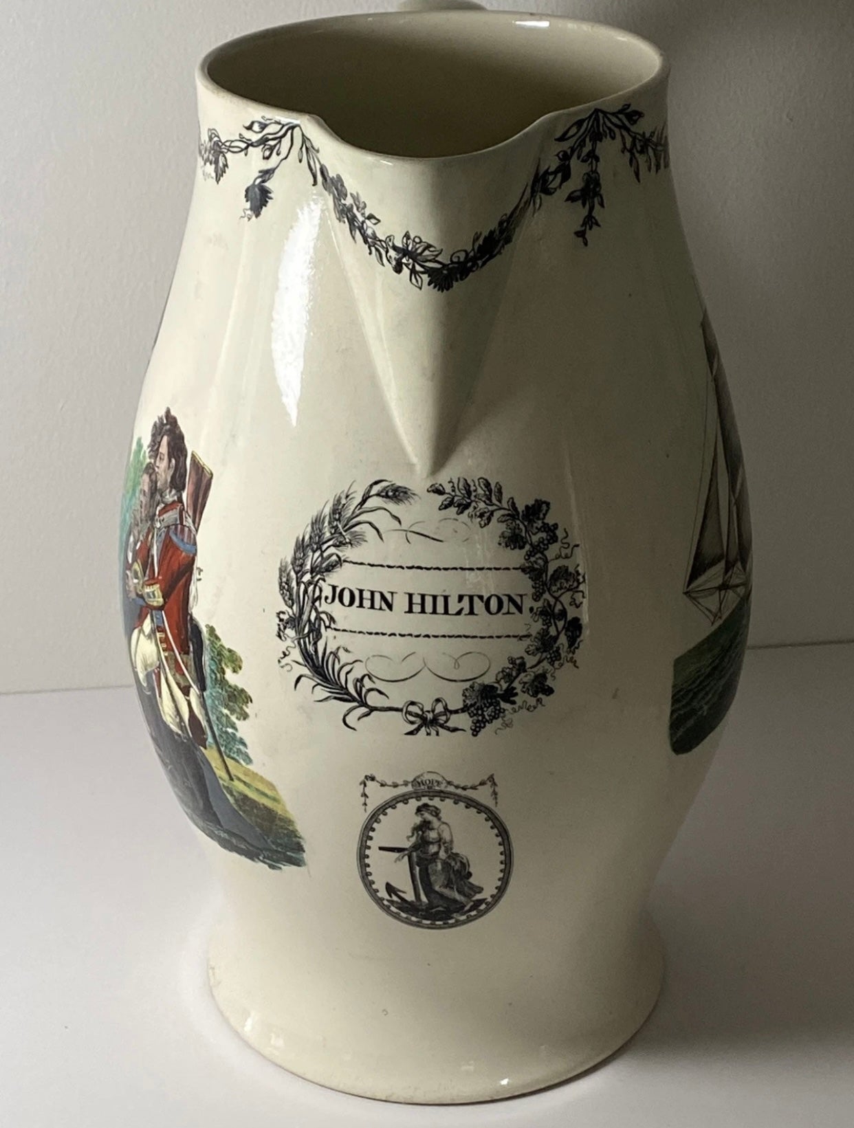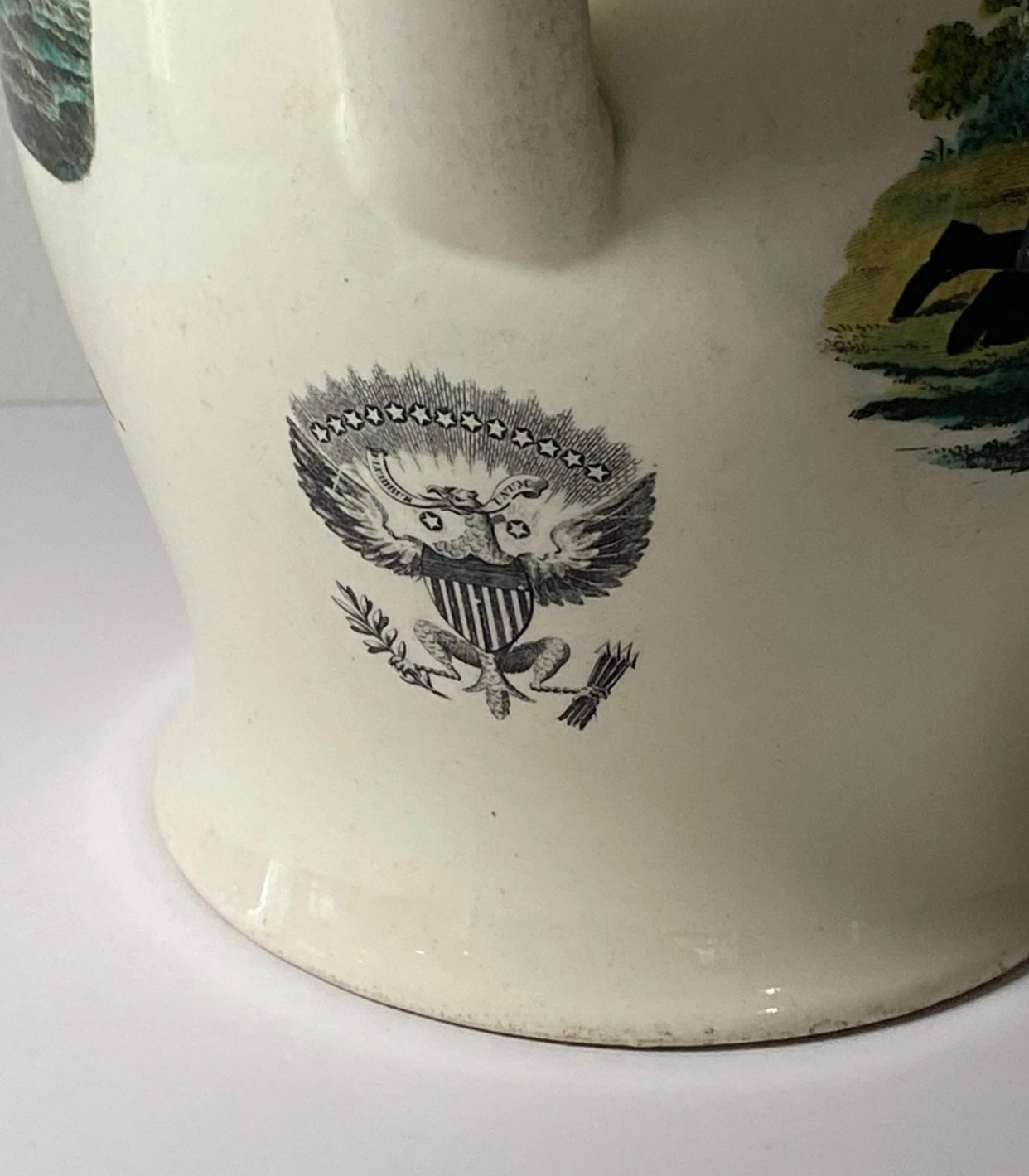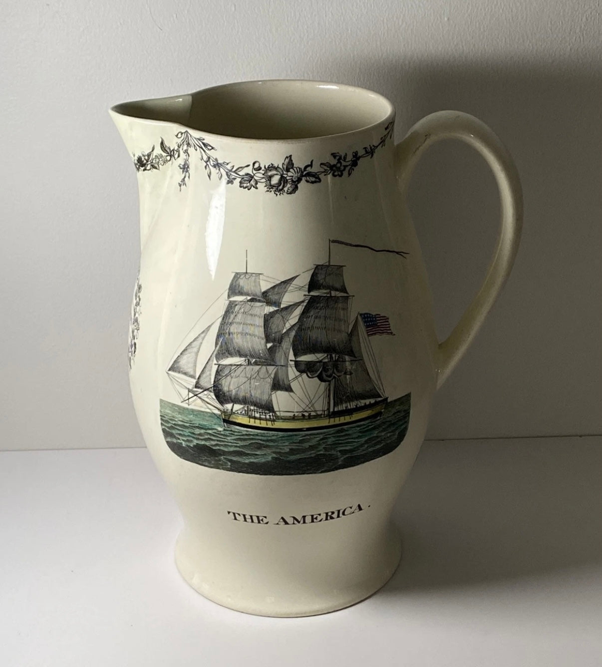 Staffordshire creamware Liverpool pitcher with polychrome transfers of the Death of Wolfe and The Ship America. Also has small eagle and shield under the handle and the original owners name with a sailor transfer under the spout. Very uncommon and scarce to find the Death of Wolfe transfer in color. It displays as perfect with a professional repair to the spout and the handle. Otherwise excellent. Very large piece measuring 11 3/4” tall by 9 1/4” from the tip of the spout to the handle.