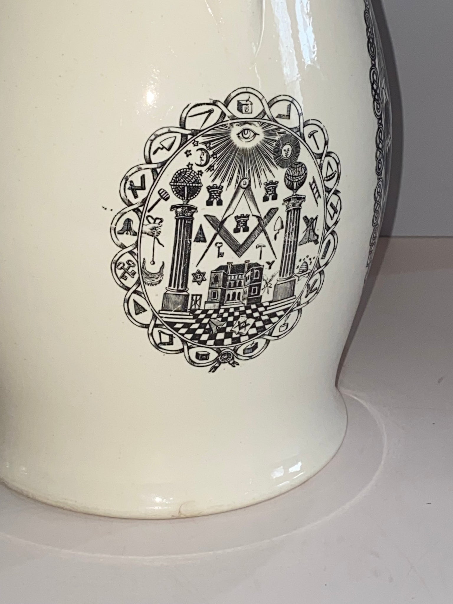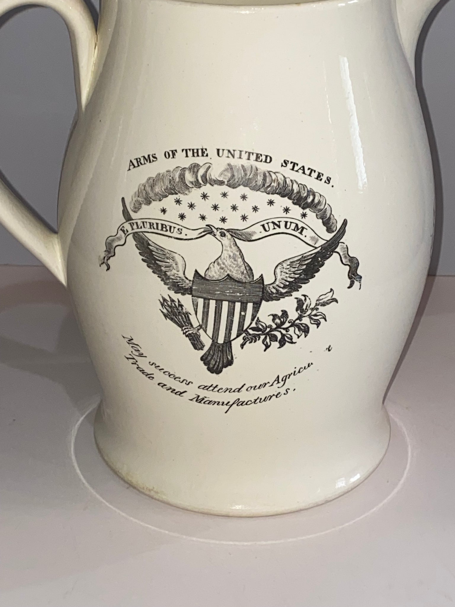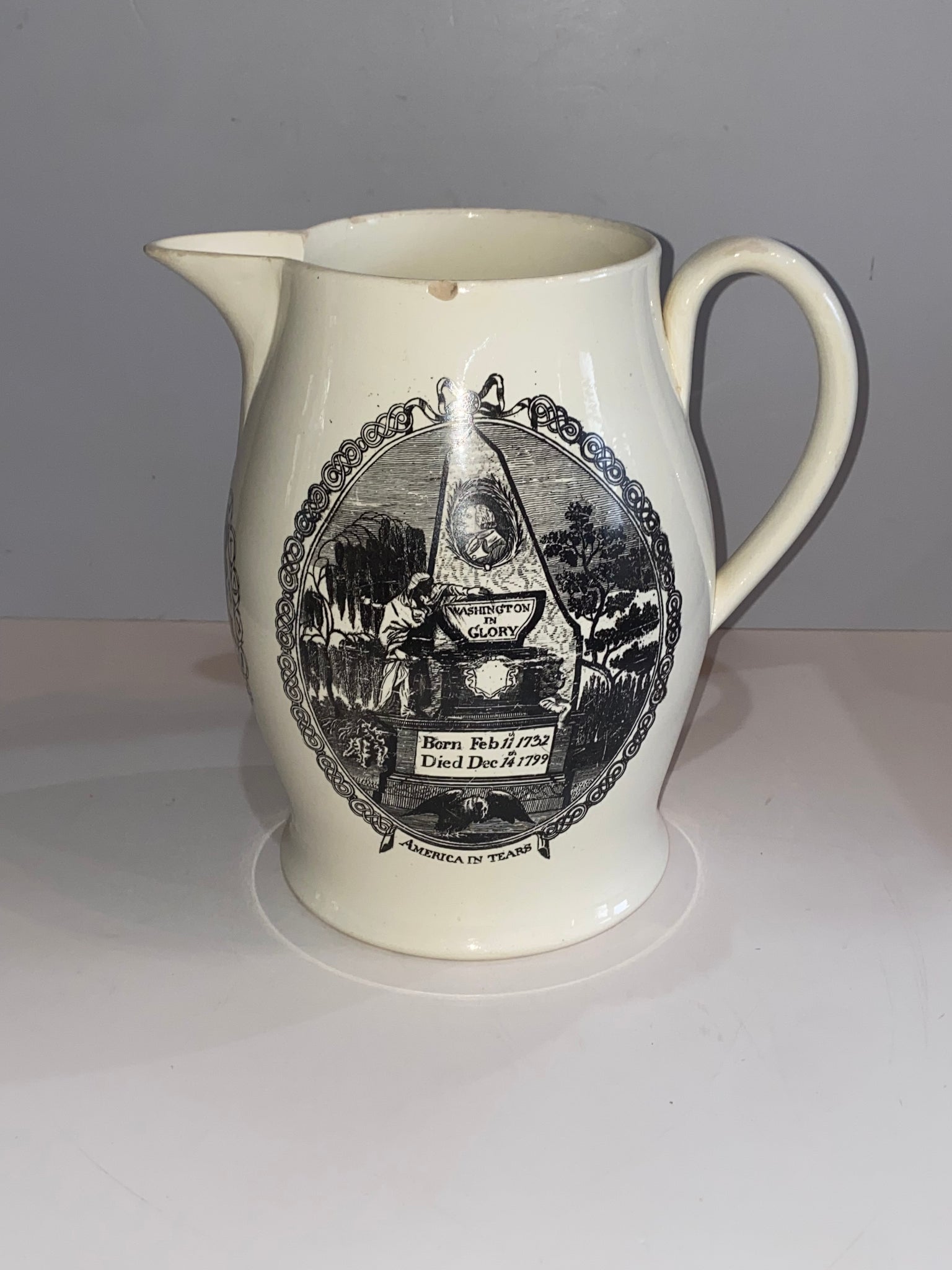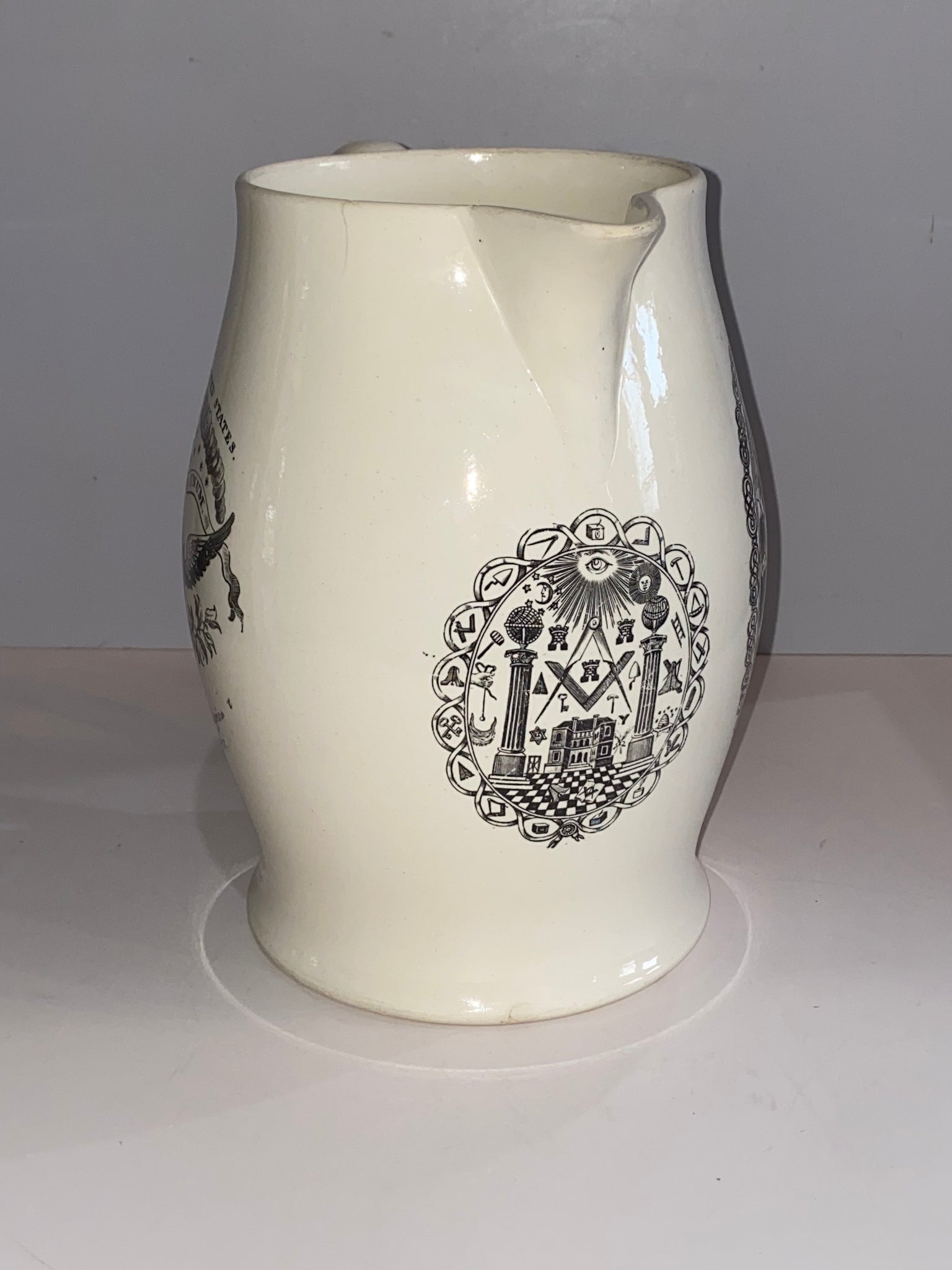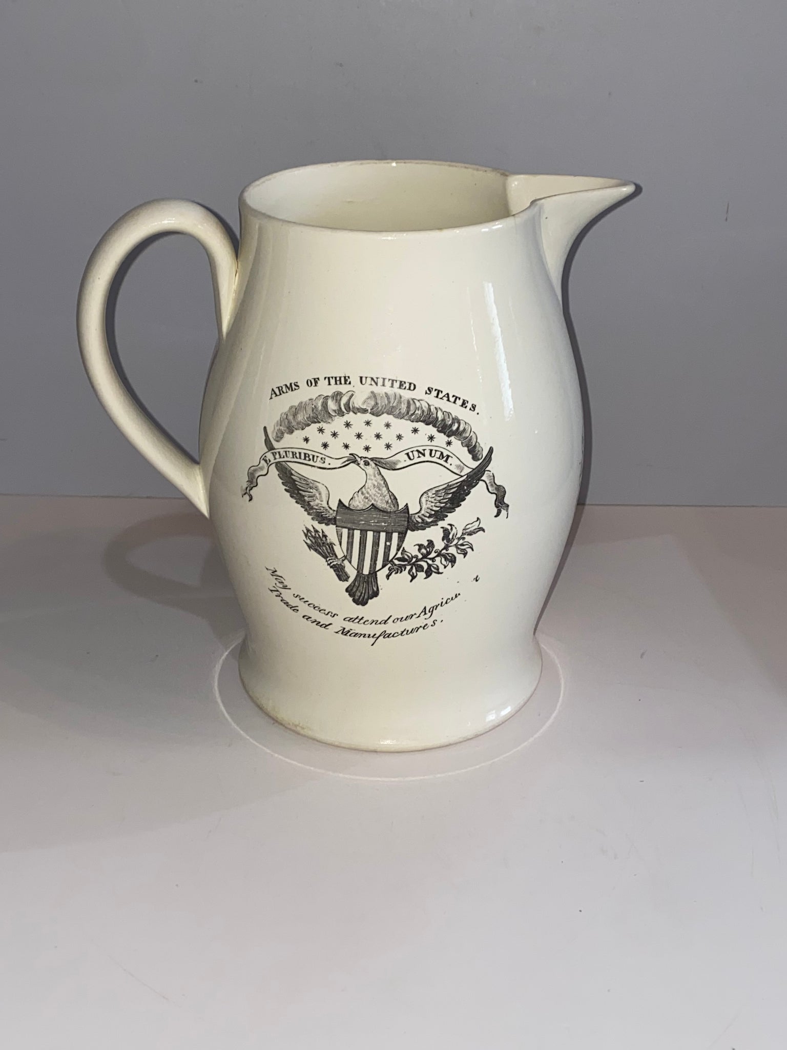 Staffordshire creamware Liverpool pitcher with Arms of United States and America In Tears - Washington in Glory transfers with Masonic transfer under the spout. In very good condition with a very tiny chip and short hairline on the top rim. The spout has some minor wear. Otherwise quite nice with no repairs. It measures 8 3/4” tall and dates circa 1800.