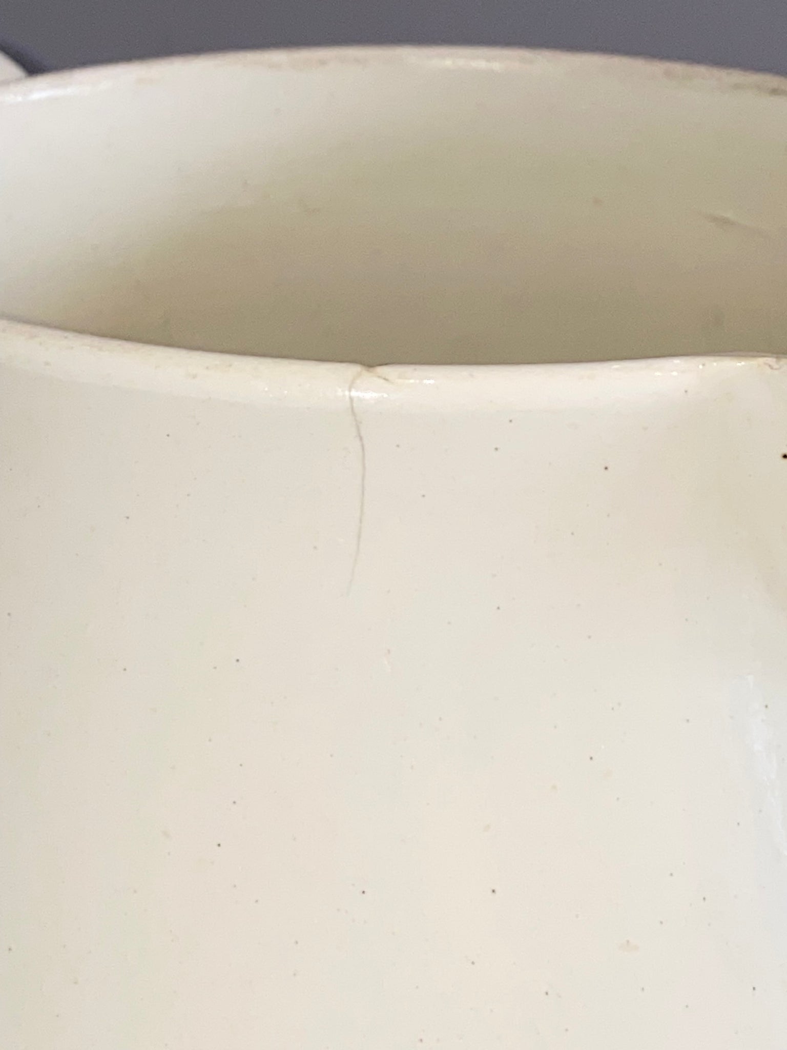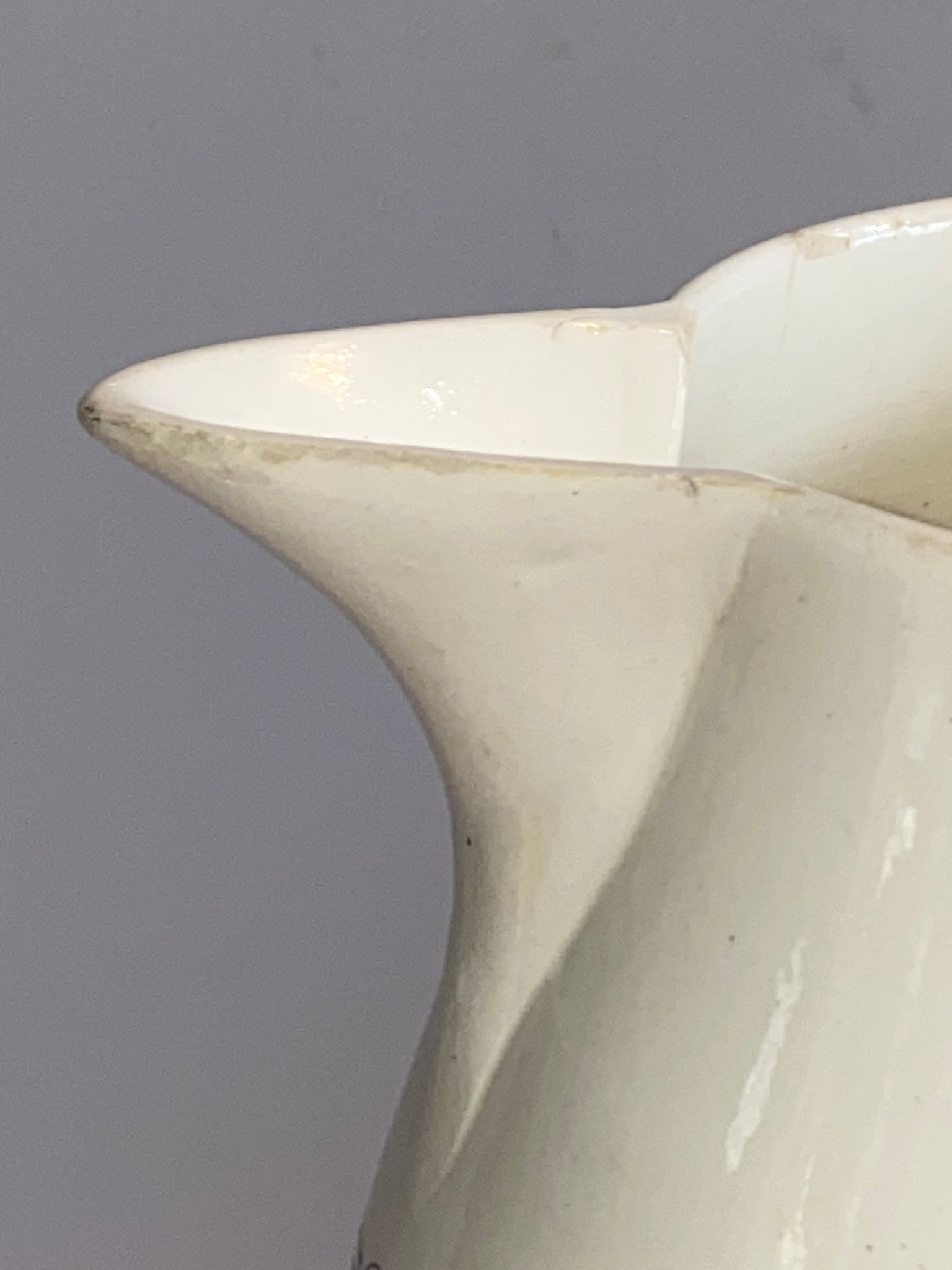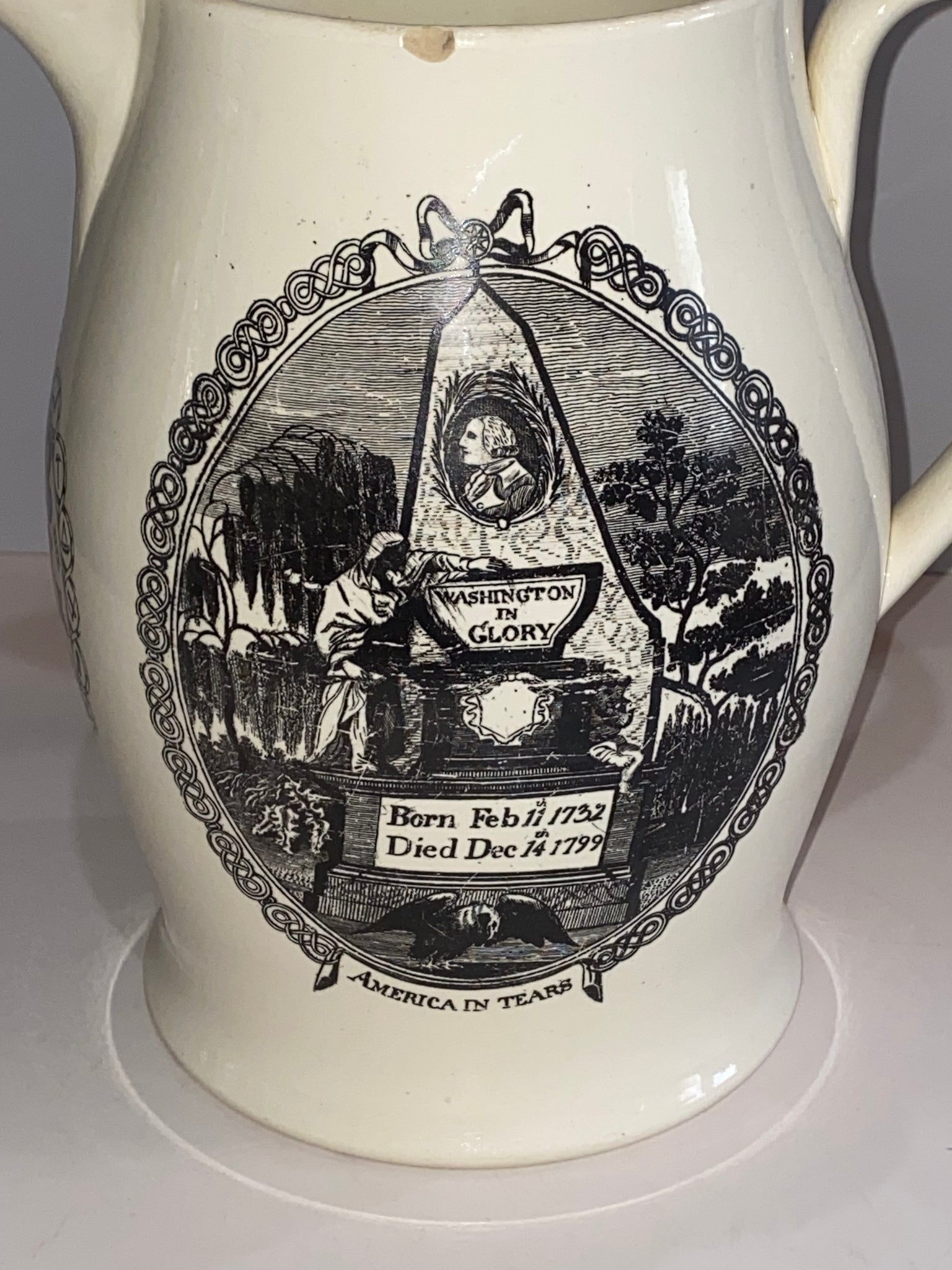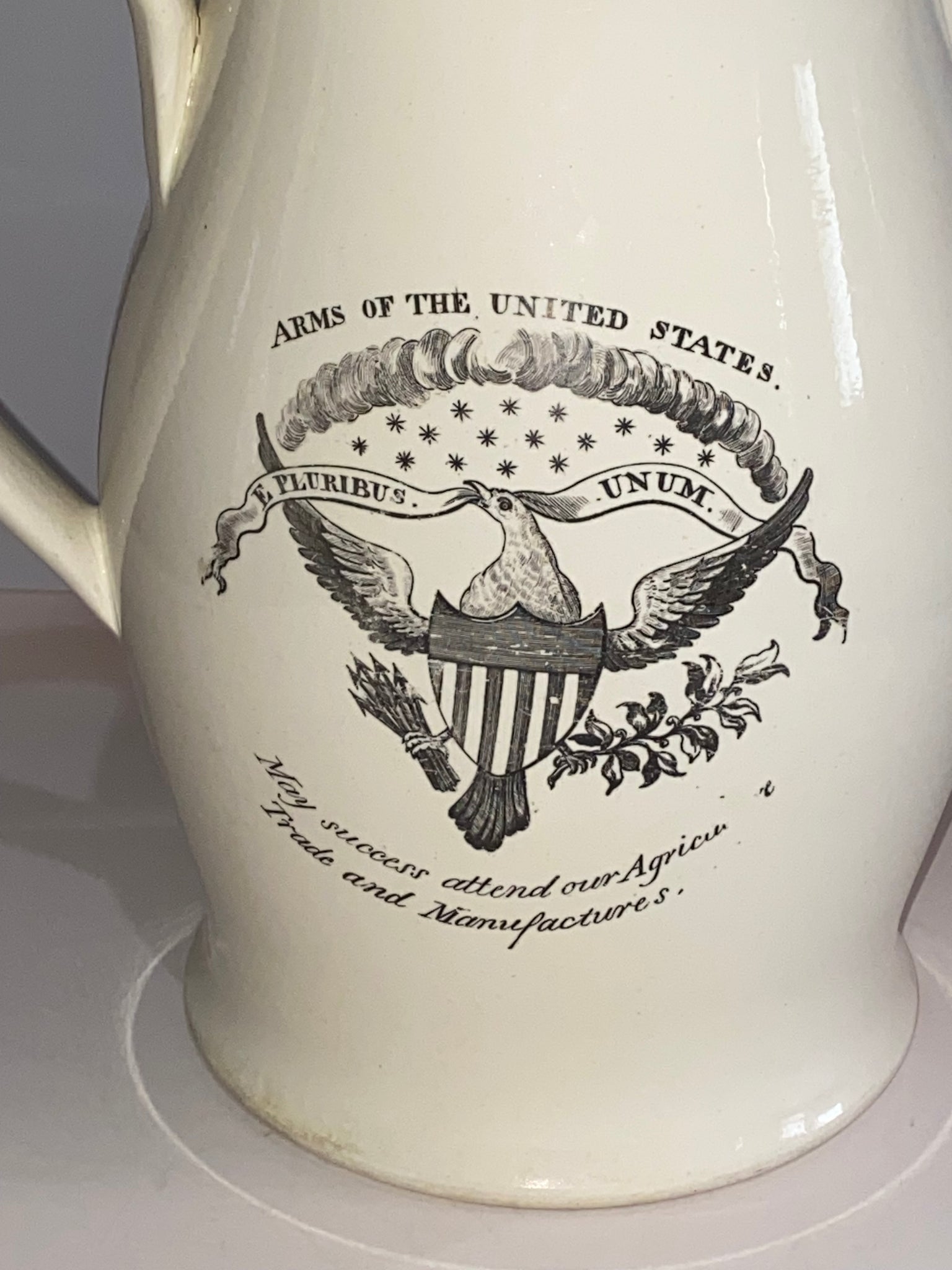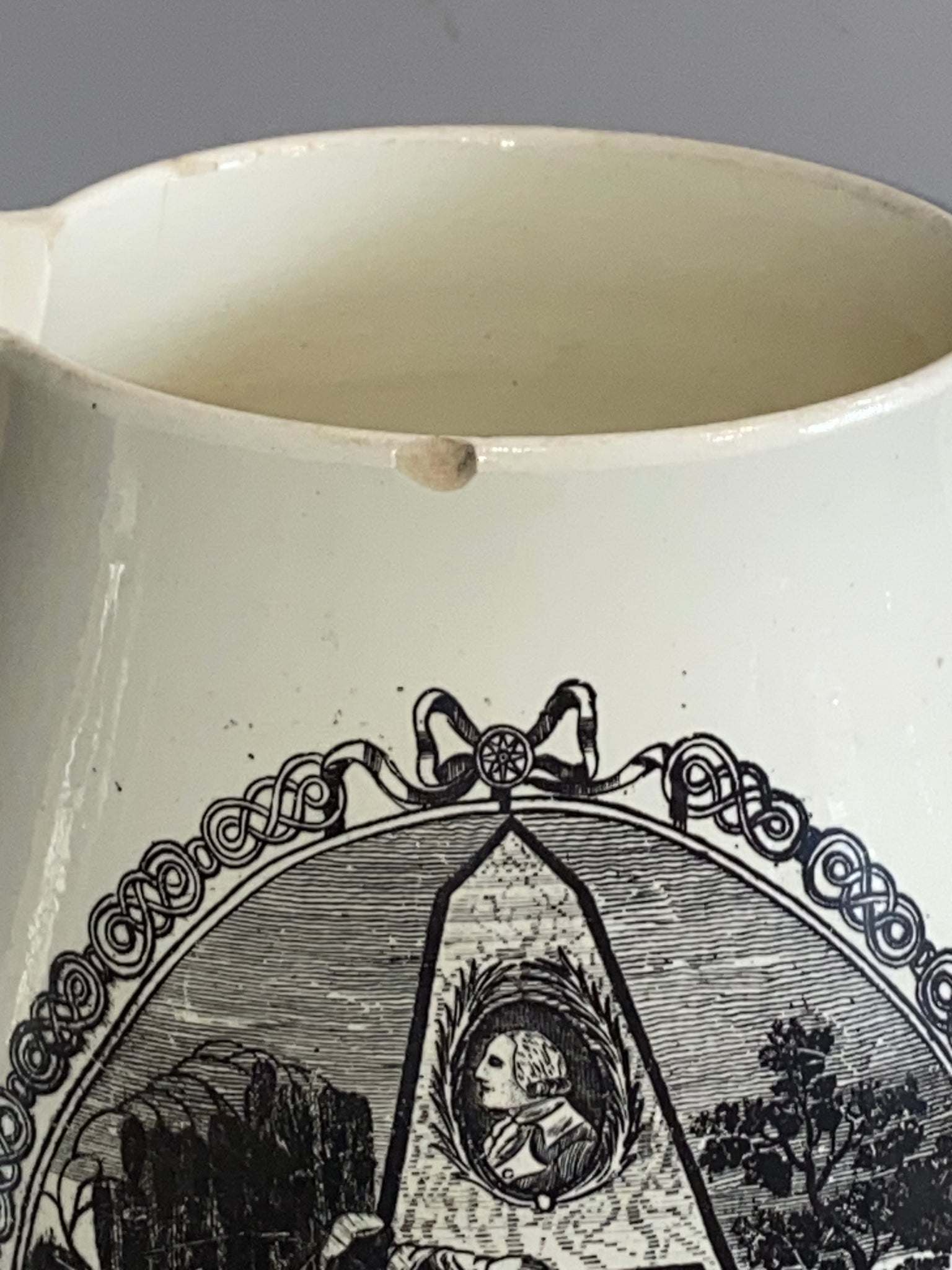 Staffordshire creamware Liverpool pitcher with Arms of United States and America In Tears - Washington in Glory transfers with Masonic transfer under the spout. In very good condition with a very tiny chip and short hairline on the top rim. The spout has some minor wear. Otherwise quite nice with no repairs. It measures 8 3/4” tall and dates circa 1800.