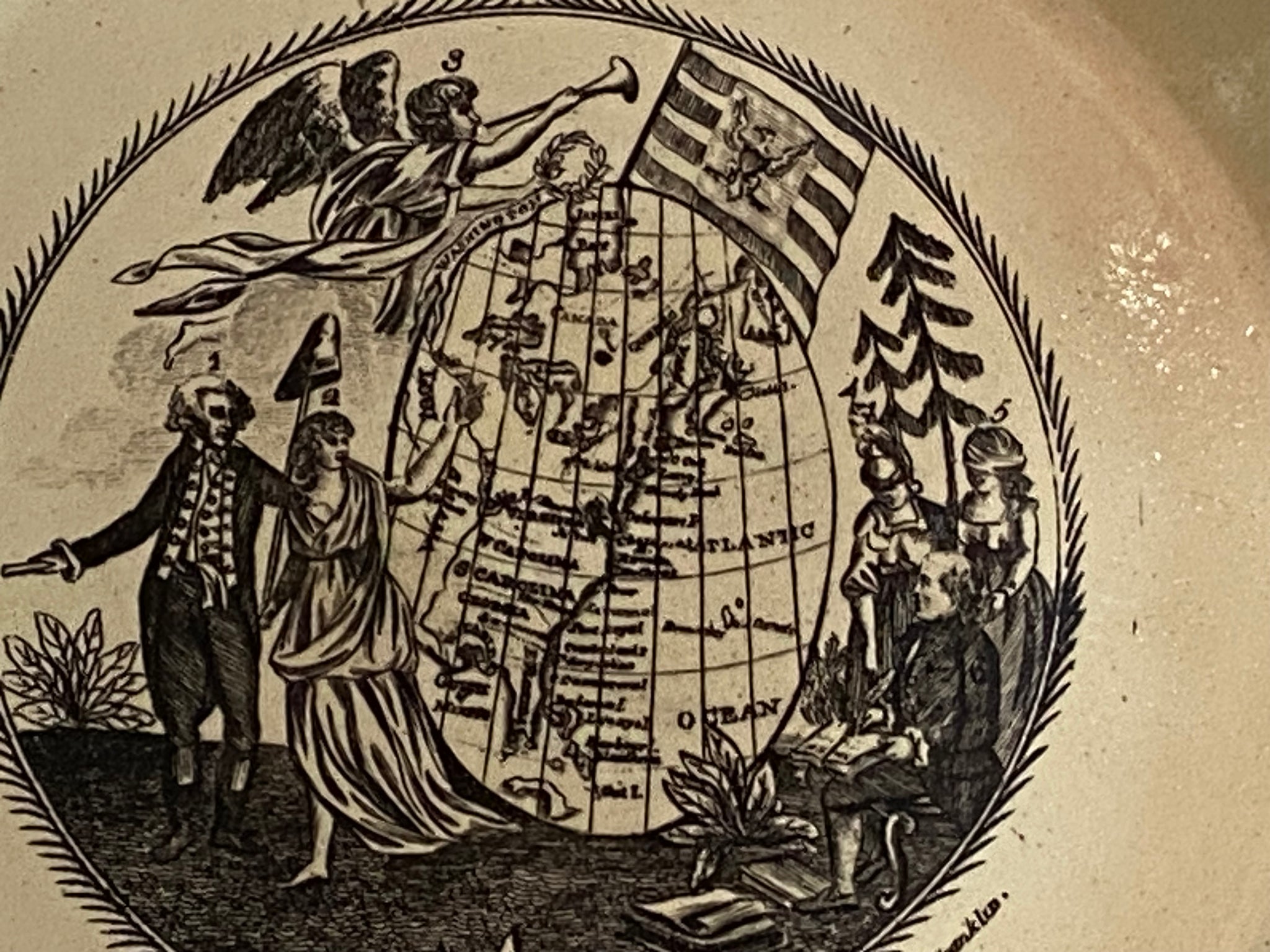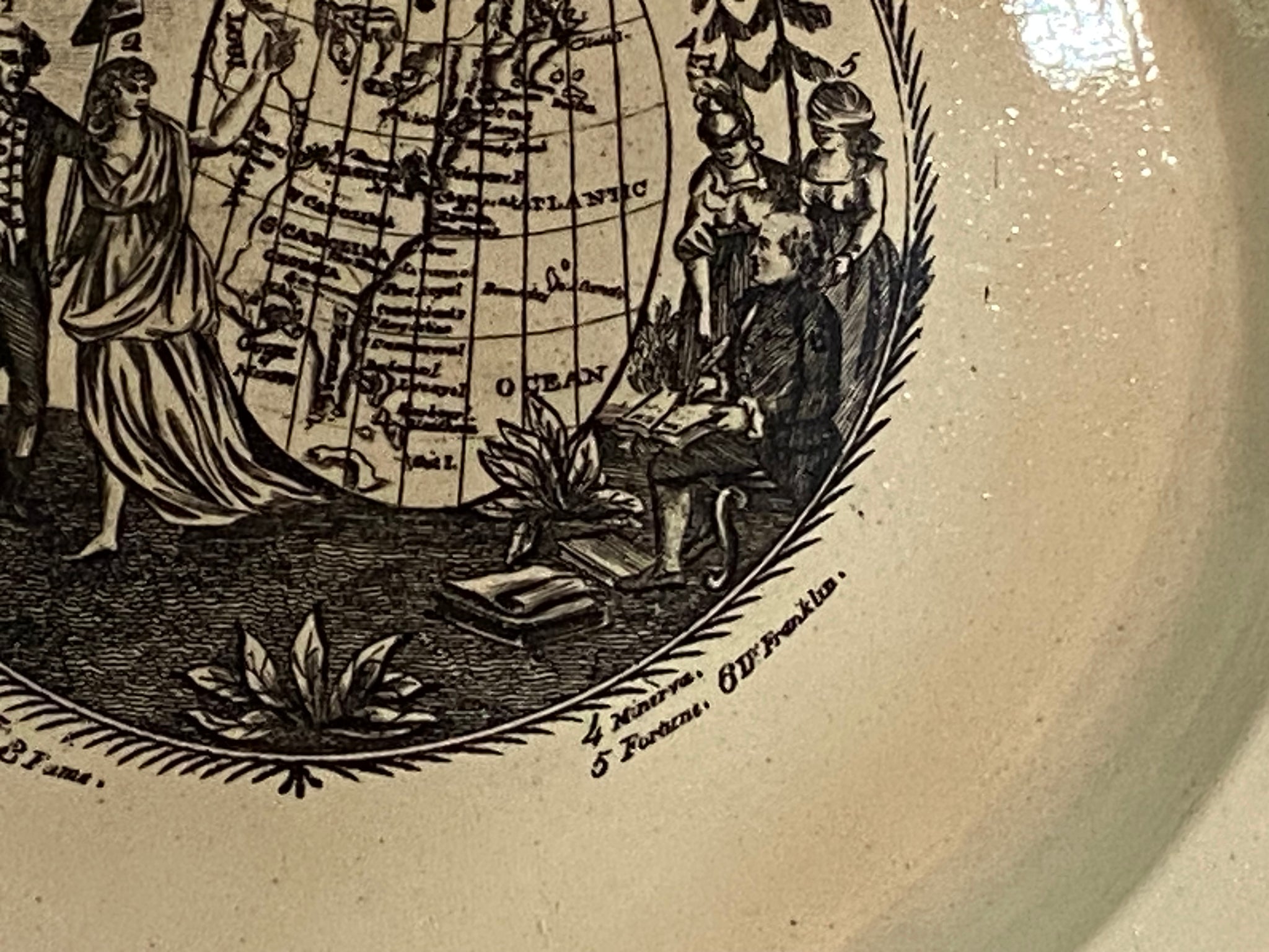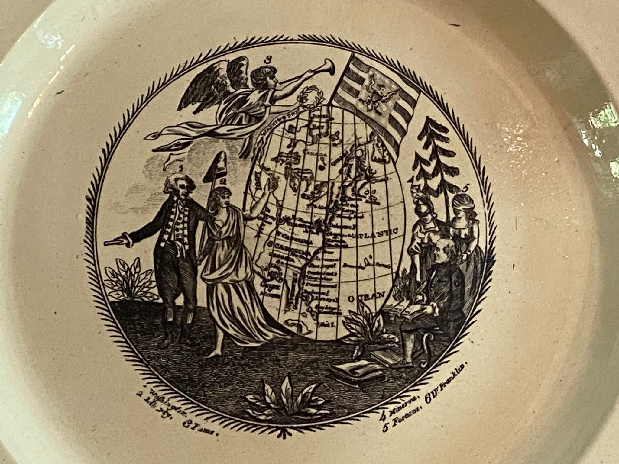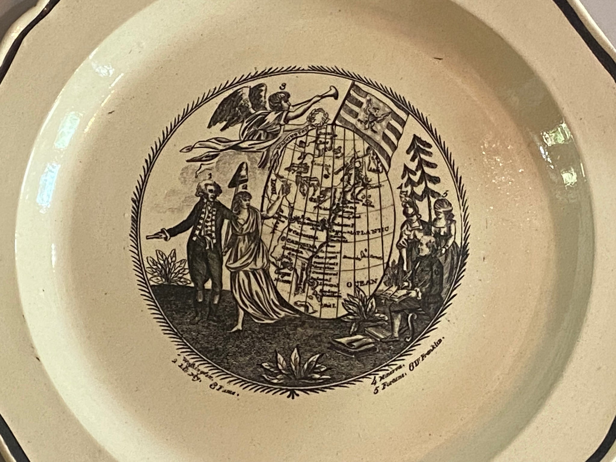Staffordshire creamware Liverpool plate with map of the East Coast transfer. Shows Washington, Lady Liberty and Franklin with map. Usually you see this on a pitcher but never on a plate. This is from a long time collection of rare creamware that we are handling. Perfect condition with no chips, cracks or repairs. It measures 10” in diameter and dates circa 1800.