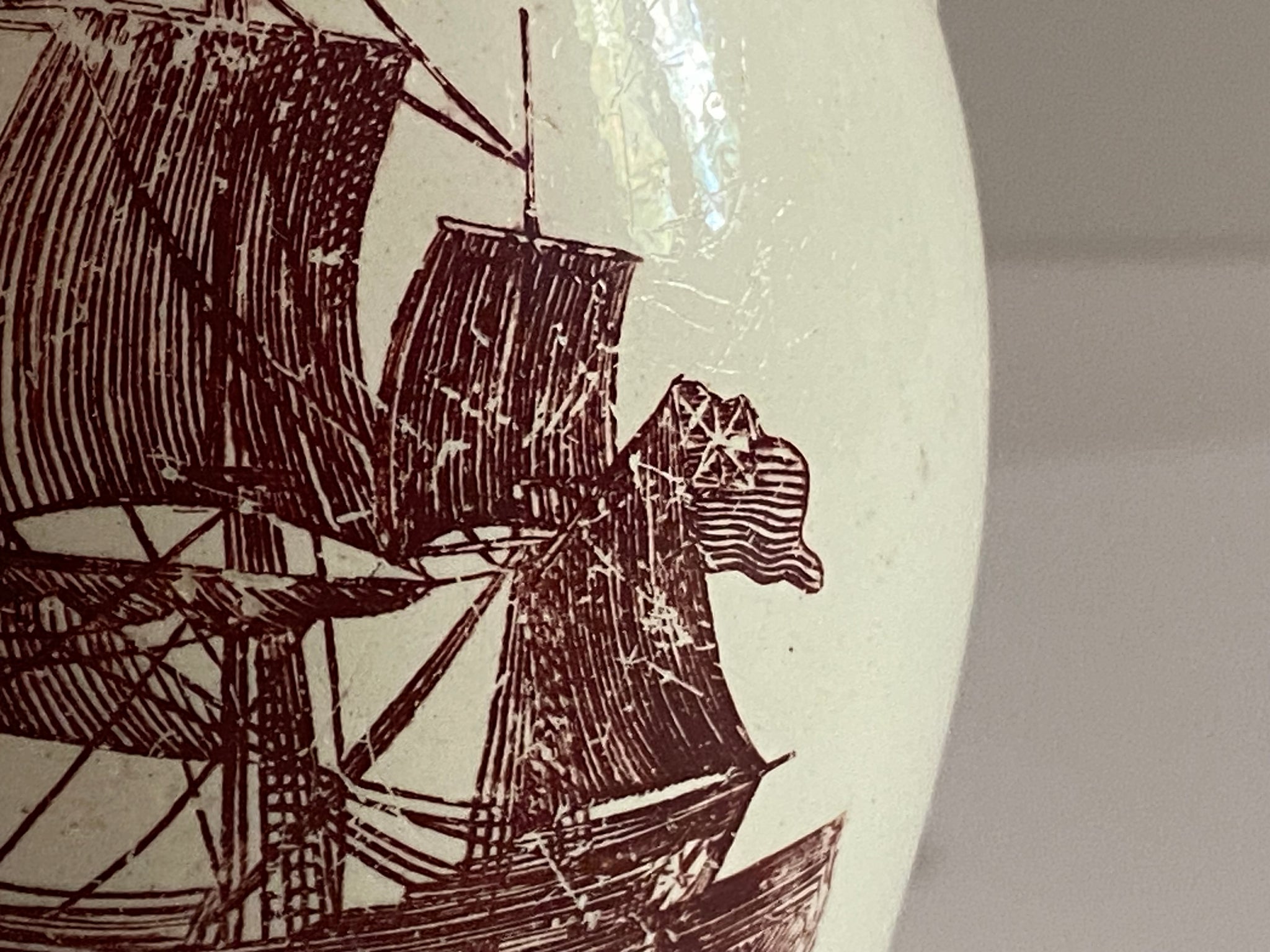 Staffordshire creamware very small Liverpool pitcher with British Ship and “Come Box The Compass” transfers. Excellent condition with no chips, cracks or repairs. It measures just 4 1/4” tall and dates circa 1800.
