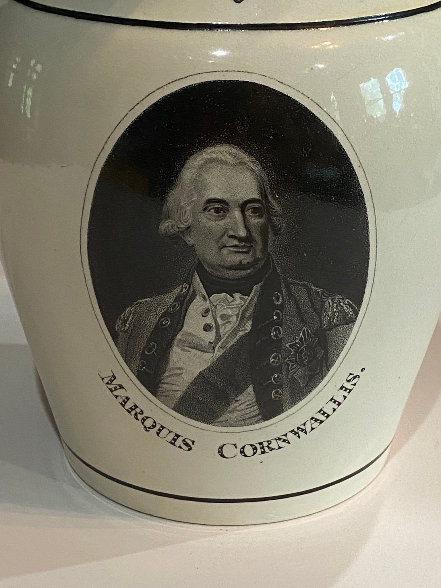 Staffordshire Pearlware Herculaneum Pottery pitcher with portrait of Marquis Cornwallis. In good condition with a very short hairline on the rim. It measures 7 3/4” tall by 7 1/4” from the tip of the spout to the handle and dates circa 1820’s.
