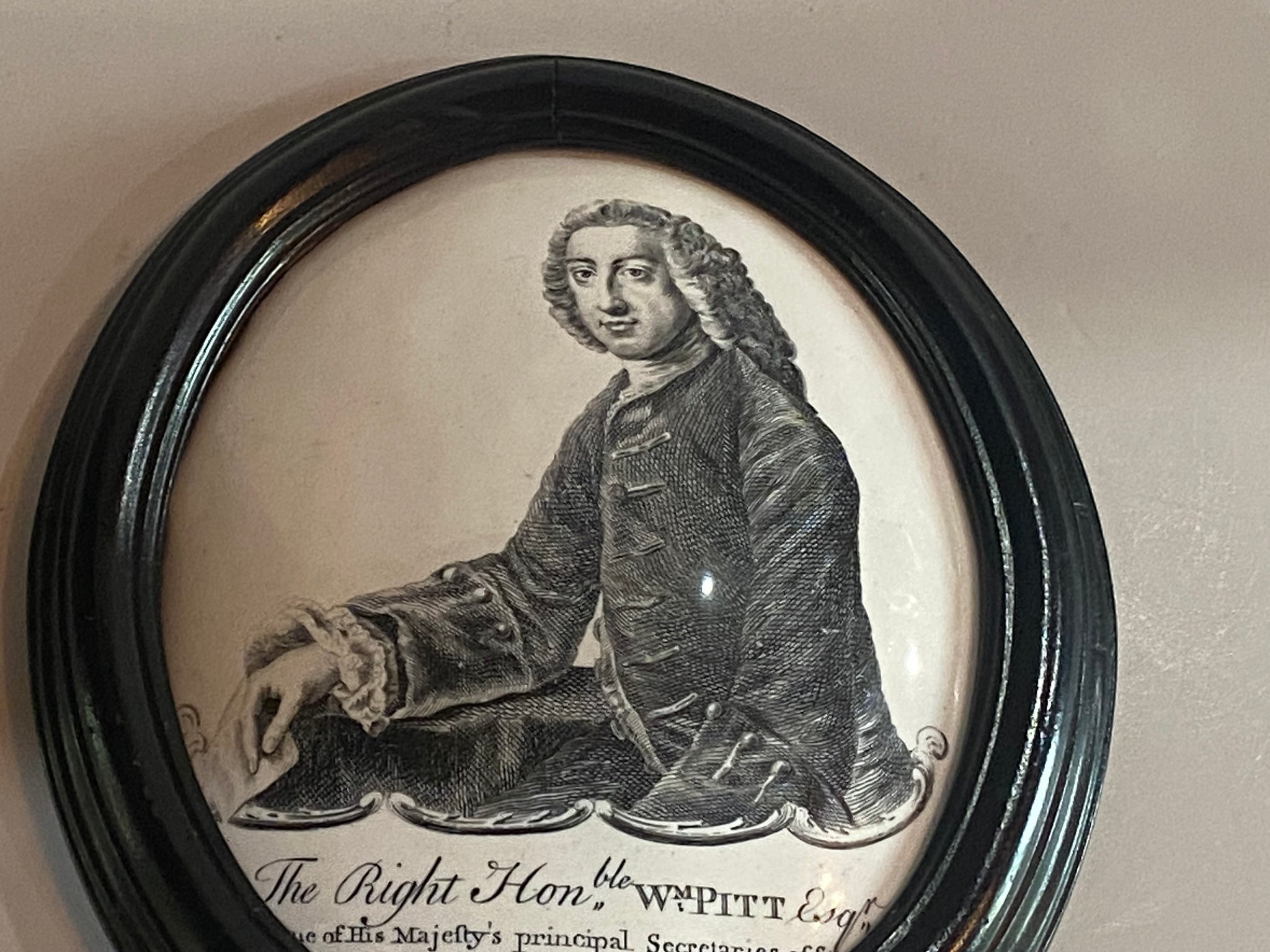Staffordshire Right Honorable William Pitt Liverpool Sadler Plaque. Extremely rare and delicate plaque in Wood Frame. Perfect condition with no damage or repairs. It measures 5 7/8” by 6 7/8” and dates circa 1800.