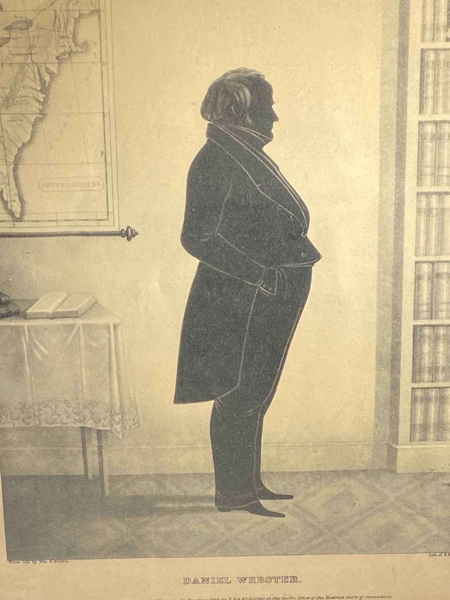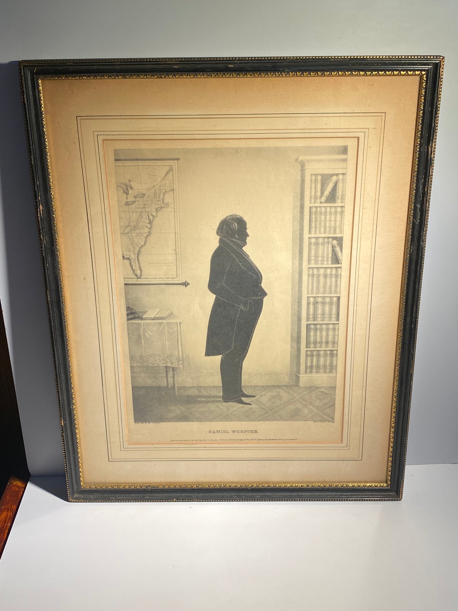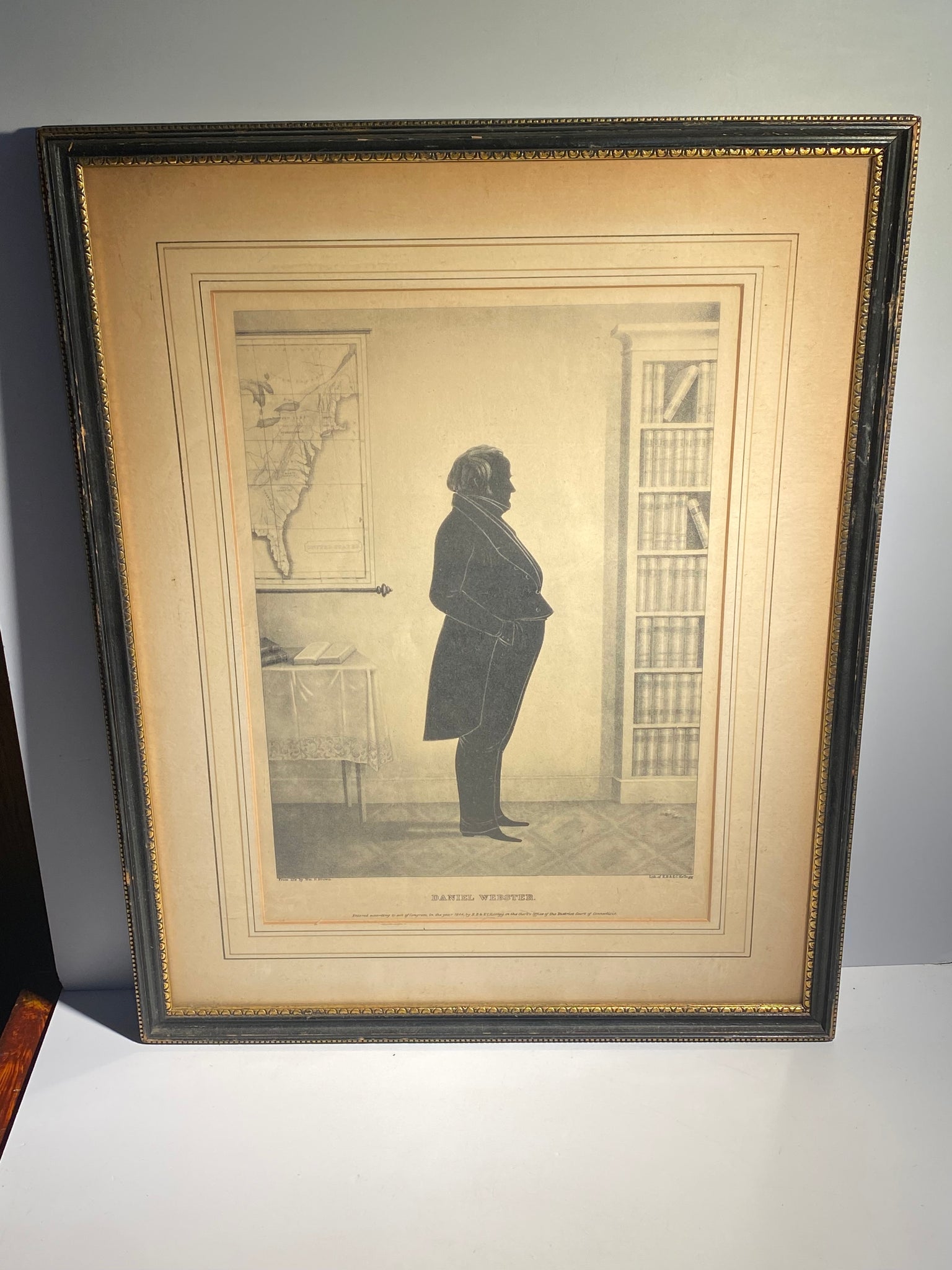 Antique lithograph print silhouette of Daniel Webster by E..B. E.C Kellogg In Connecticut 1844. In very good condition with no tears or repairs. The sheet measures 10 1/2” by 15” through the French mat window.