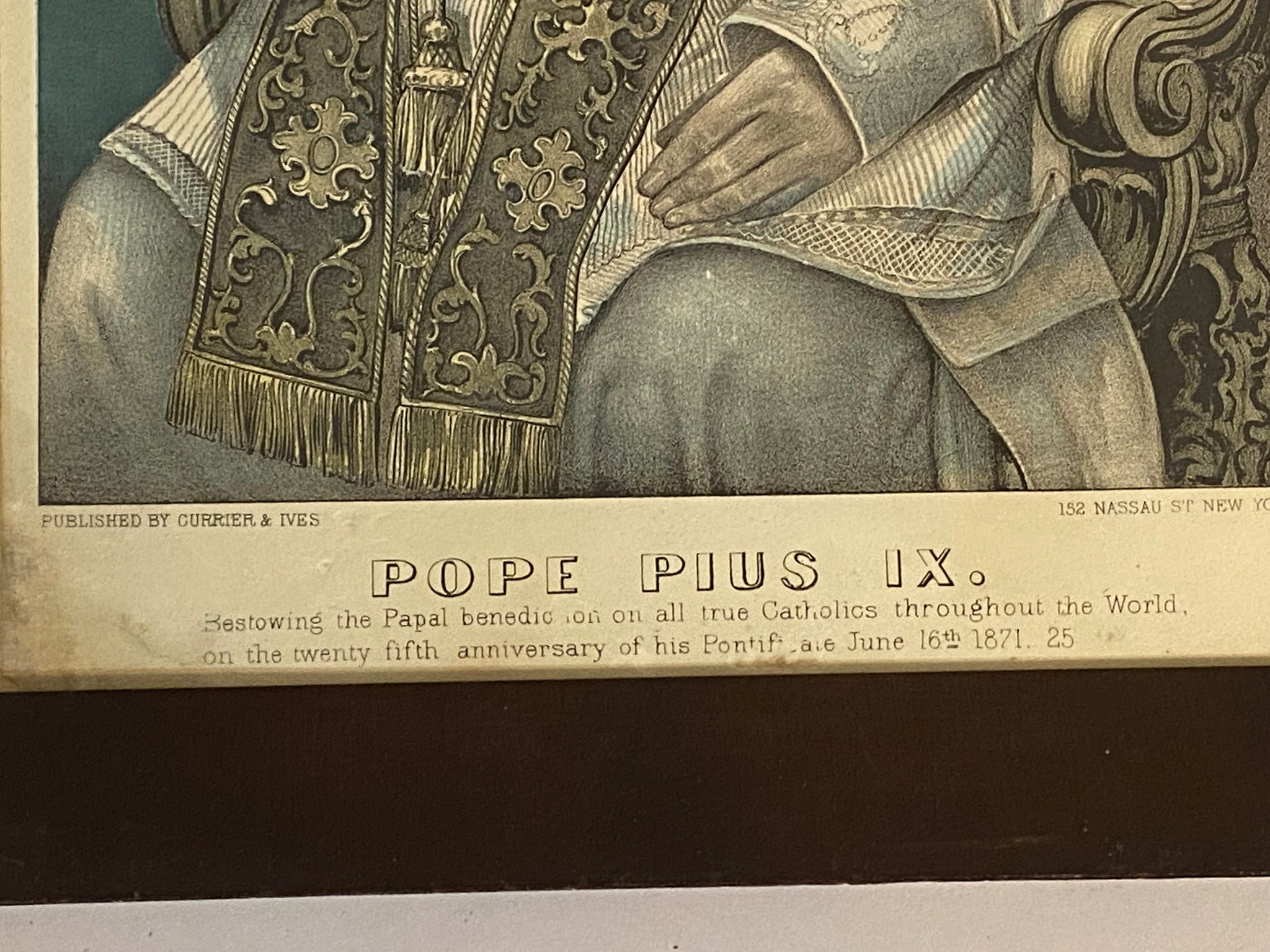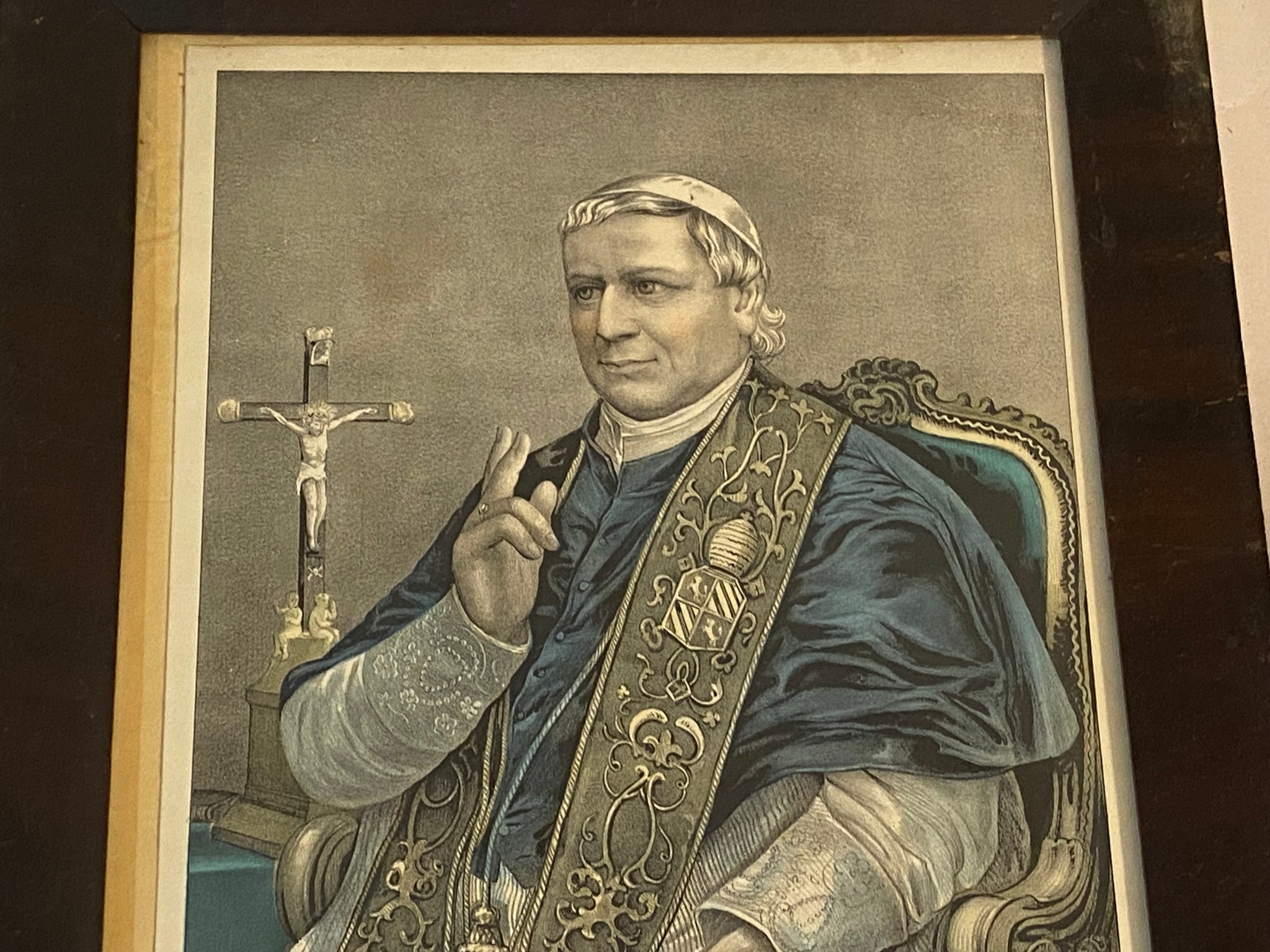 Original Currier & Ives print Pope Plus lX. Great condition with good color. Nice period veneer frame. The sheet measures 9 3/4” by 14”.