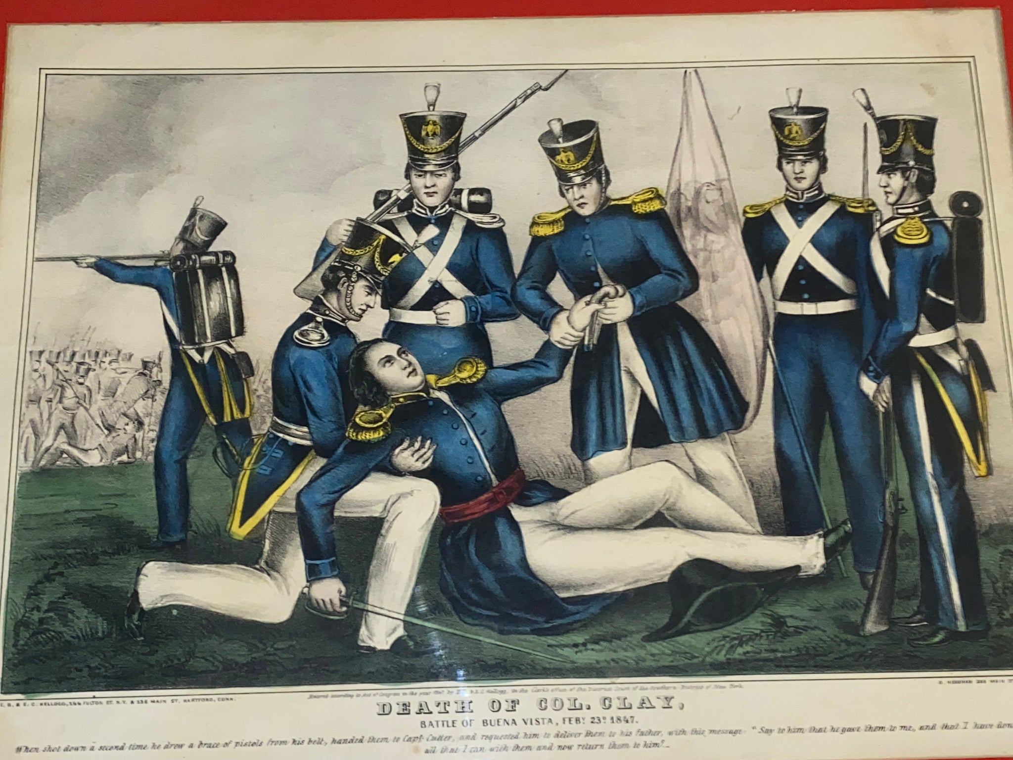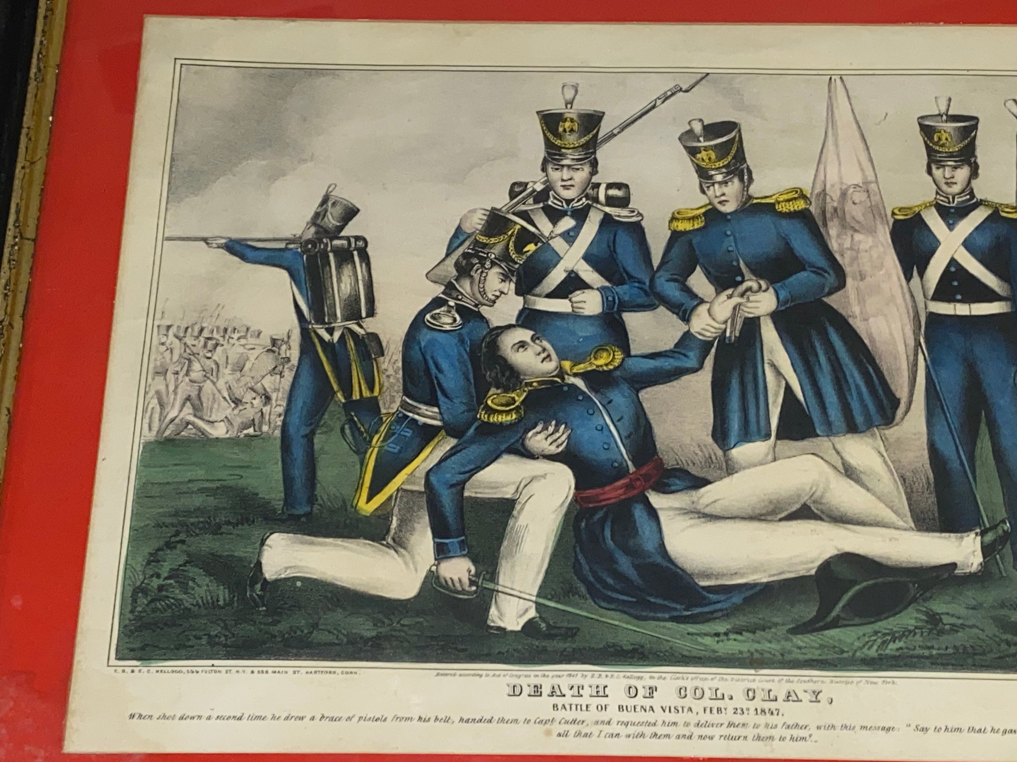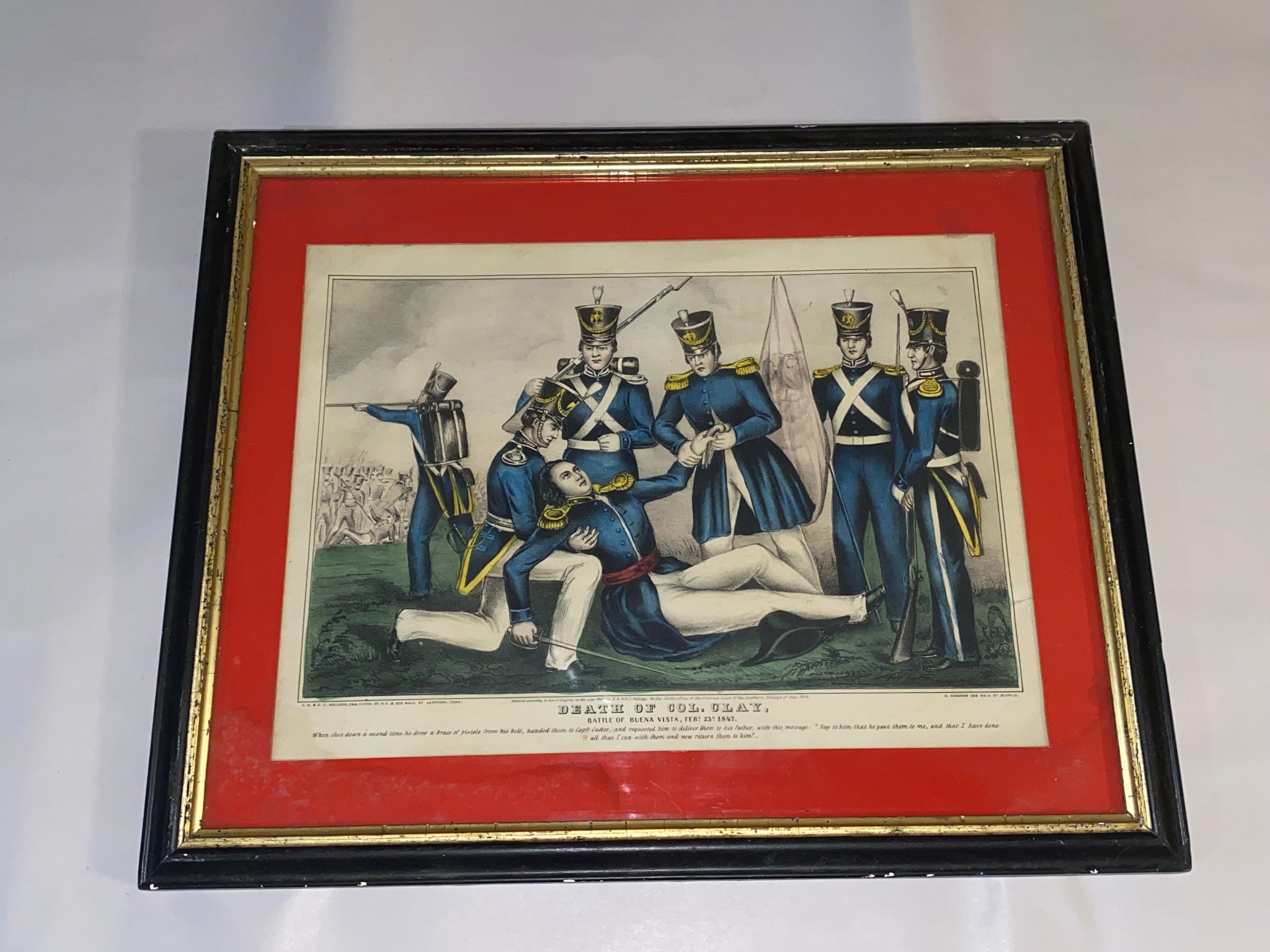 Original Currier & Ives Type Print by Kellogg titled “Death Of Col. Clay Battle Of Buena Vista Feb. 23rd 1847”. Dated 1847. Very nice color for such an early lithograph. Good condition with a very small tear in the right margin that doesn’t go into the image. The mat does have some minor staining. The sheet measures 10” by 13 1/2” through the mat window.