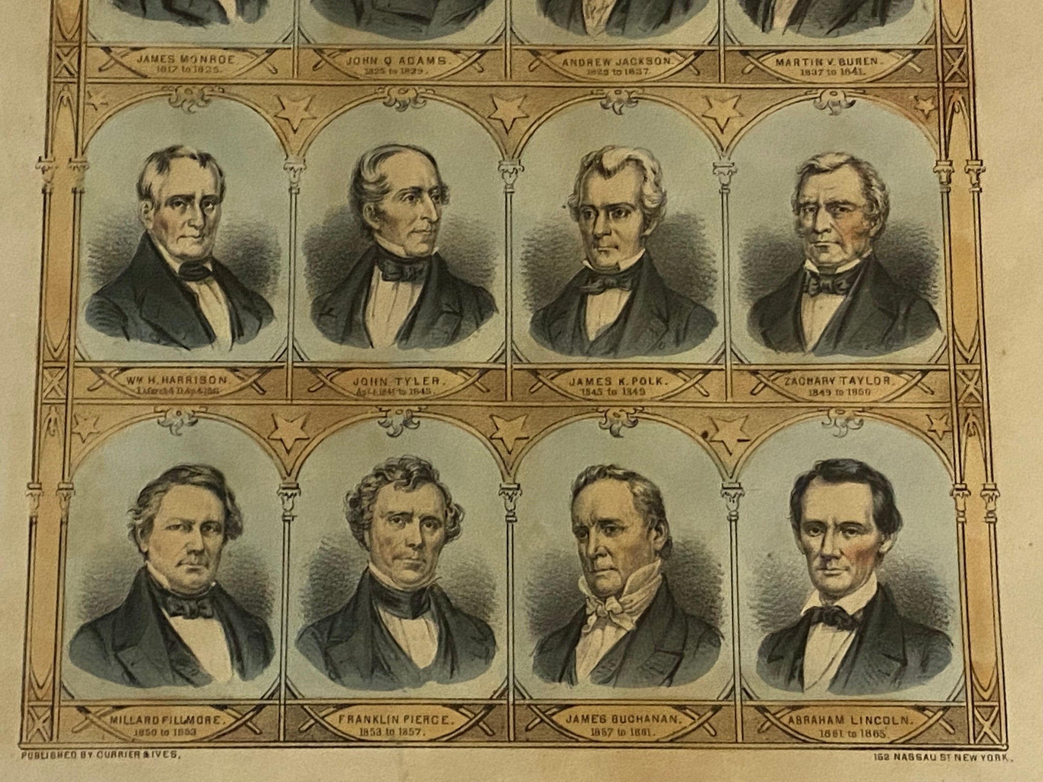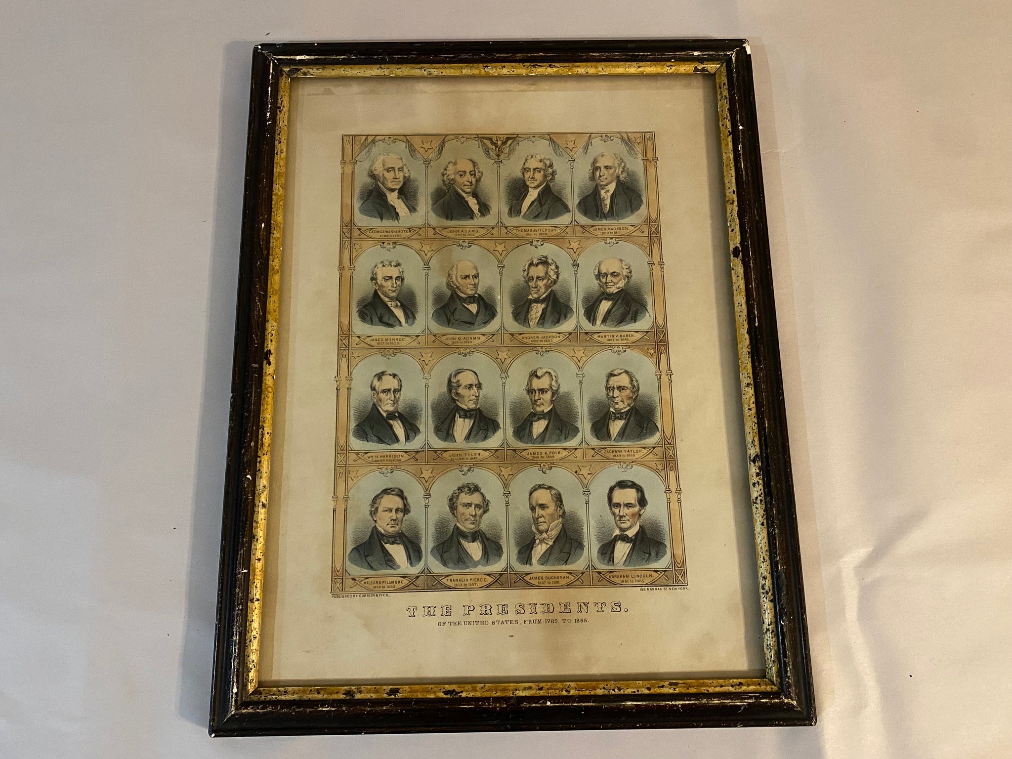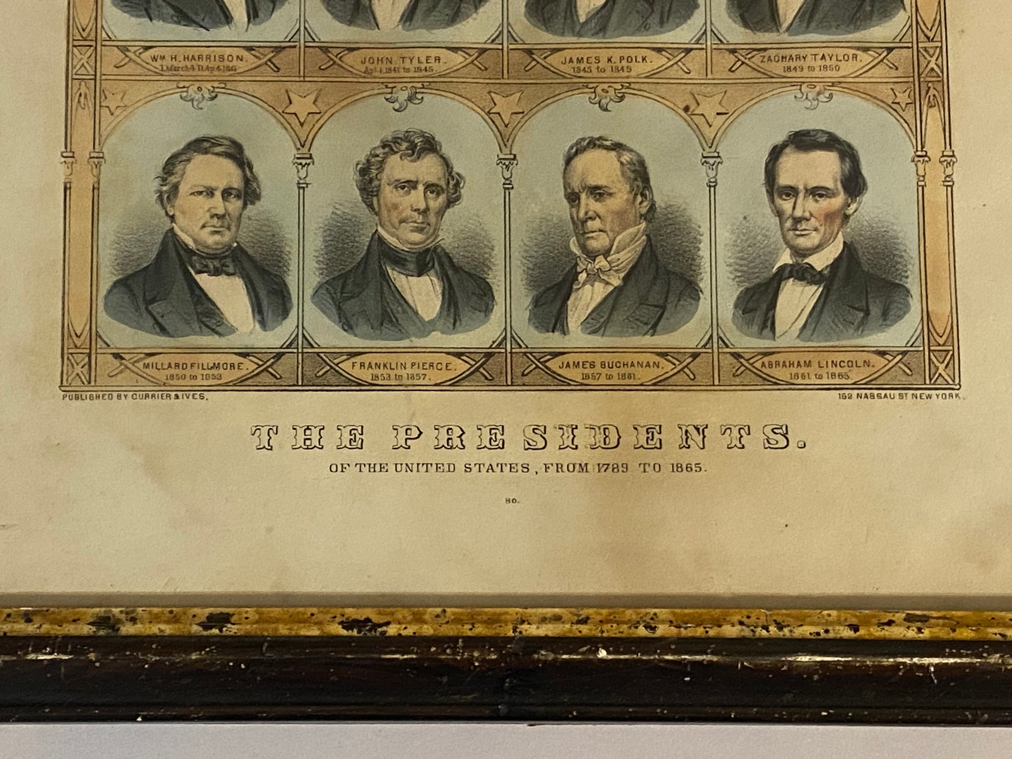 Original Currier and Ives Print “The Presidents of the United States from 1789 - 1865”. In very good condition with no damage or repairs and retains good color. The sheet measures 12” by 16”.
