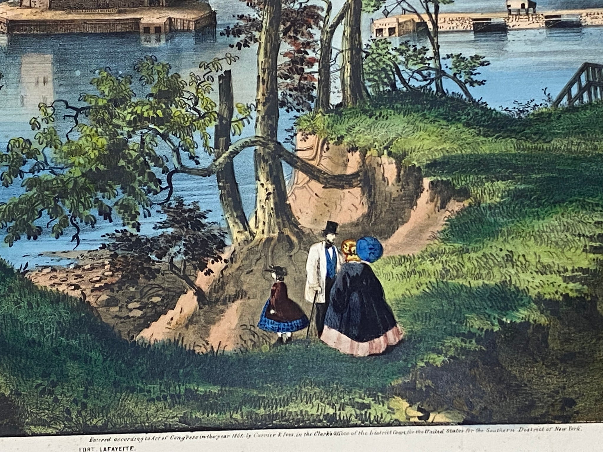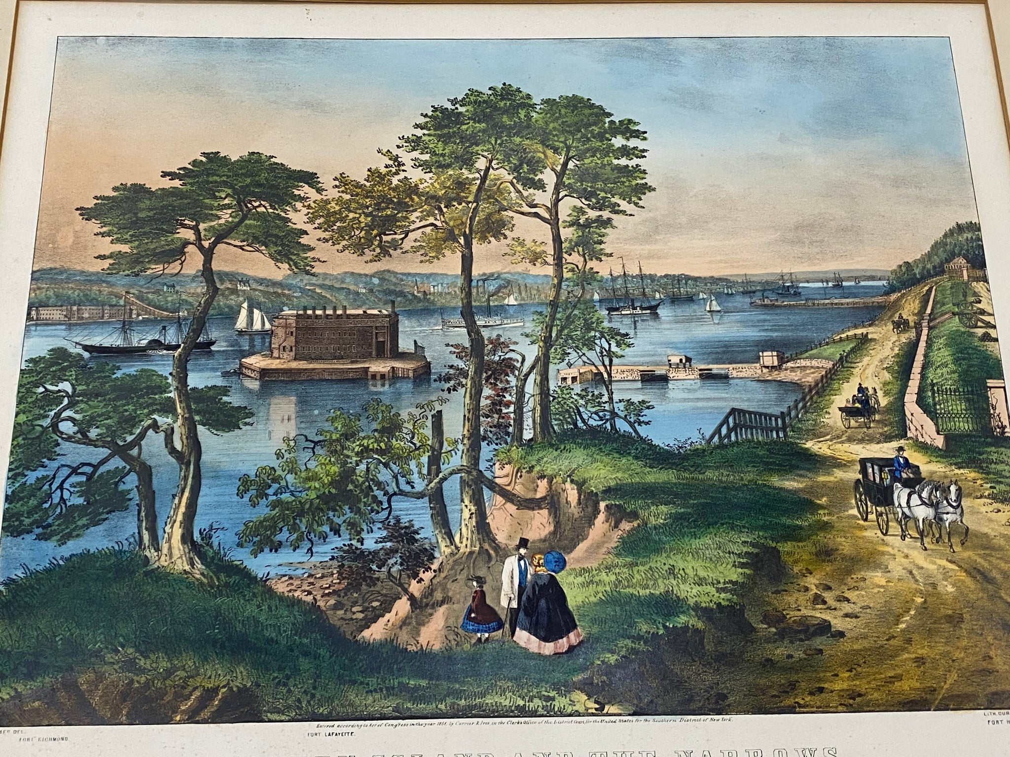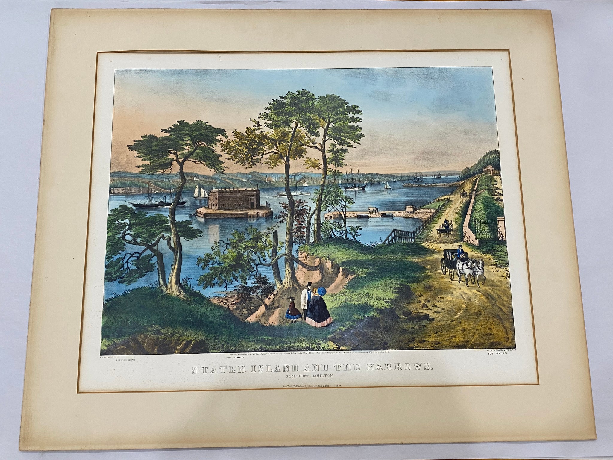 Original Currier & Ives large folio print “Staten Island And The Narrows. From Fort Hamilton”. This print is probably one of the nicest colored Curries I have seen. Done from a Fanny Palmer painting. Shows original bright color and is huge sheet measuring 21 3/4” by 27 1/8”. Only thing is that it does have a mat burn and is laid down on a thin board. Would be easy for any print conservator to take care of. Comes with a frame but no glass.