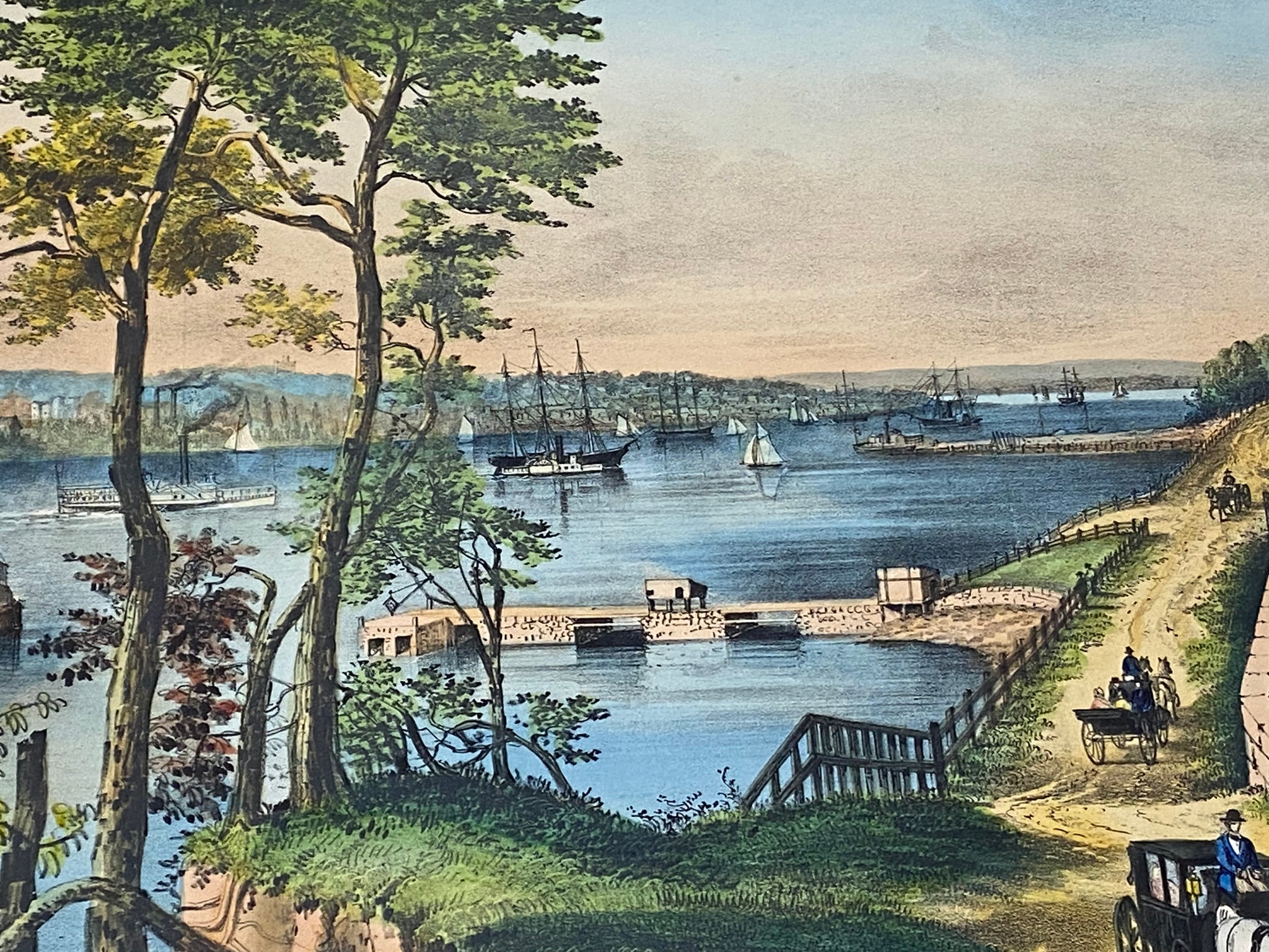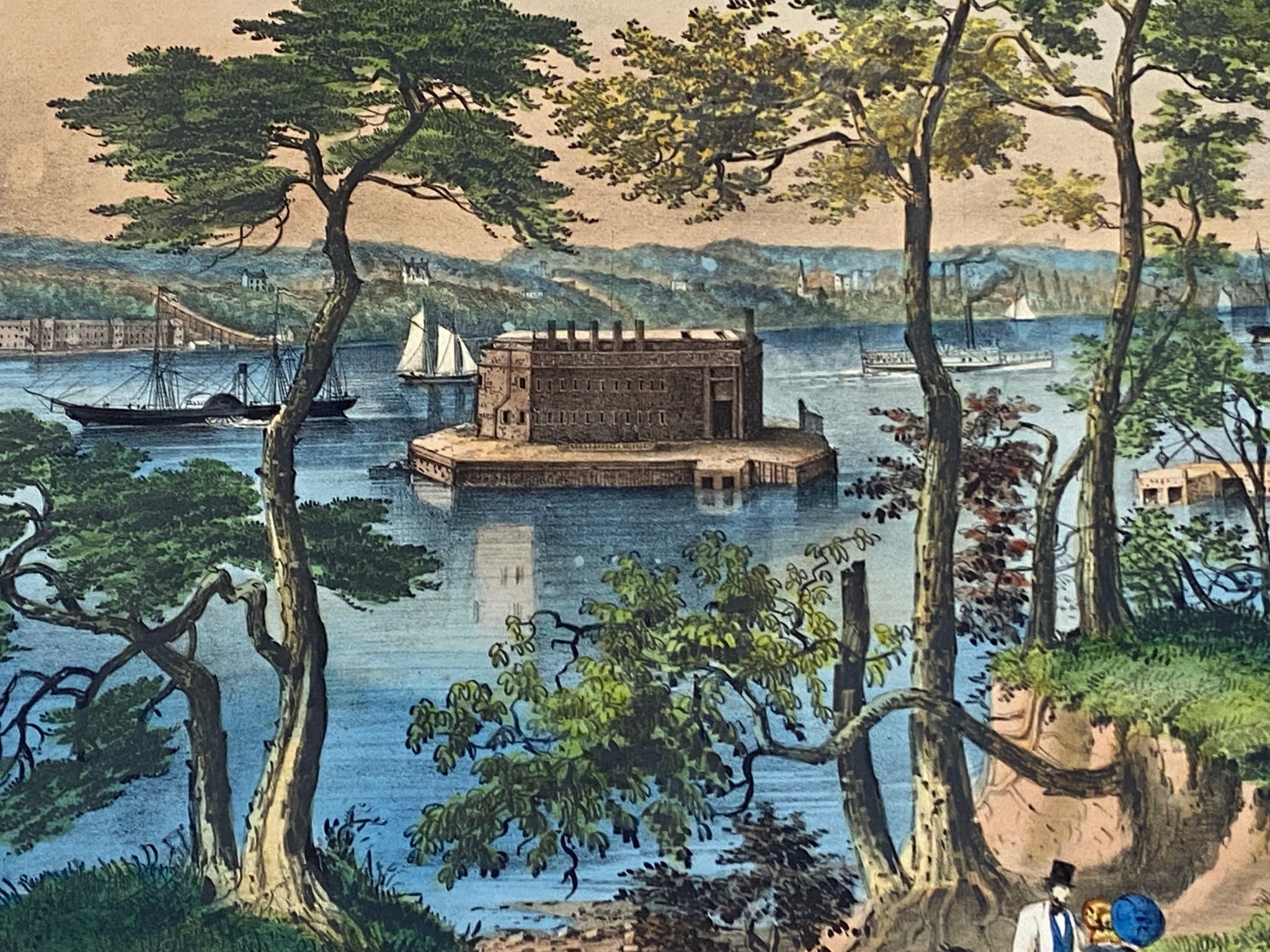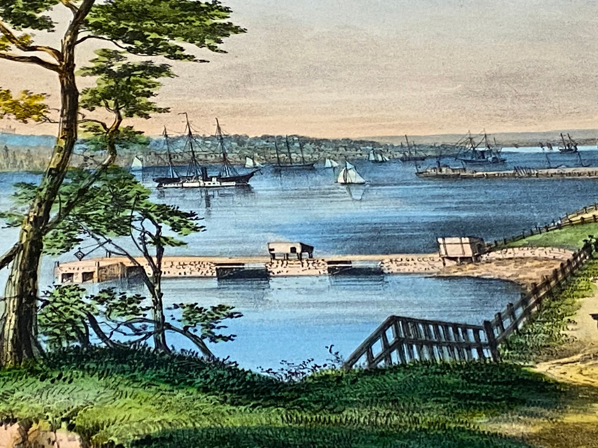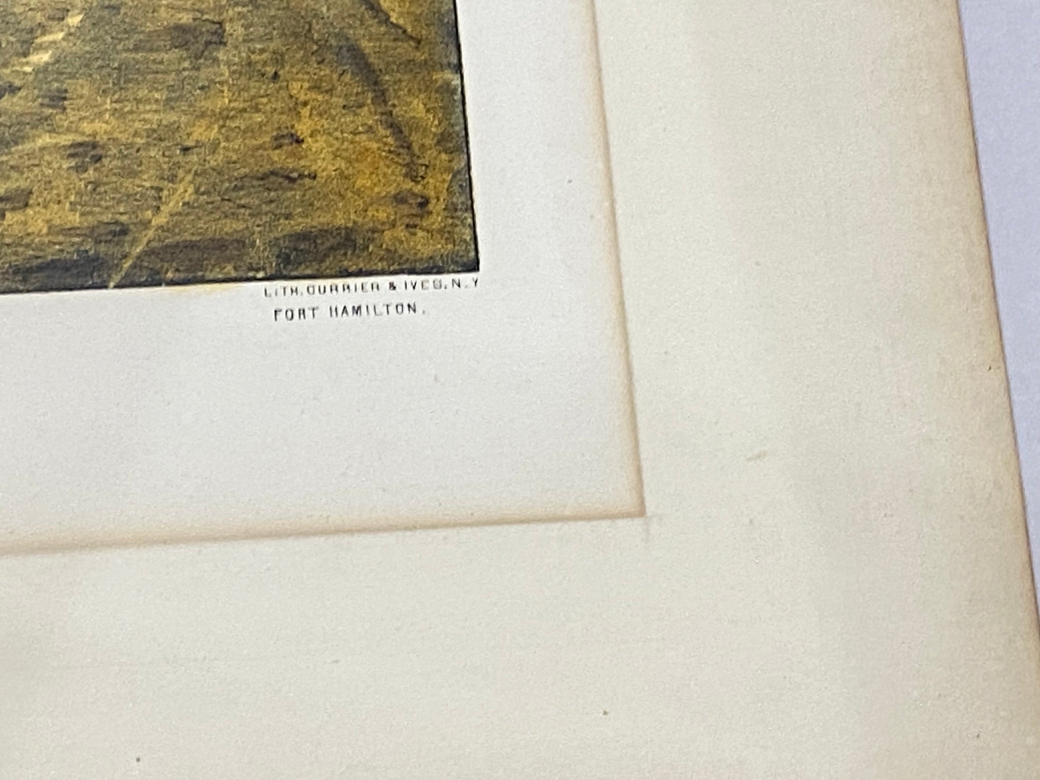 Original Currier & Ives large folio print “Staten Island And The Narrows. From Fort Hamilton”. This print is probably one of the nicest colored Curries I have seen. Done from a Fanny Palmer painting. Shows original bright color and is huge sheet measuring 21 3/4” by 27 1/8”. Only thing is that it does have a mat burn and is laid down on a thin board. Would be easy for any print conservator to take care of. Comes with a frame but no glass.