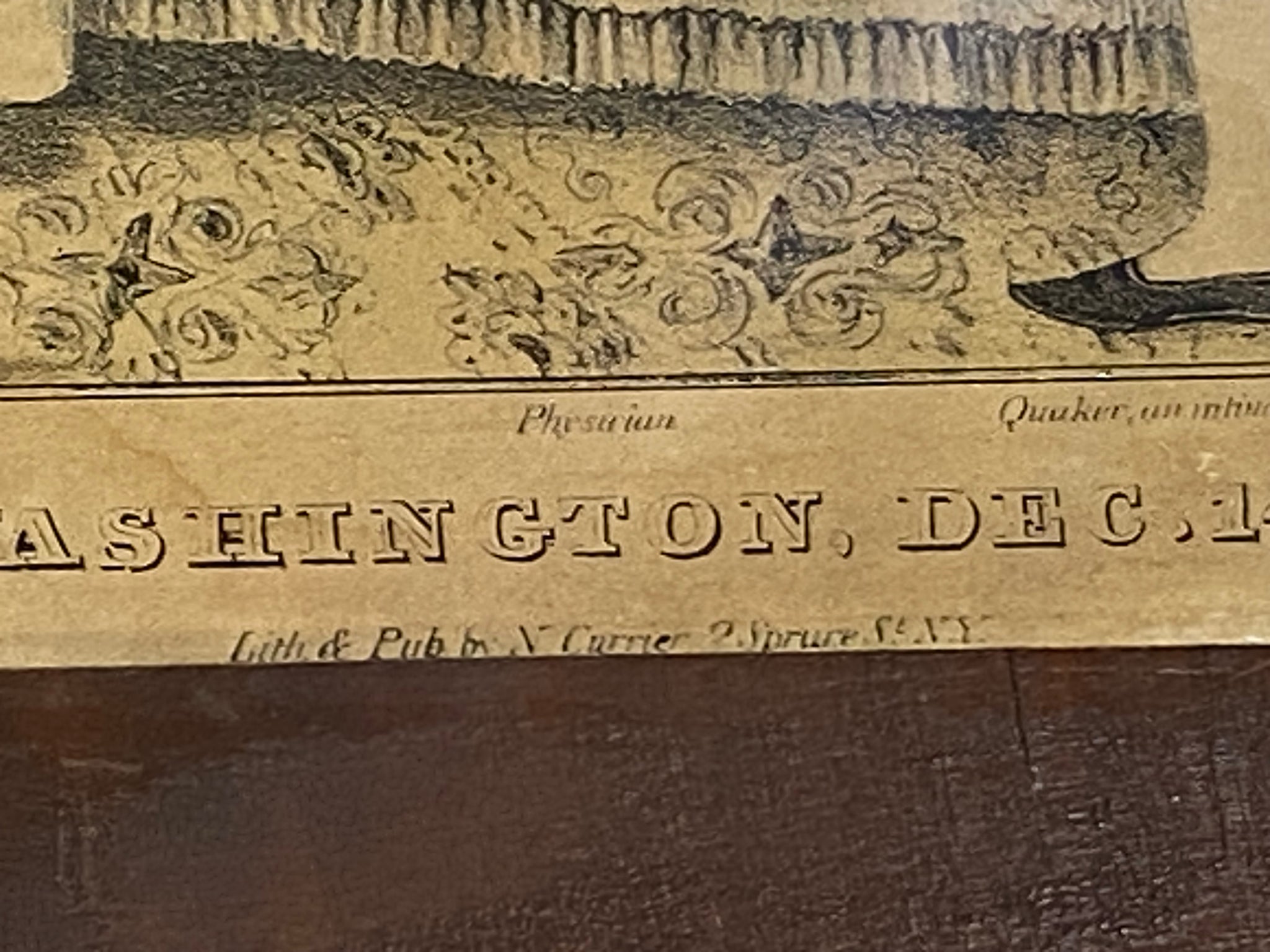 Original N. Currier print titled “Original N. Currier & Ives Print Death Of Washington Dec. 14 A.D. 1799”. In good condition with some light marginal staining. The sheet measures 10 1/8” by 14 1/8”.