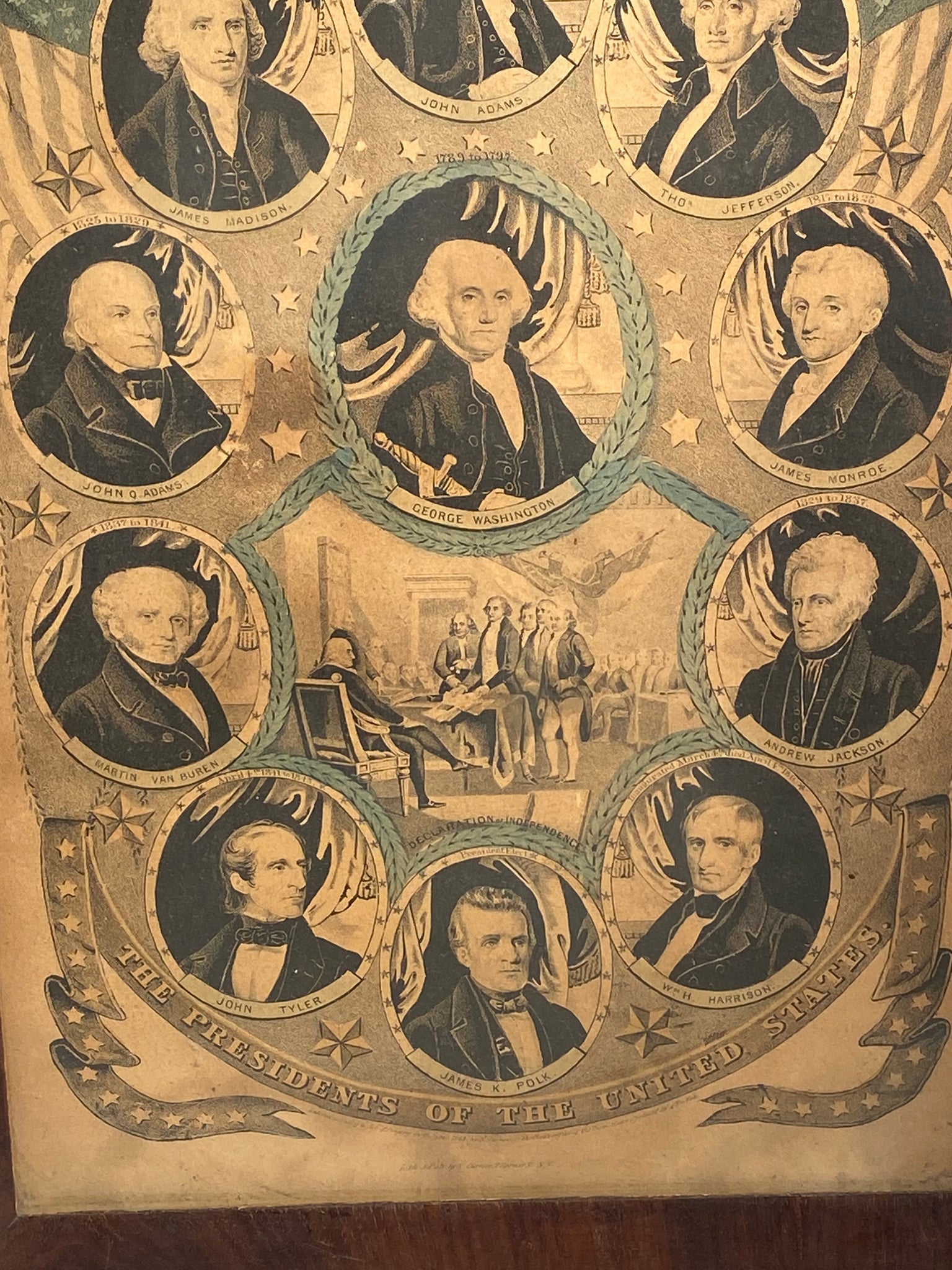 Original N. Currier print “The President’s of the United States”. Displays well with some even toning and minor losses to the frames veneer. The sheet measures 10” by 14”.