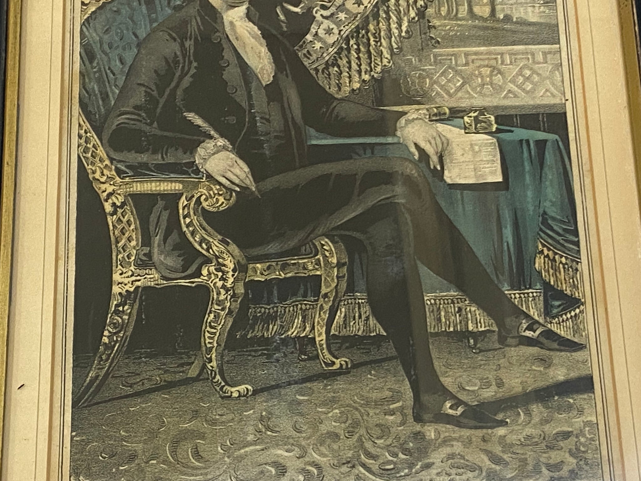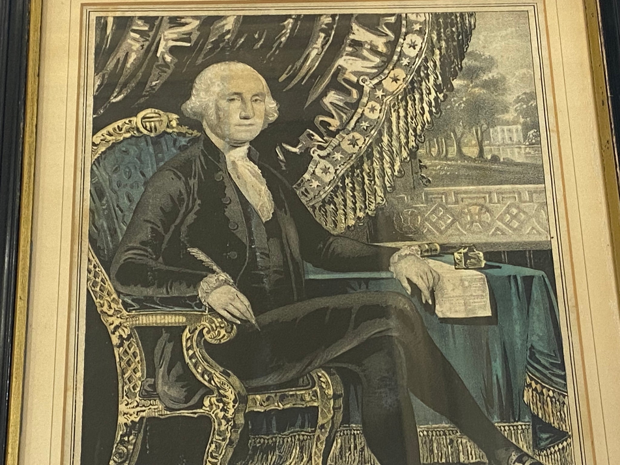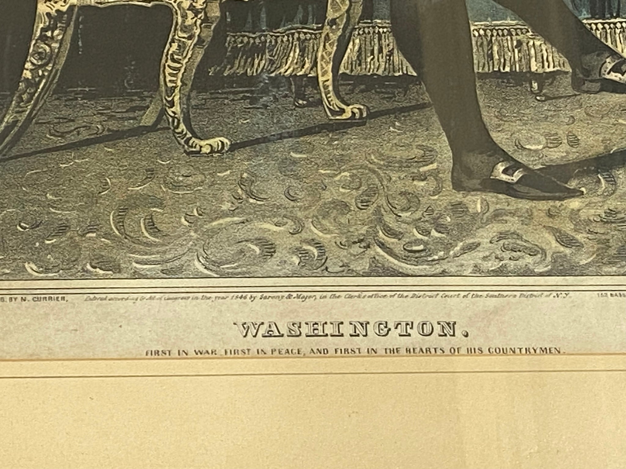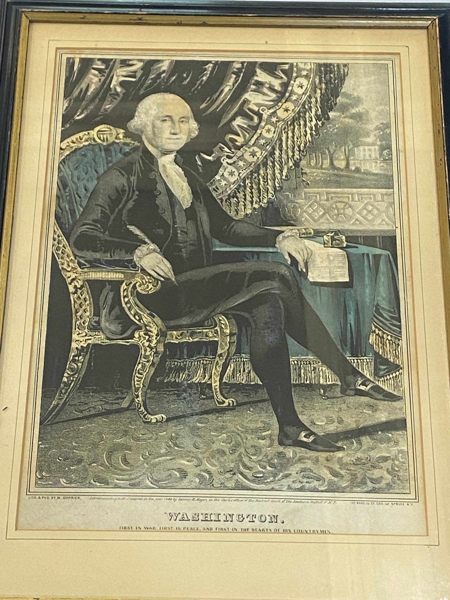 Original N. Currier print titled “Washington- First in War, First in Peace and First In the Hearts of His Countryman”. In good condition with a light stain that goes through the side of his face and through to his vest. Otherwise quite nice. The sheet measures 9 1/4” by 13”. Matted and framed ready to hang up.