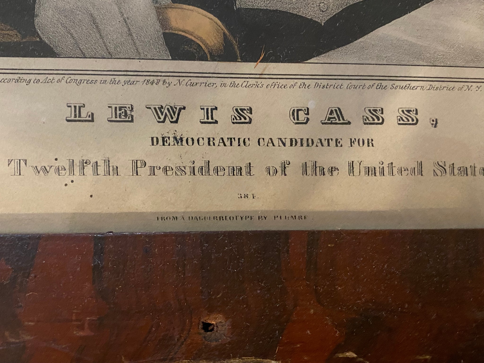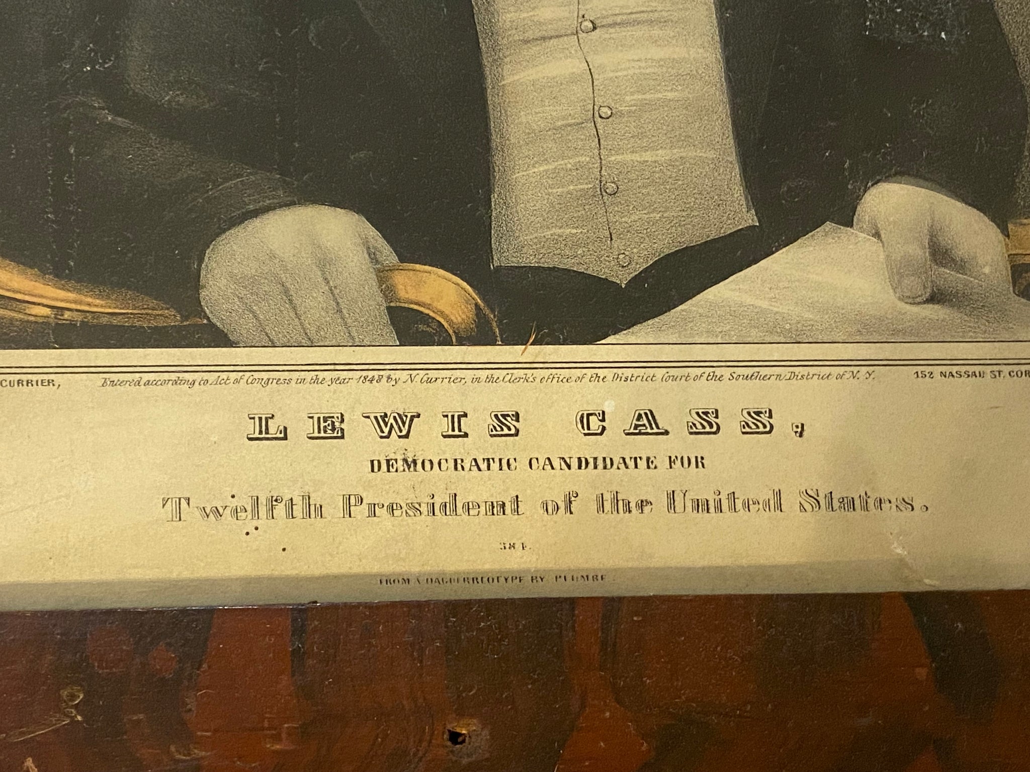 Original N. Currier Print “Lewis Cass Democratic Candidate for Twelfth President of the United States”. In good condition with a small tear in the top margin that doesn’t reach the image. Otherwise has great color and displays great. The sheet measures 10 1/4” by 14 1/4”. Framed and ready to display.