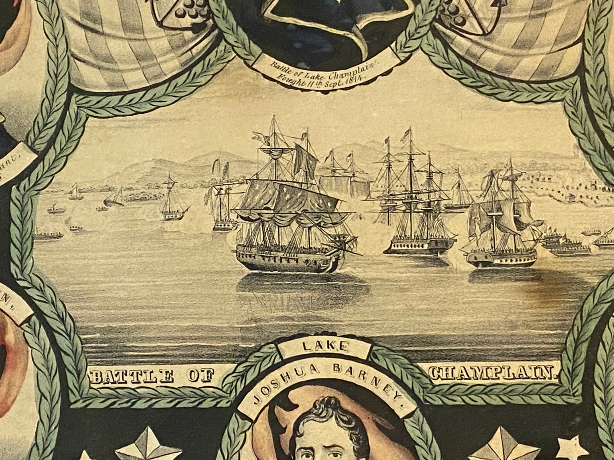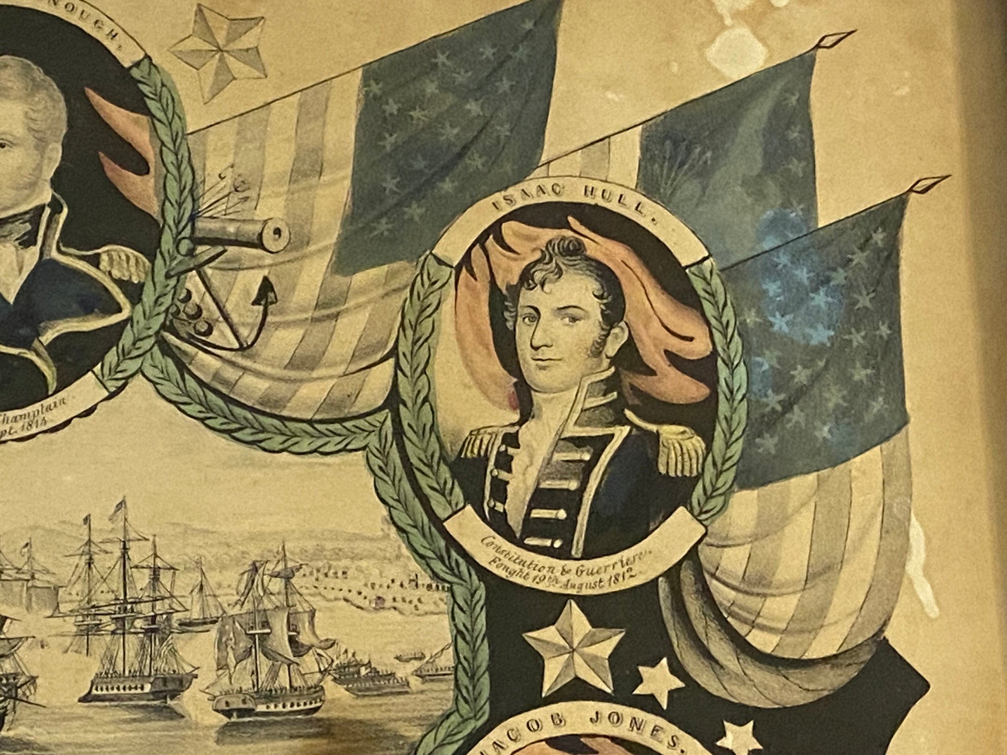 Original N. Currier “Navel Heros of the United States”. With Battle of Lake Champlain scenes in the center. Good condition with some light staining. The sheet measures 10” by 14”. Dated 1846.