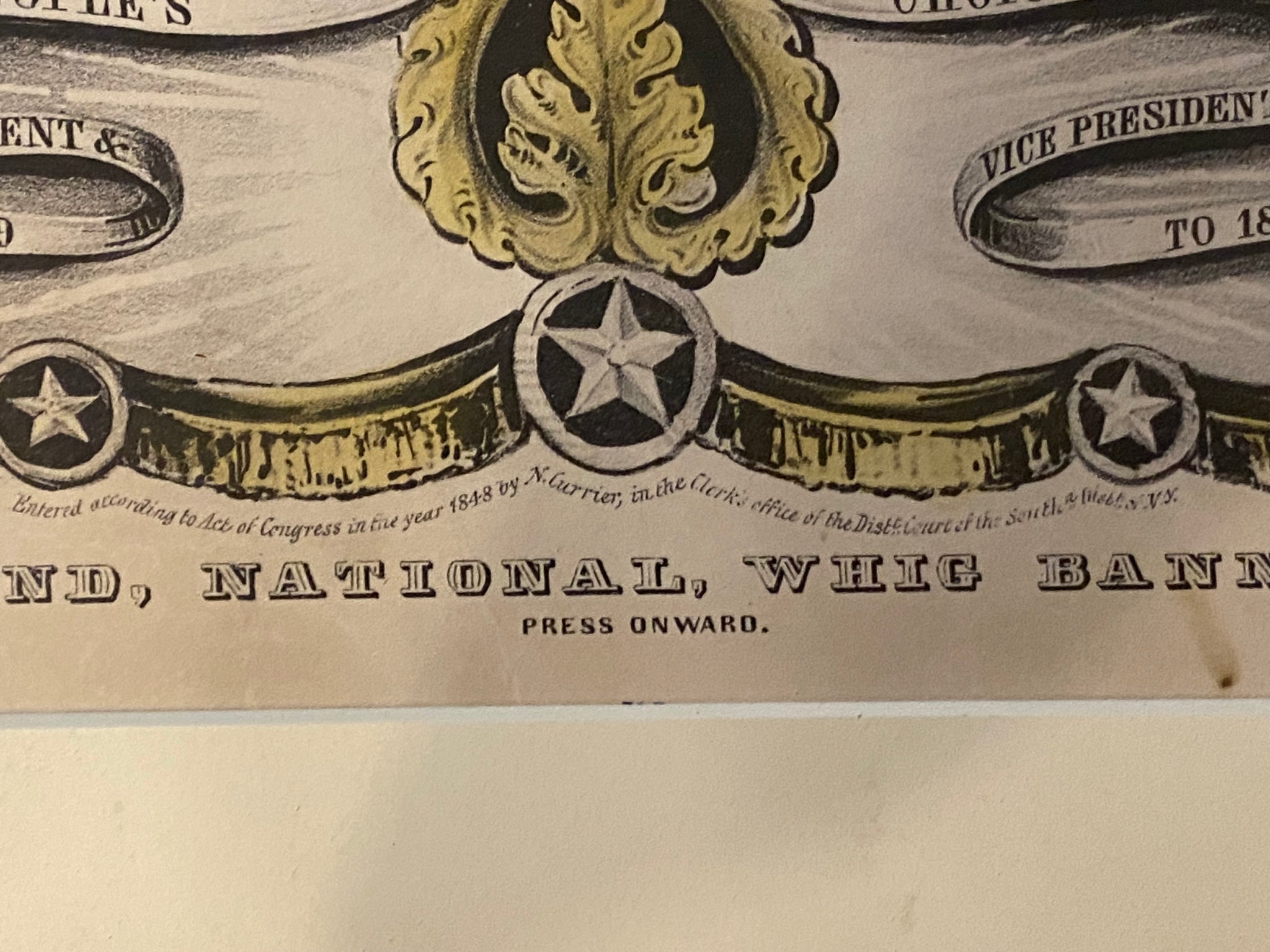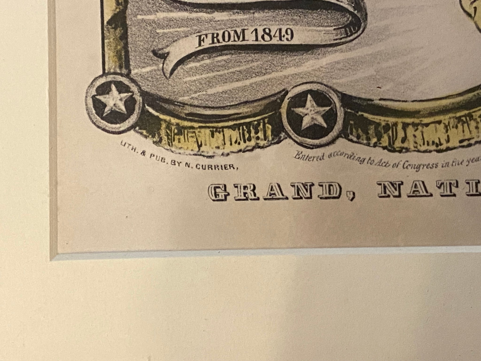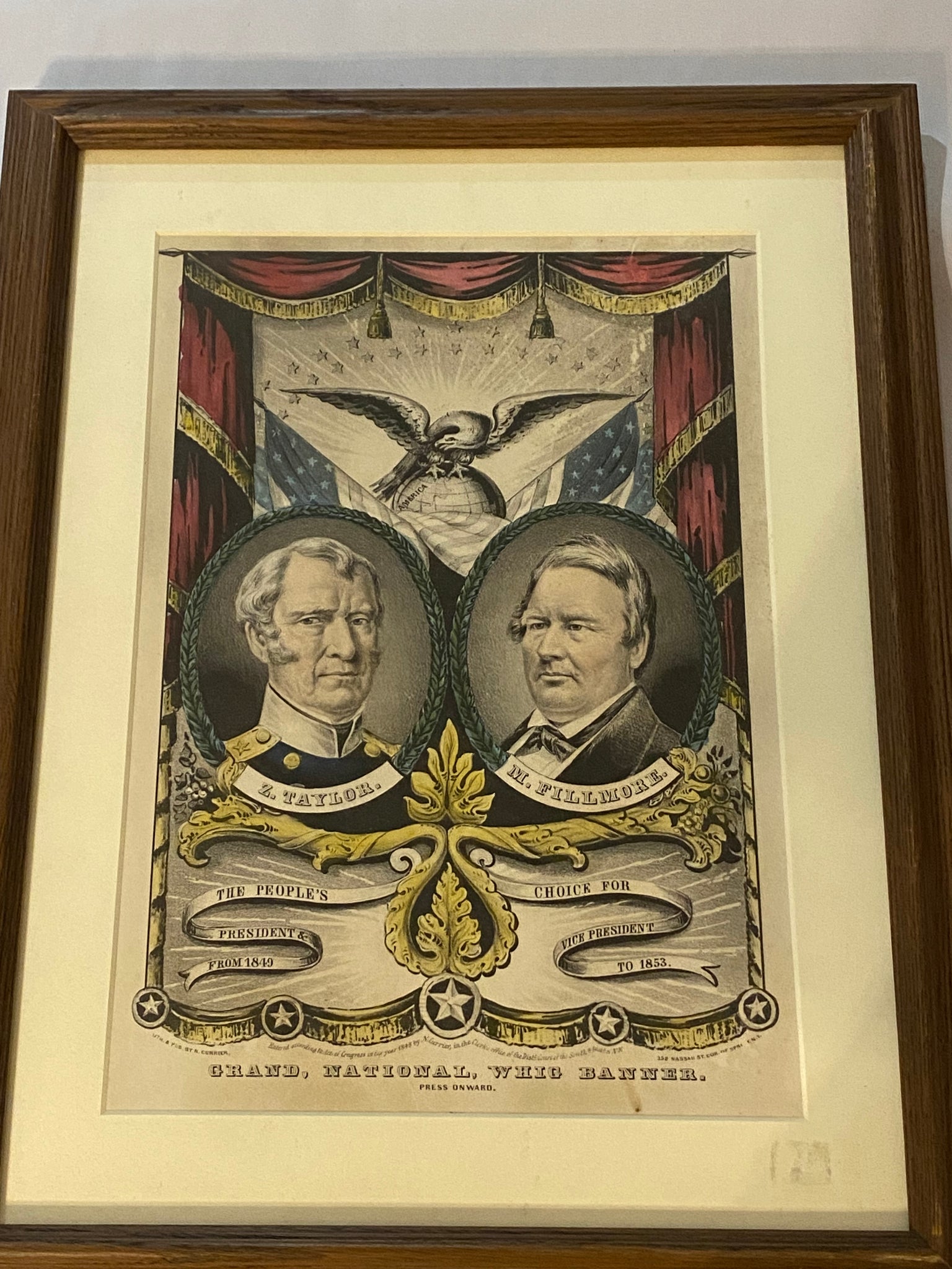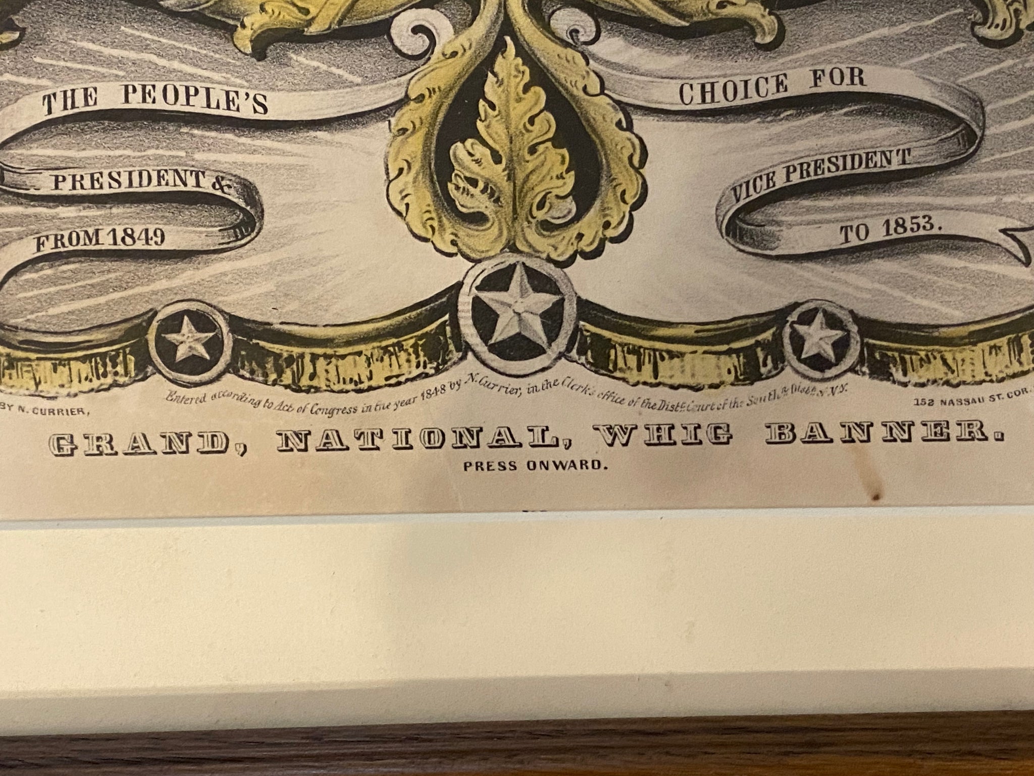 Original Currier and Ives Print “Grand, National, Whig Banner Zachary Taylor for President and Millard Fillmore for Vice President”. In great condition with a possible short tear repair on the top. Shows great color and displays great. The sheet measures 9” by 13” through the mat window. Framed and ready to display. Dated 1848.