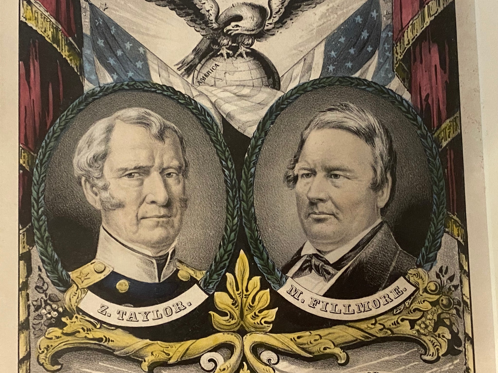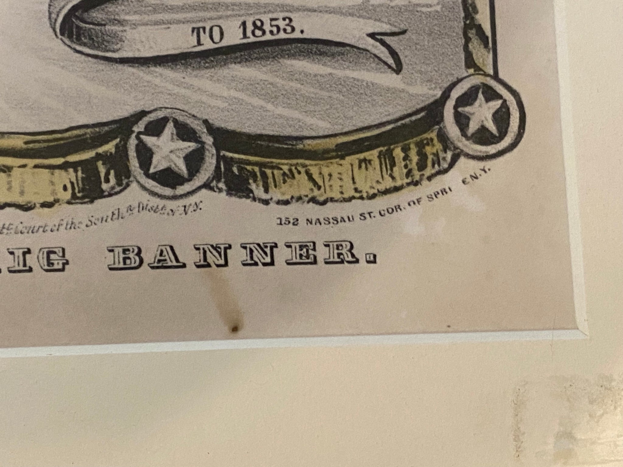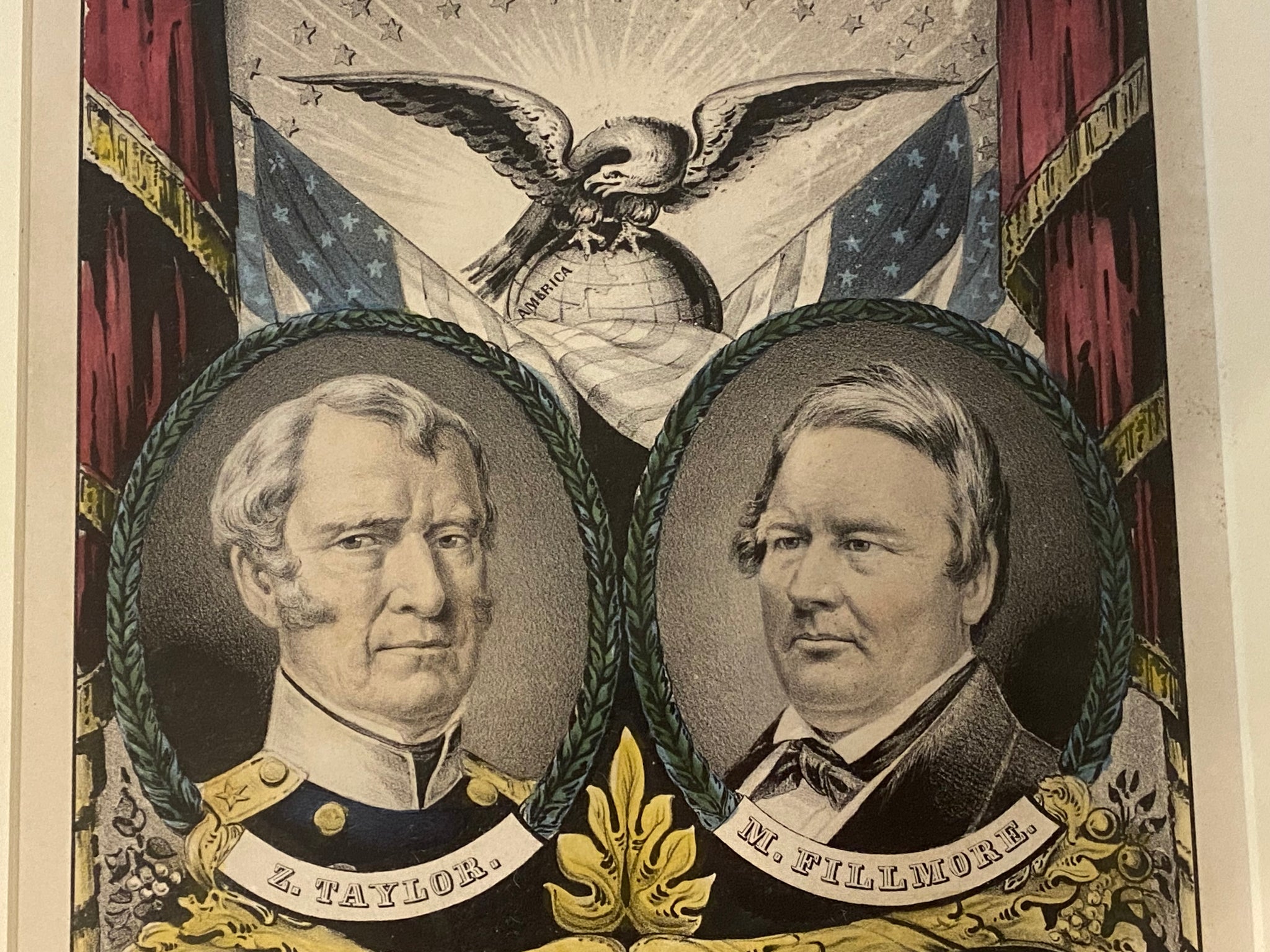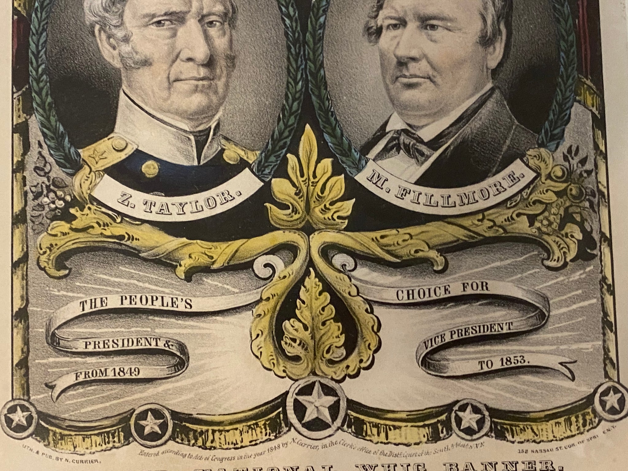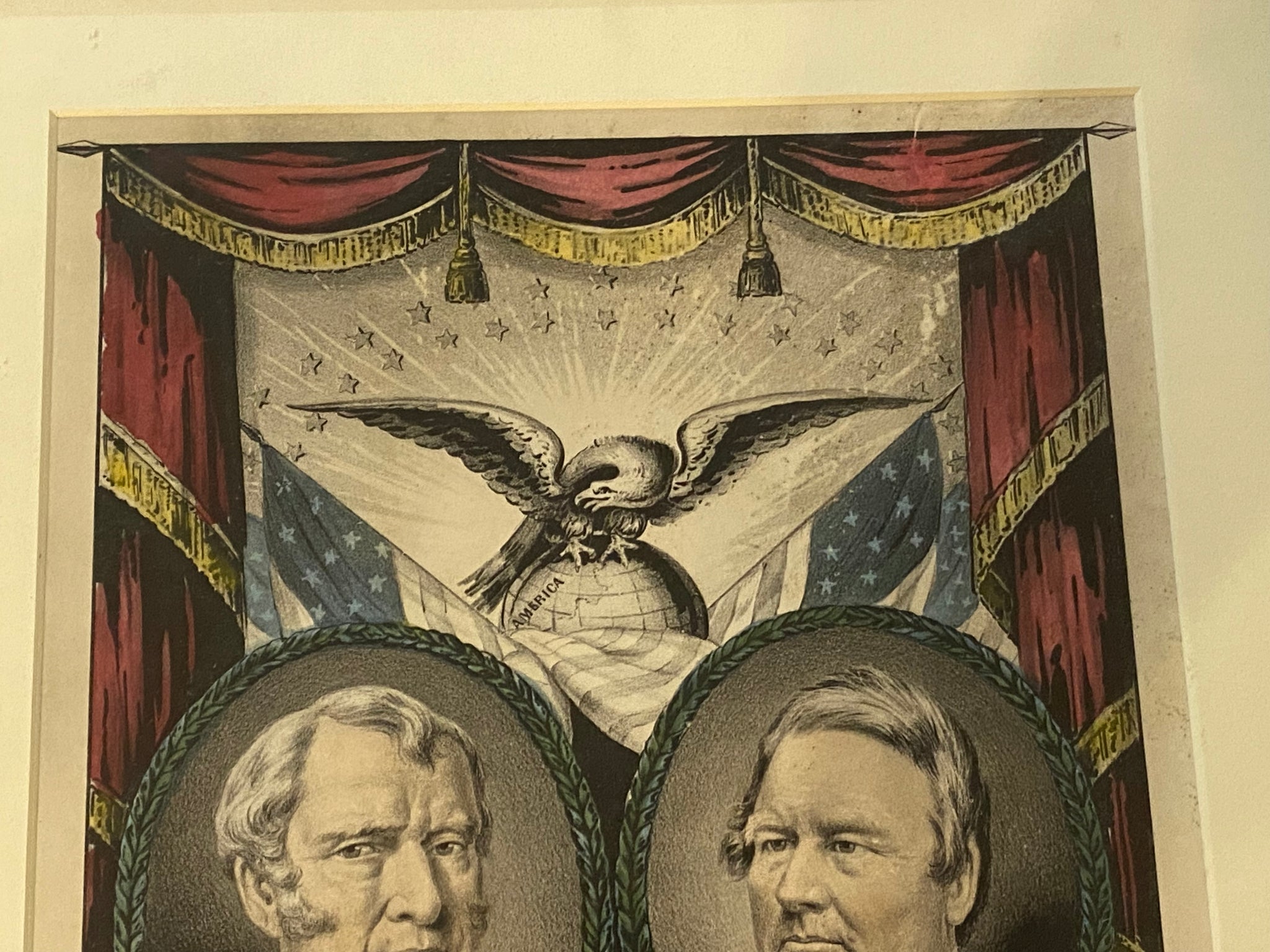 Original Currier and Ives Print “Grand, National, Whig Banner Zachary Taylor for President and Millard Fillmore for Vice President”. In great condition with a possible short tear repair on the top. Shows great color and displays great. The sheet measures 9” by 13” through the mat window. Framed and ready to display. Dated 1848.