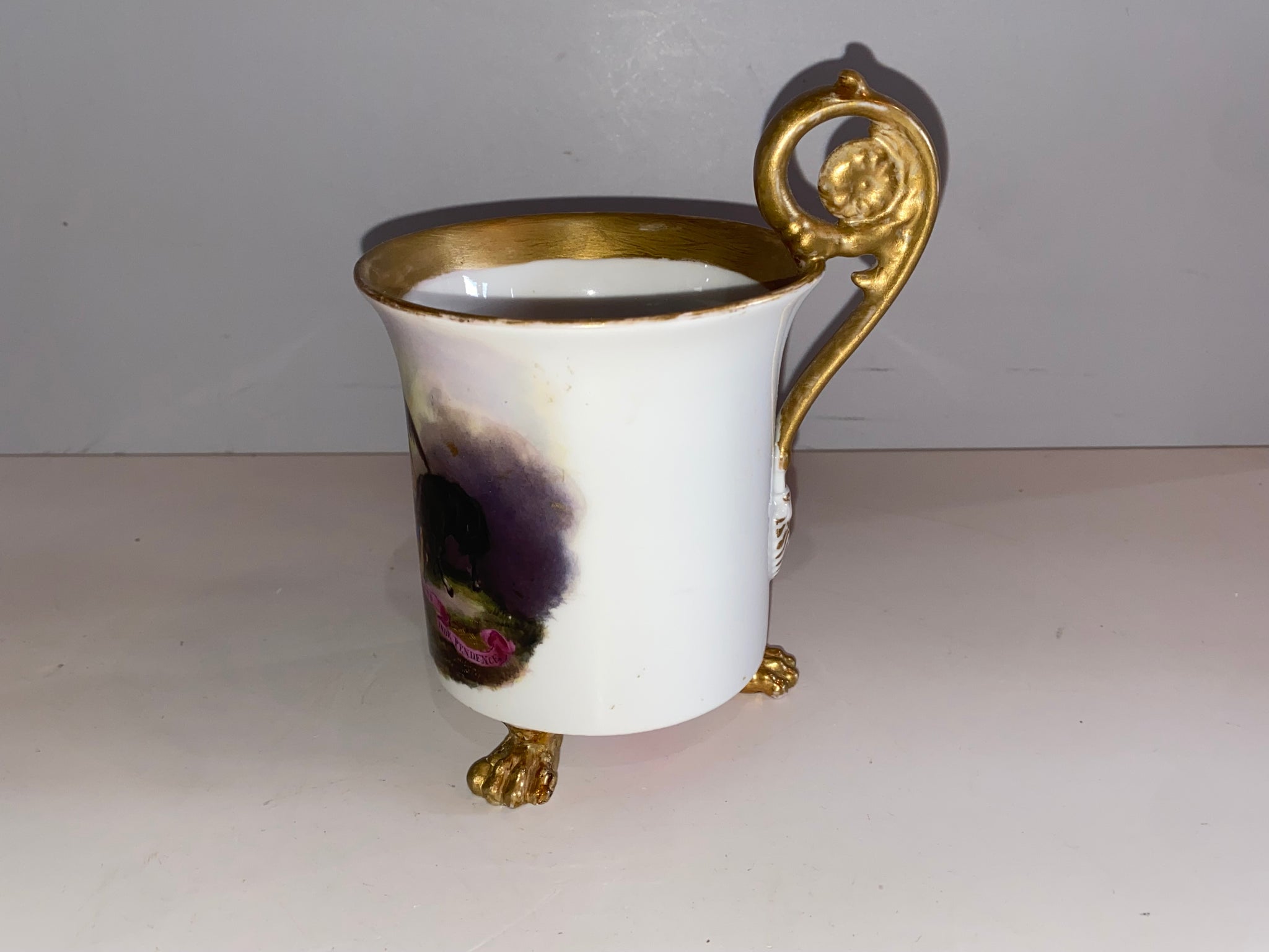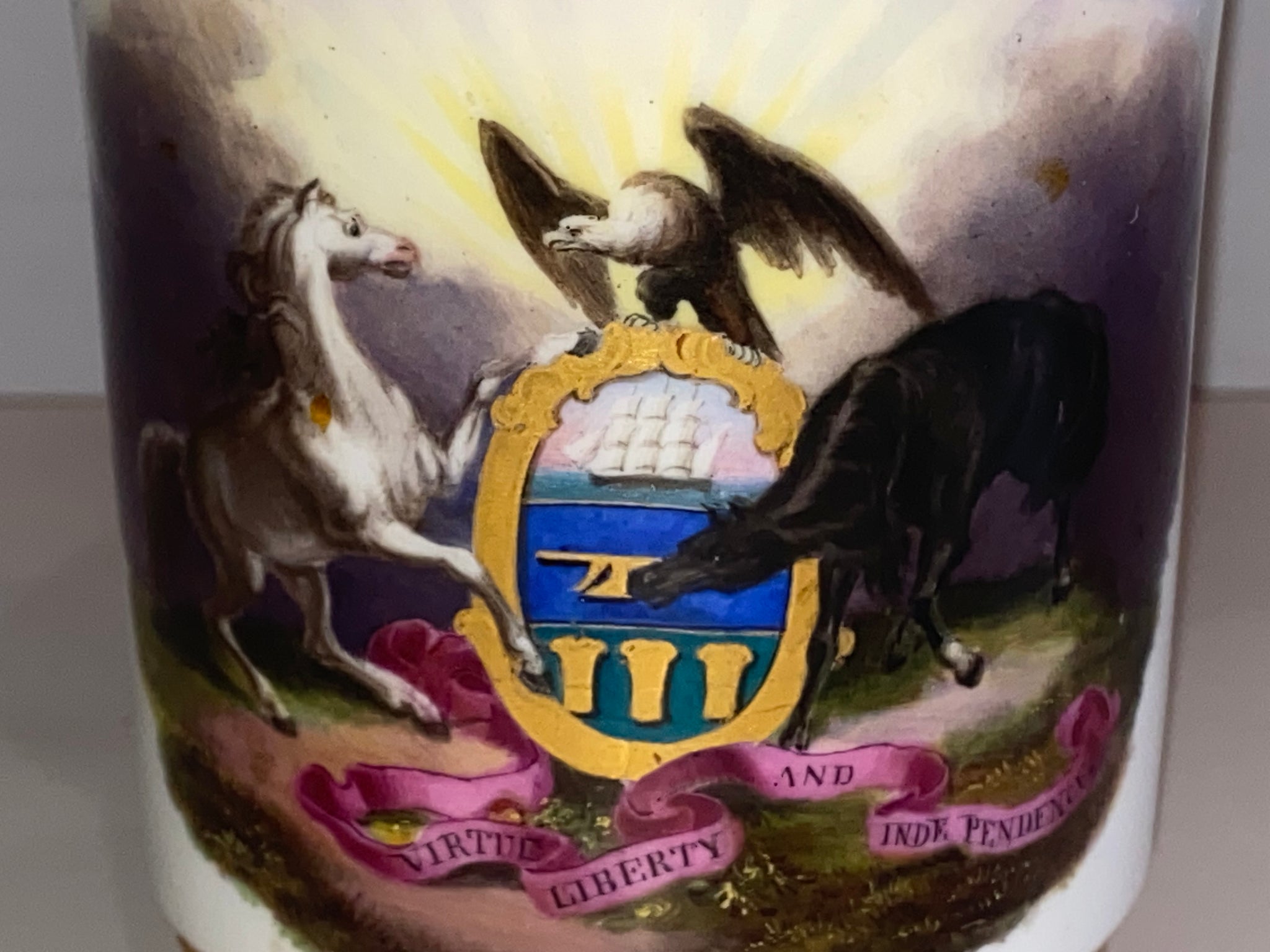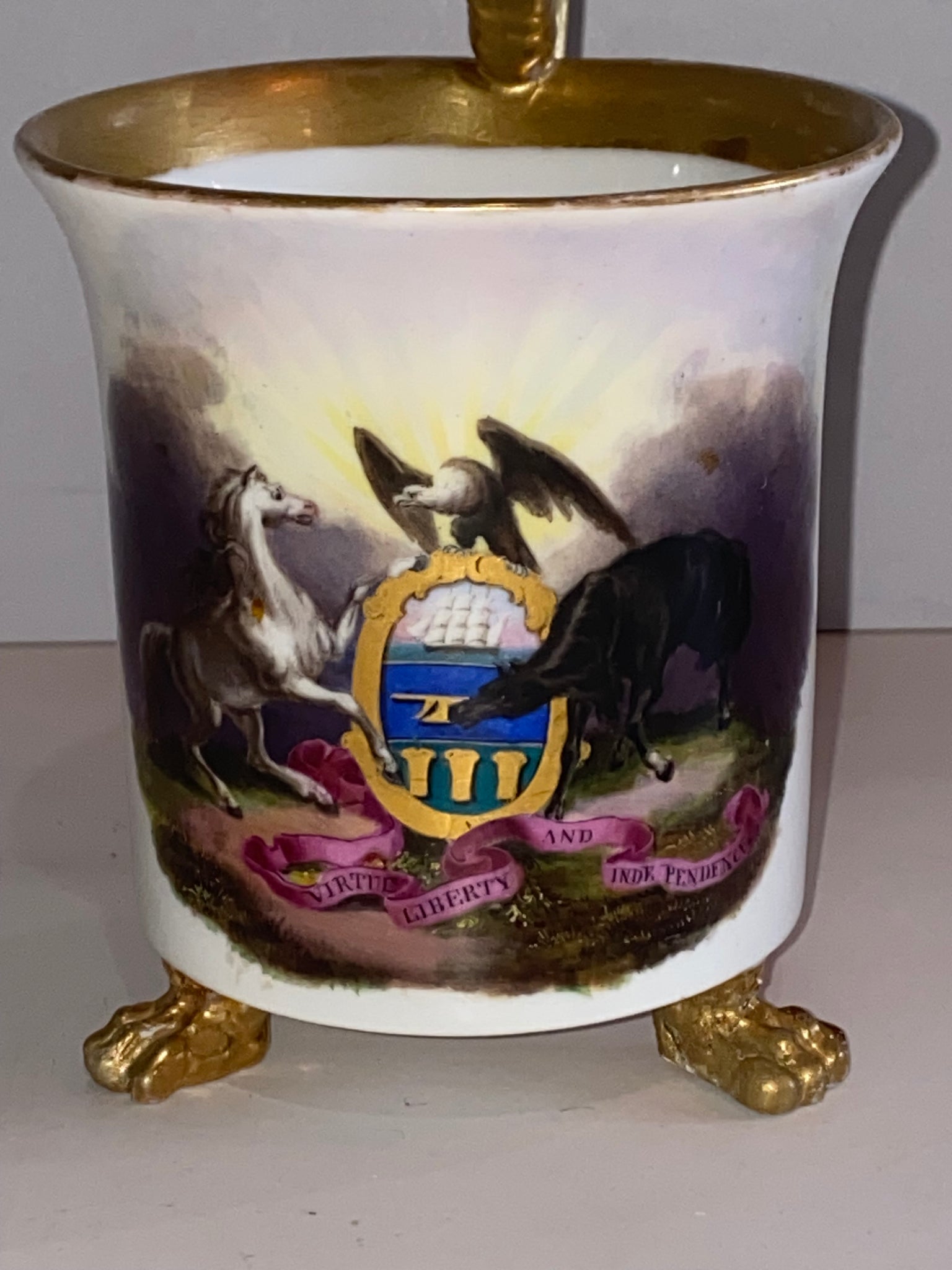 19th Century Porcelain hand painted mug with Arms of Pennsylvania. “Possibly Serves”. Very nicely painted with great detail. In perfect condition with no chips, cracks or repairs. It measures 5 1/4” tall by 3 1/2” in diameter.
