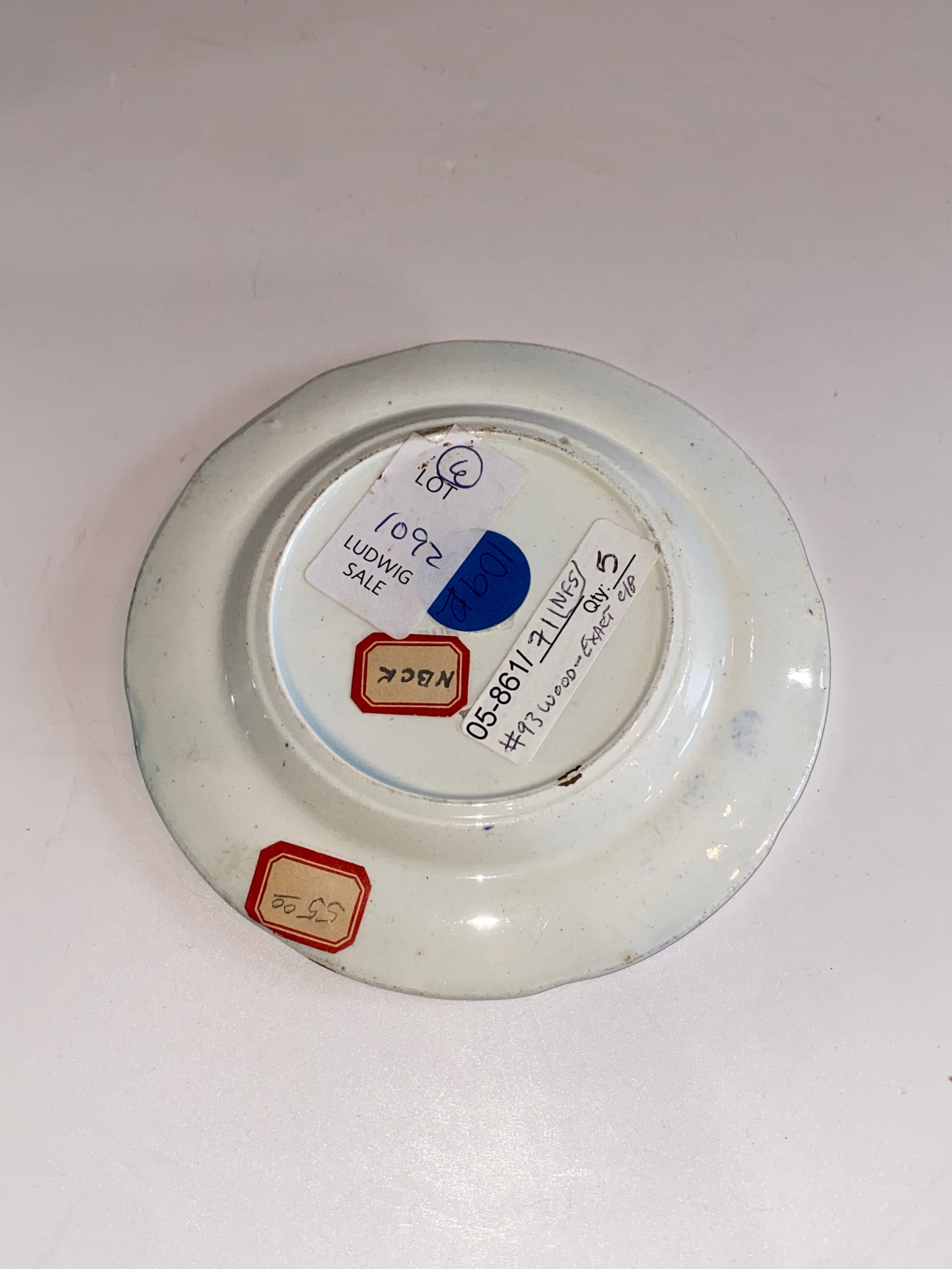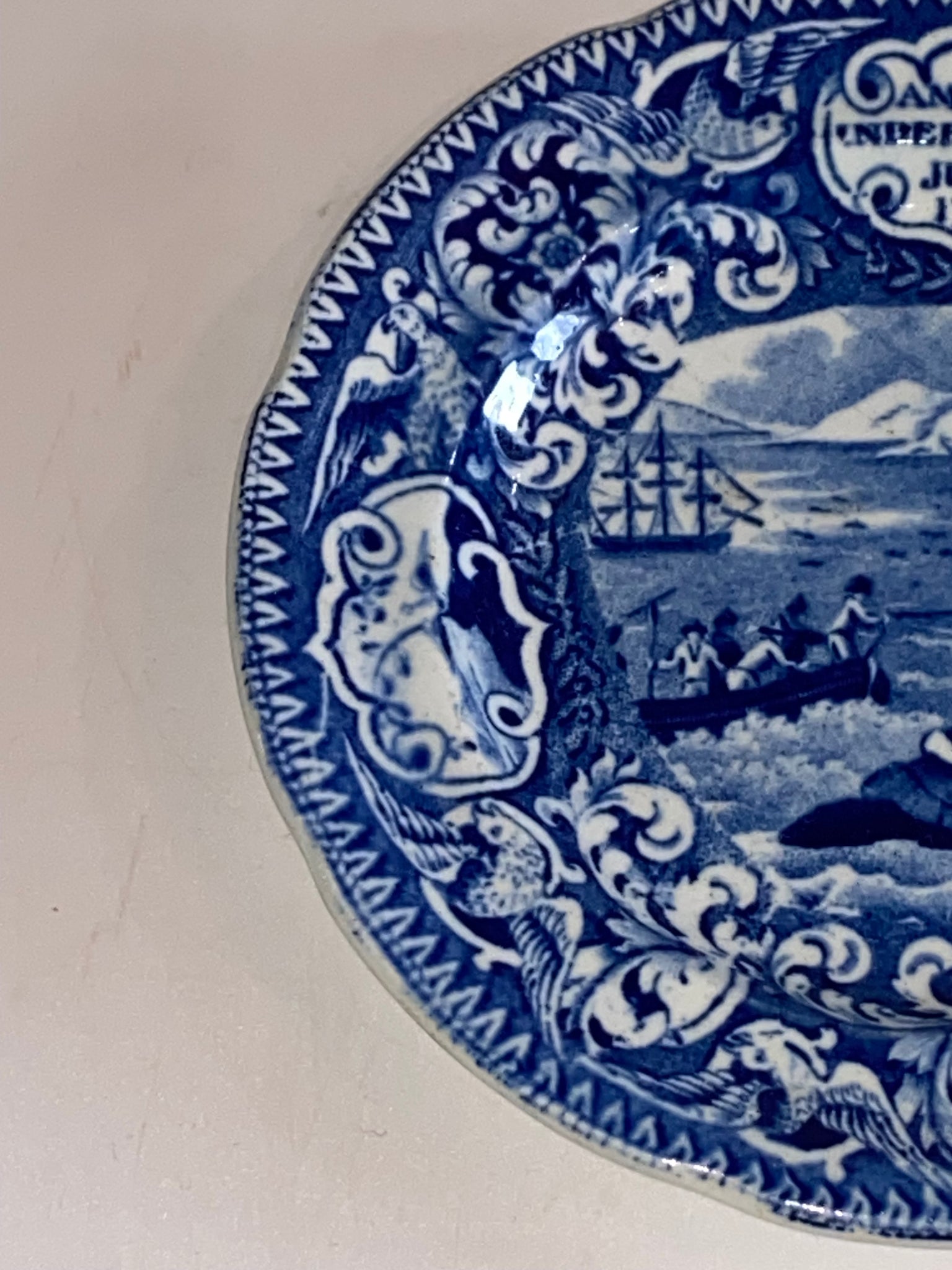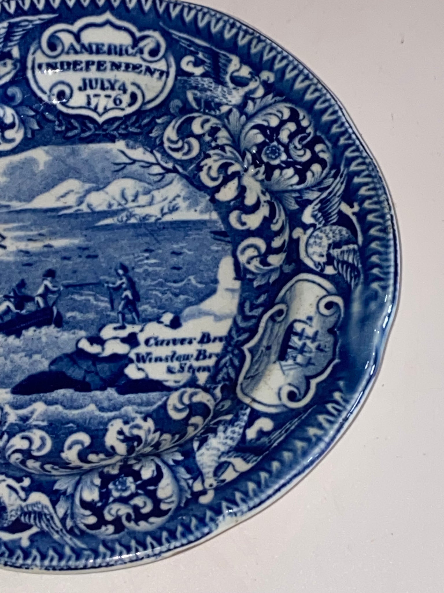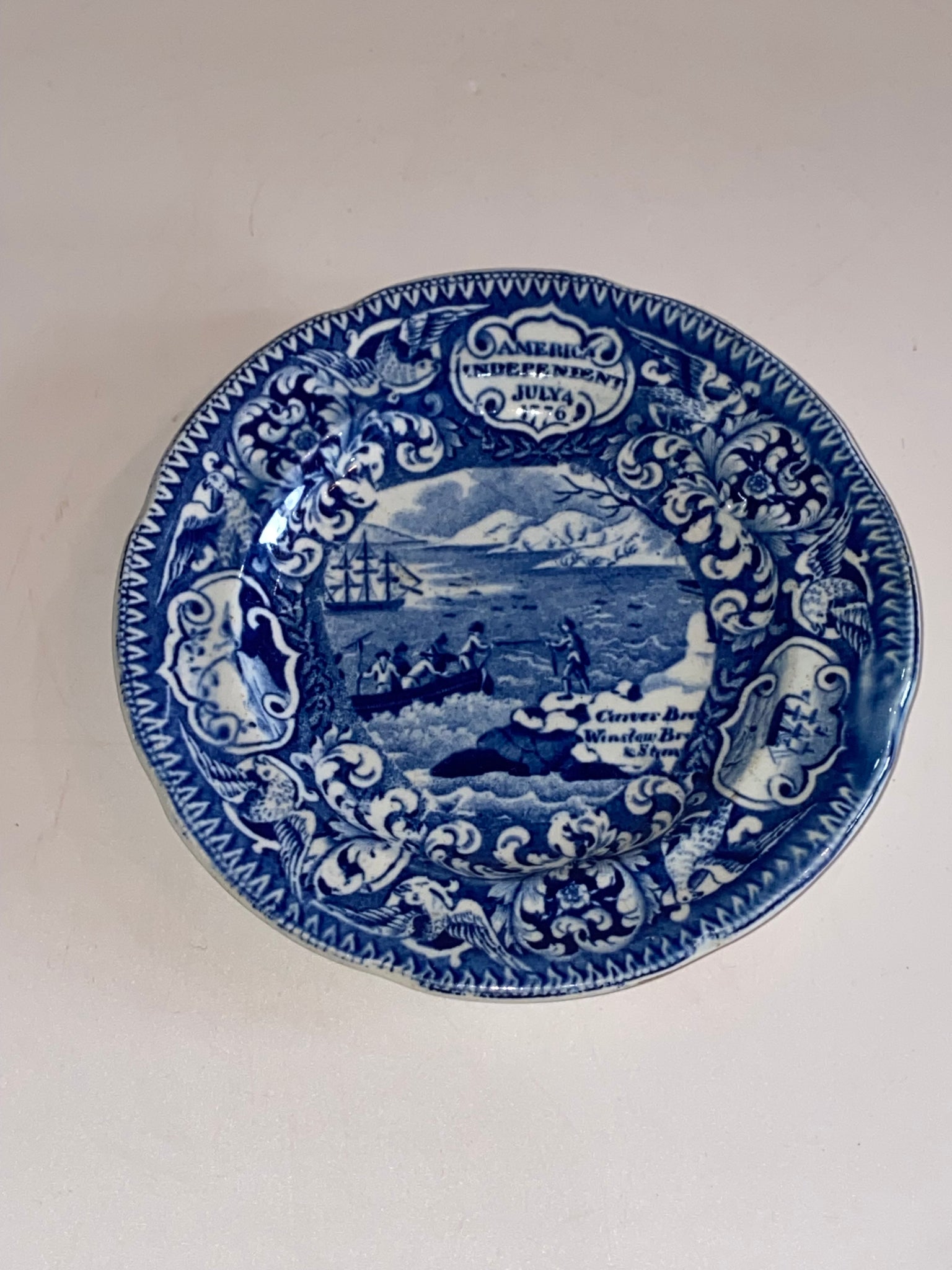 Historical Staffordshire blue cup plate in the “Pilgrim America Independence” pattern by Enoch Wood & Sons. In perfect condition with no chips, cracks or repairs. It measures 4 5/8” in diameter and dates circa 1825. This plate is the identical plate pictured in Dick Wood’s American View Cup Plate book.