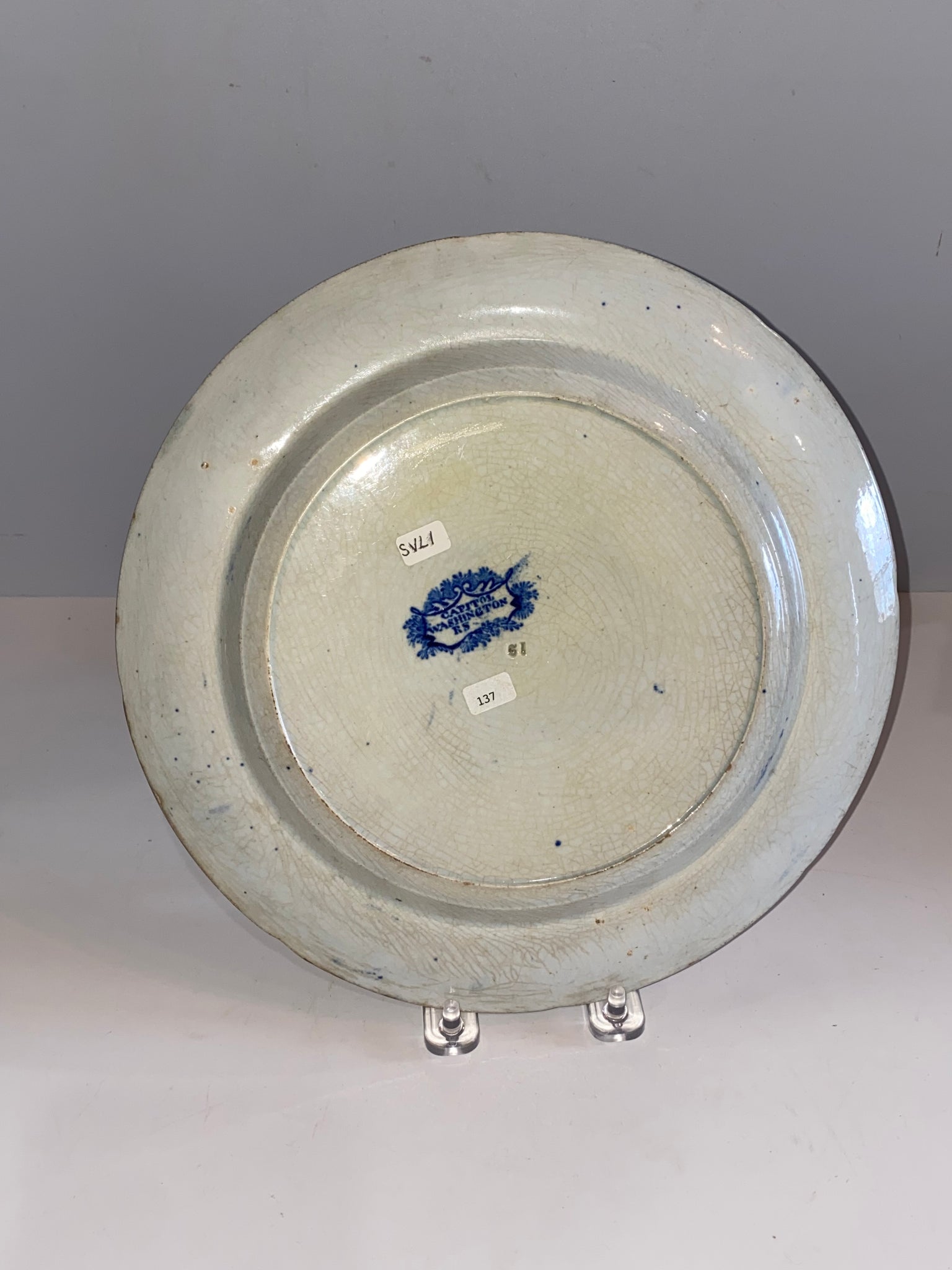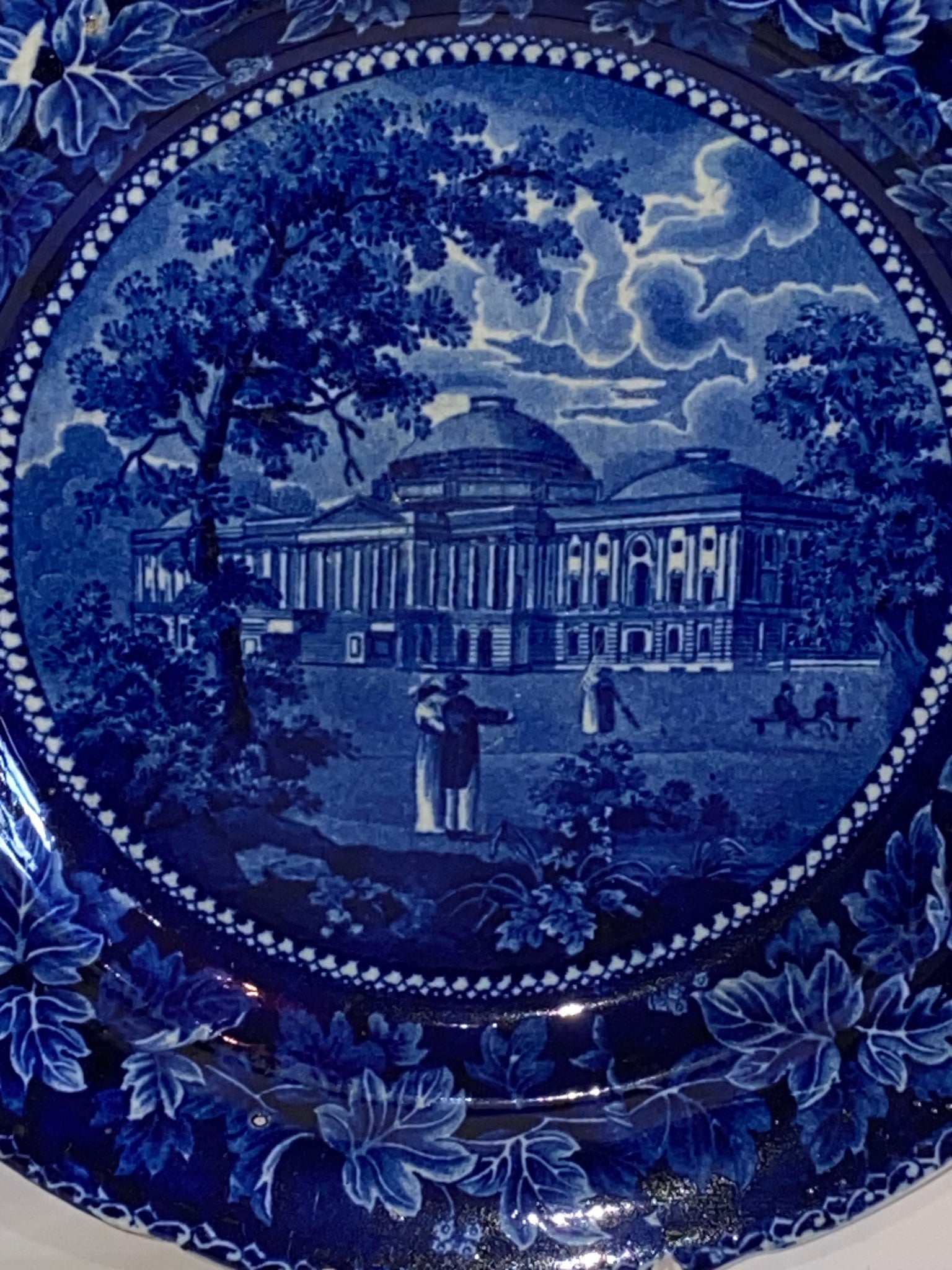 Historical Staffordshire Blue dinner plate with view of “Capital at Washington” by Ralph Stevenson. In perfect condition with no chips, cracks or repairs and appears virtually unused. It measures 10 1/8” in diameter and dates circa 1825.