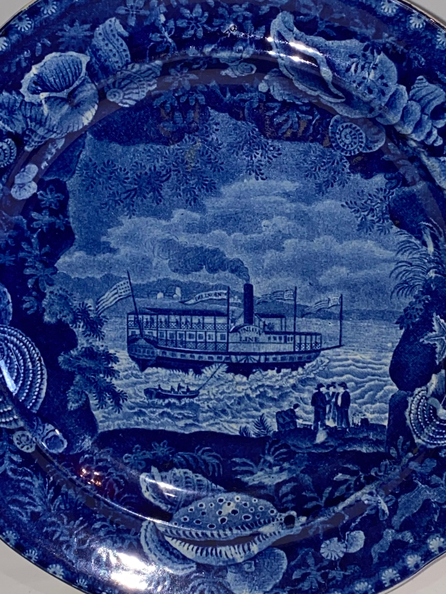 Historical Staffordshire Blue dinner plate with view of the “Union Line Ship” by Enoch Wood & Sons. In perfect condition with no chips, cracks or repairs. It measures 10 1/4” in diameter and dates circa 1825.