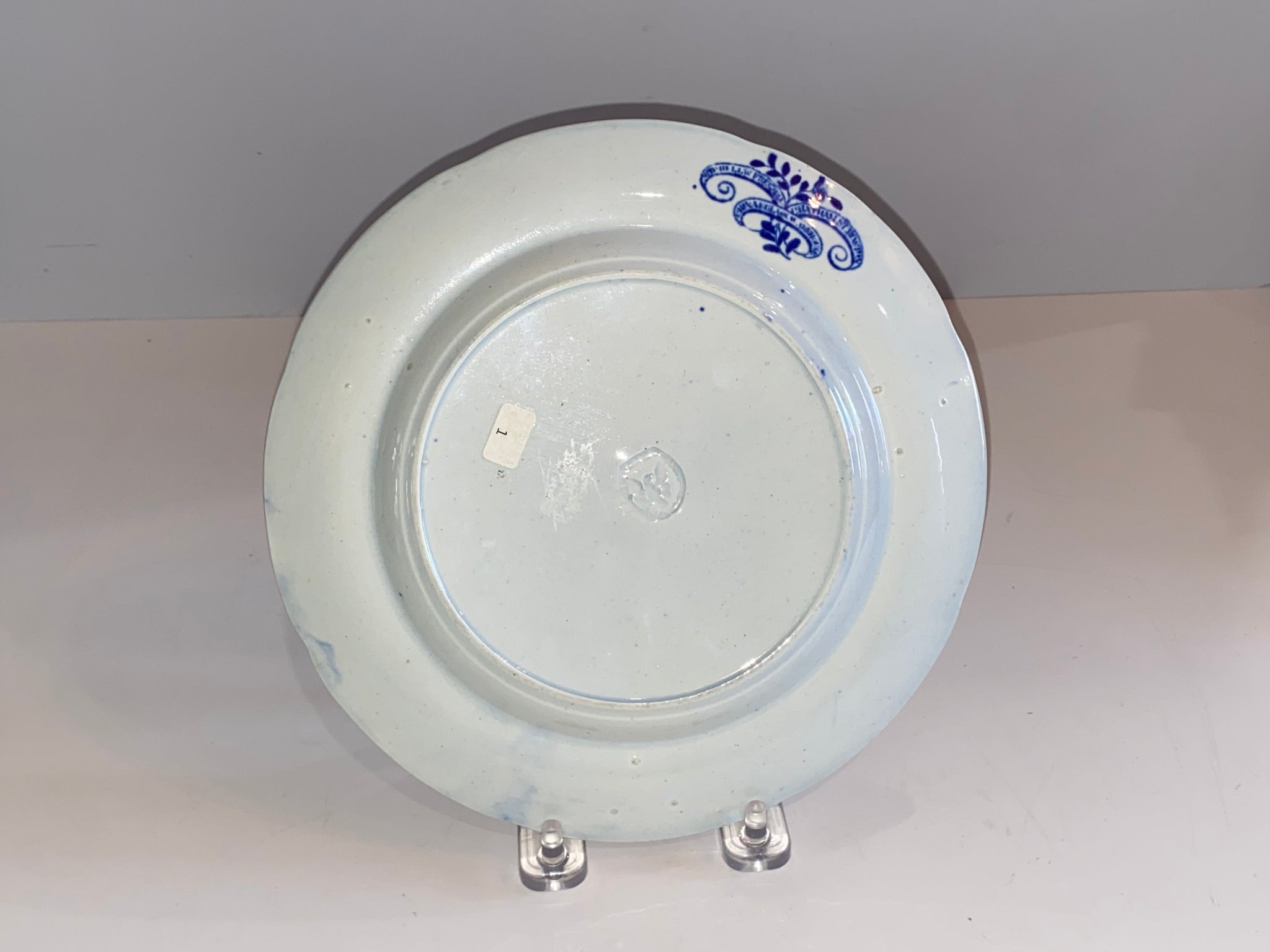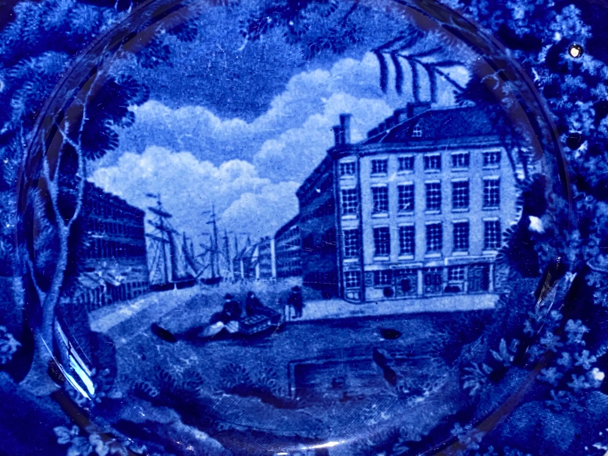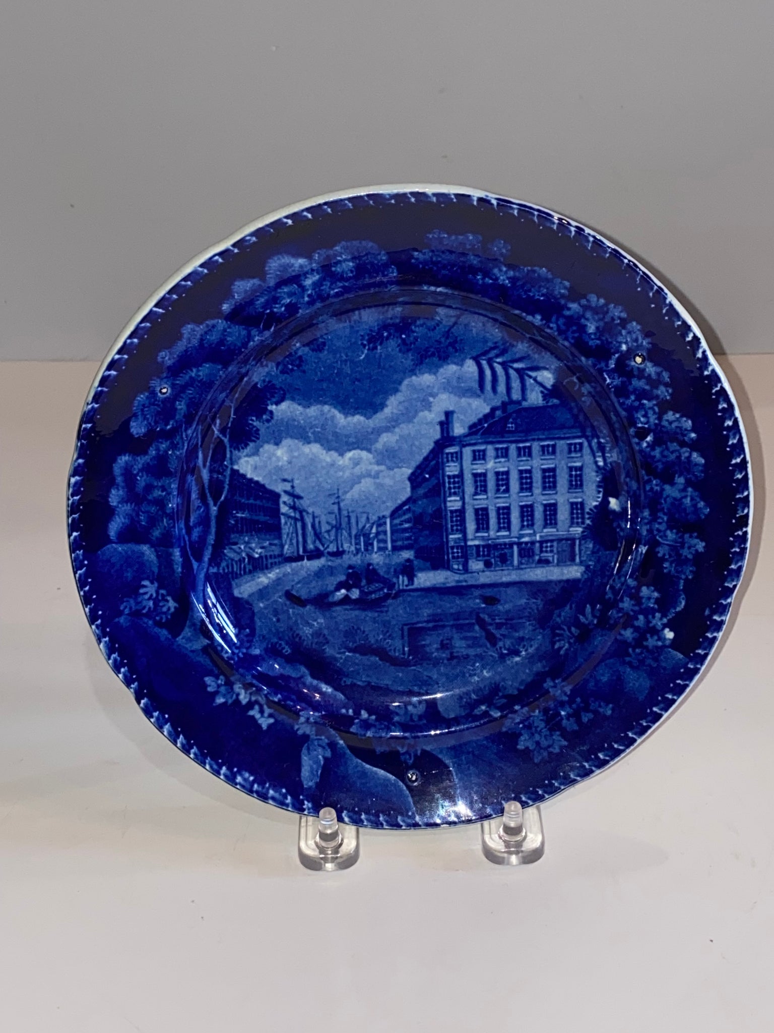 Historical Staffordshire Blue plate with a view of “Mitchell and Freemans China and Glass Warehouse, Boston”. Perfect condition with no chips, cracks or repairs but does have a few light utensil marks. It measures 7 3/4” in diameter and dates circa 1825.
