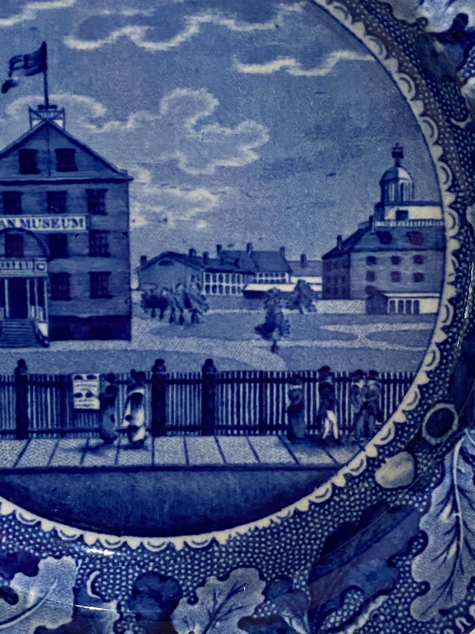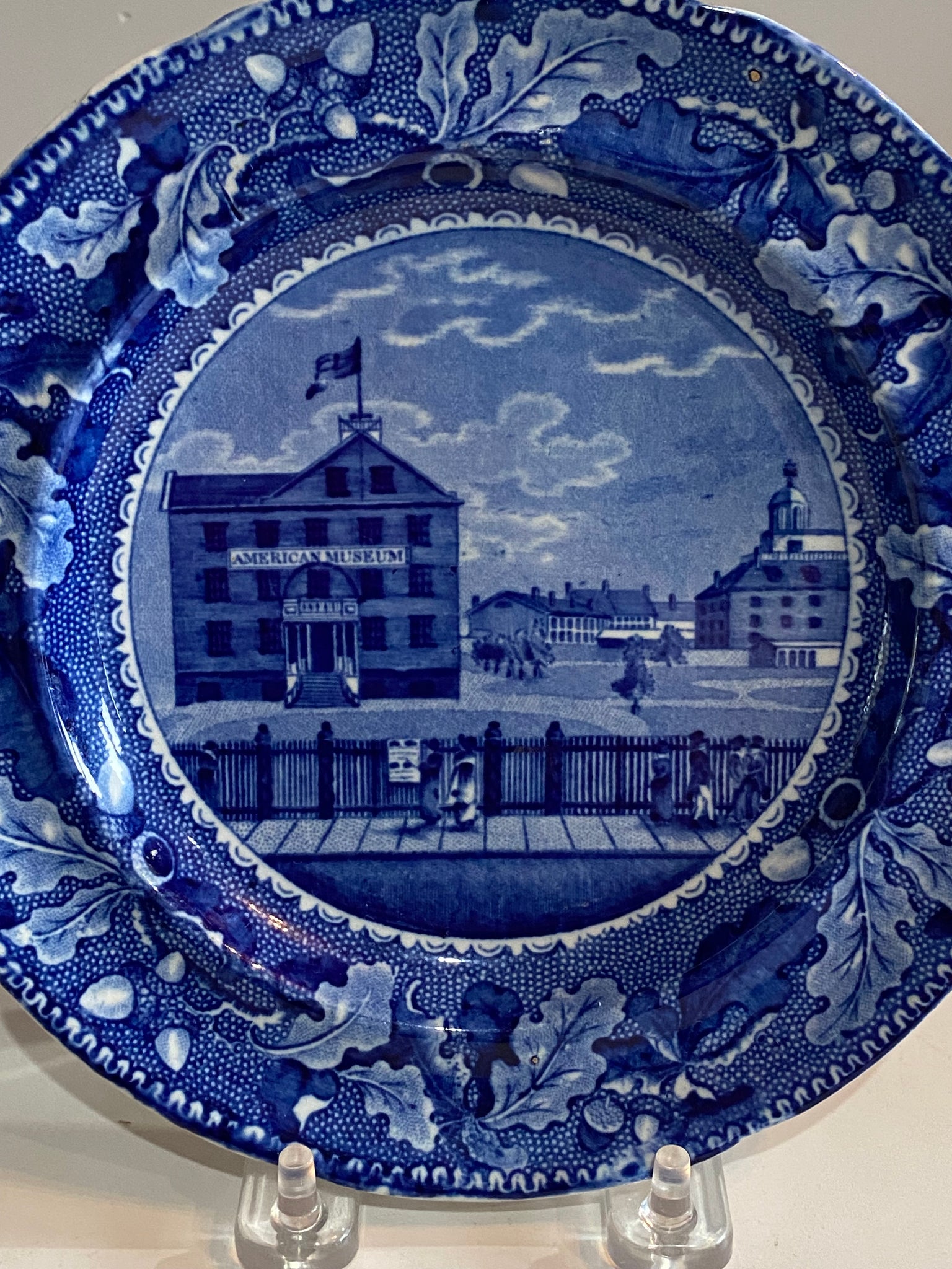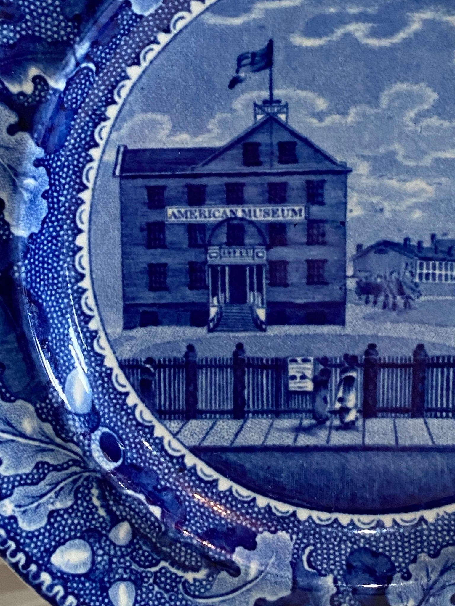 Historical Staffordshire blue plate with a view of Scudder’s American Museum by Andrew Stevenson. In perfect condition with no damage or repairs. Also appears virtually unused. It measures 7 1/4” in diameter and dates circa 1825.
