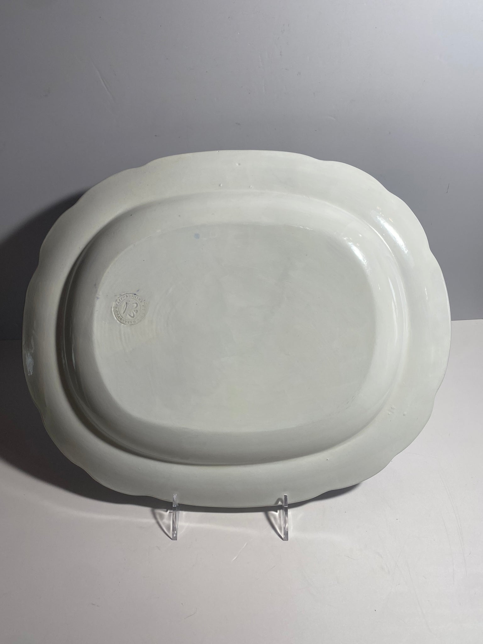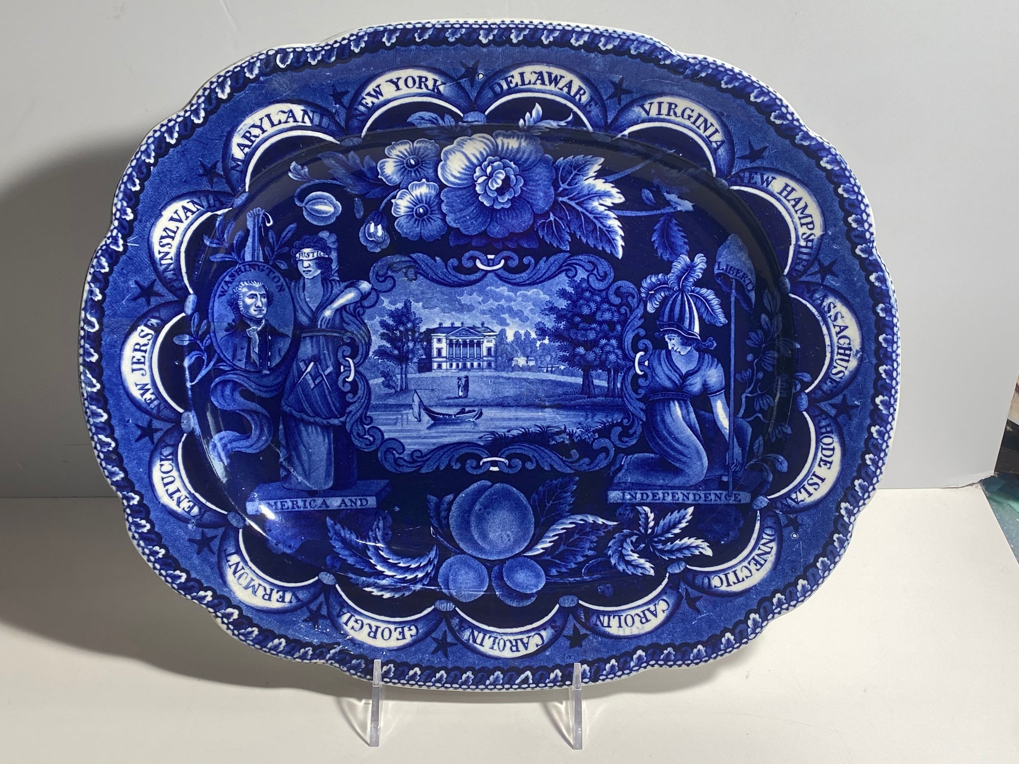 Historical Staffordshire blue platter in the “States” Series by James and Ralph Clews. This platter displays very well with a professional repair to a break. It measures 12 1/4” by 14 3/4” and dates circa 1825