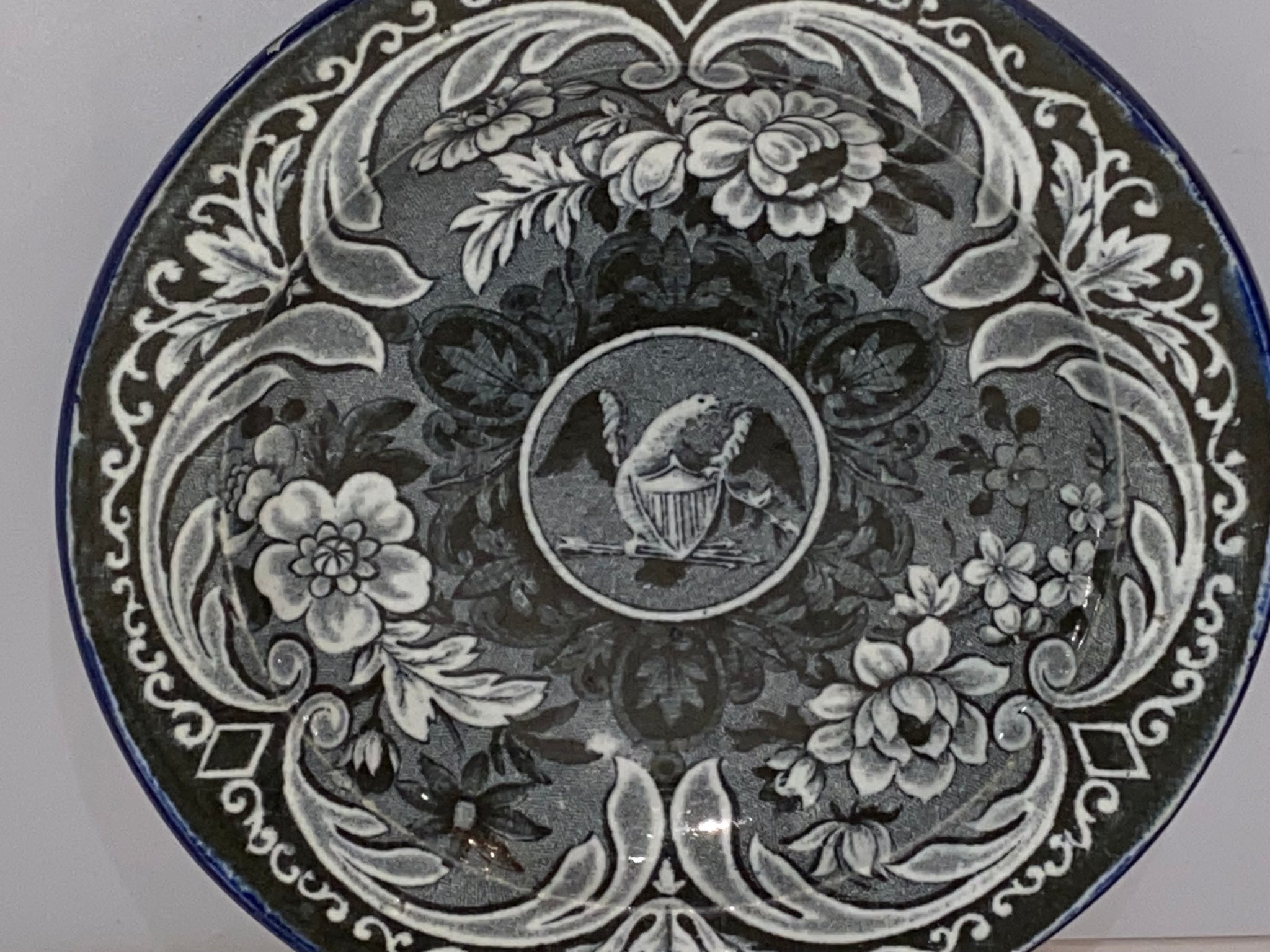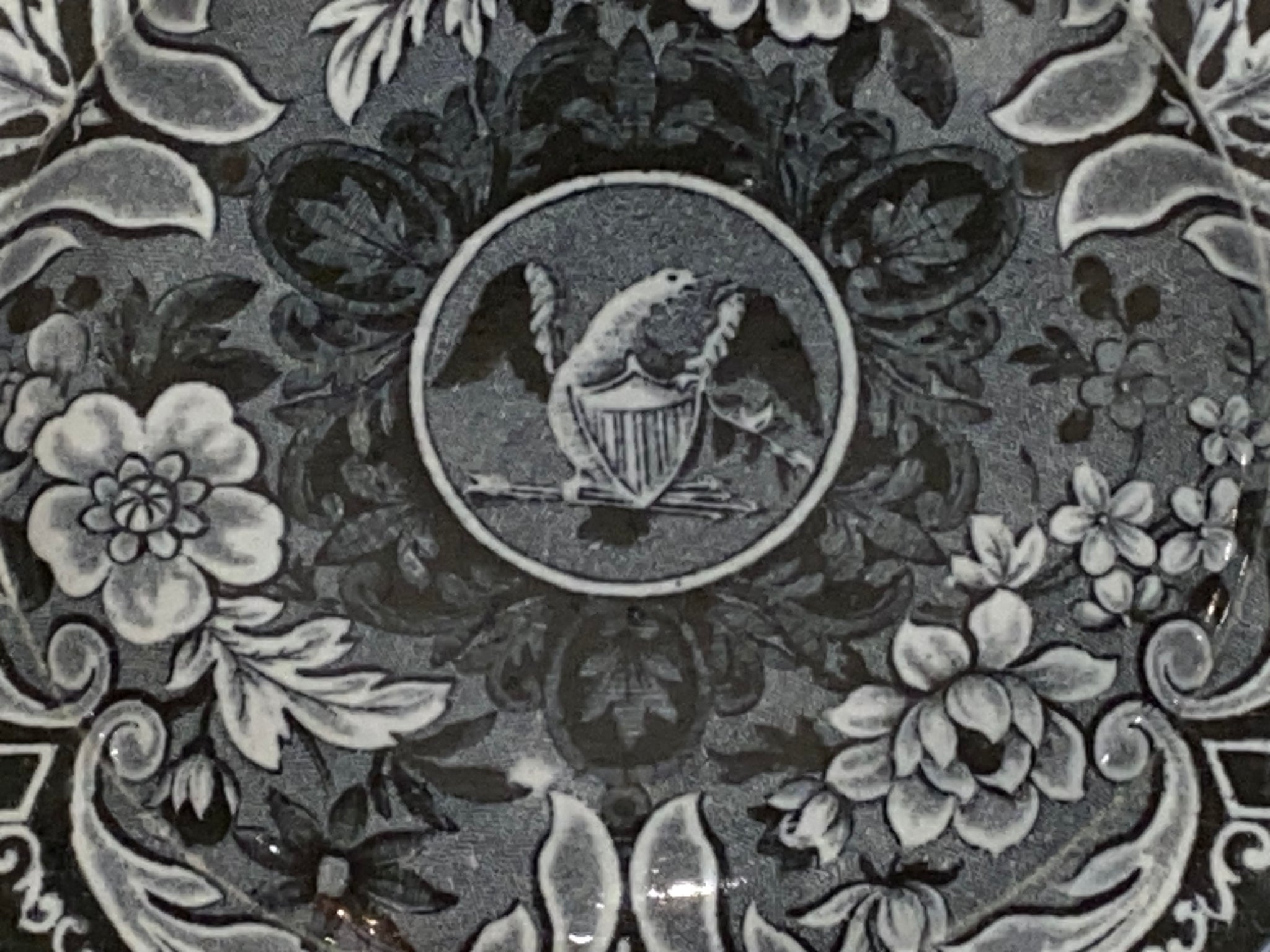 Historical Staffordshire plate in the “Seal of the United States” pattern by an unknown maker. Very scarce in brown transfer. Waste Bowls and Cups and saucers are usually in blue. It does have a blue rim. Perfect condition with no chips, cracks or repairs. It measures 6 1/2” in diameter and dates circa 1825. Ex Nick Routson Collection.