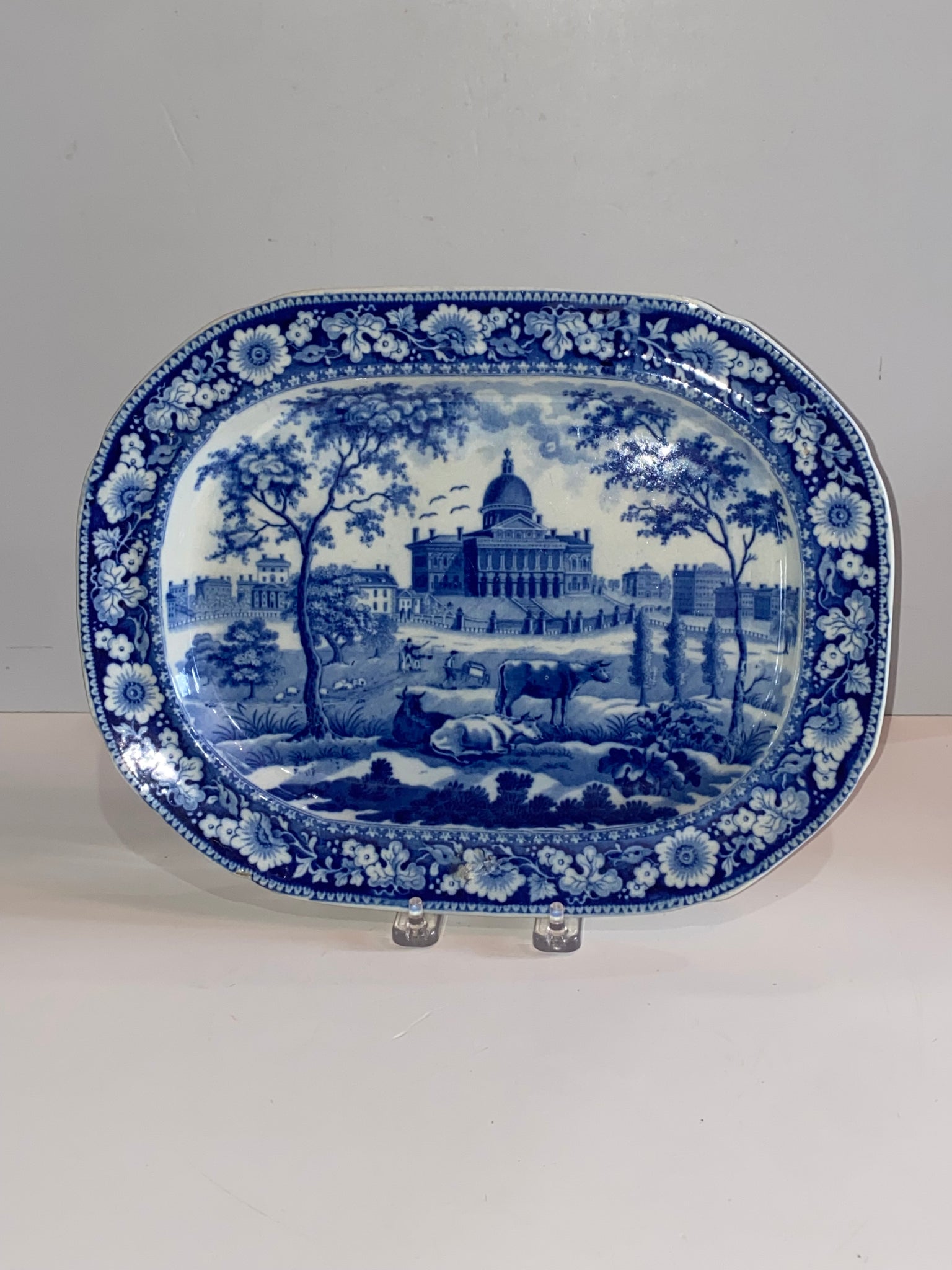 Historical Staffordshire Blue Small platter in the “Boston State House” pattern by Rogers. In perfect condition with no chips, cracks or repairs. It measures 9 7/8” by 12 5/8” and dates circa 1825.