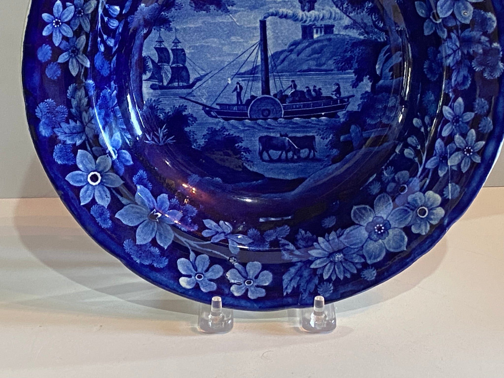 Historical Staffordshire Blue soup plate with a view of “Fulton Steamboat” from the Diorama Series. In perfect condition with no chips, cracks or repairs and appears unused. It measures 10 1/4” in diameter and dates circa 1825.