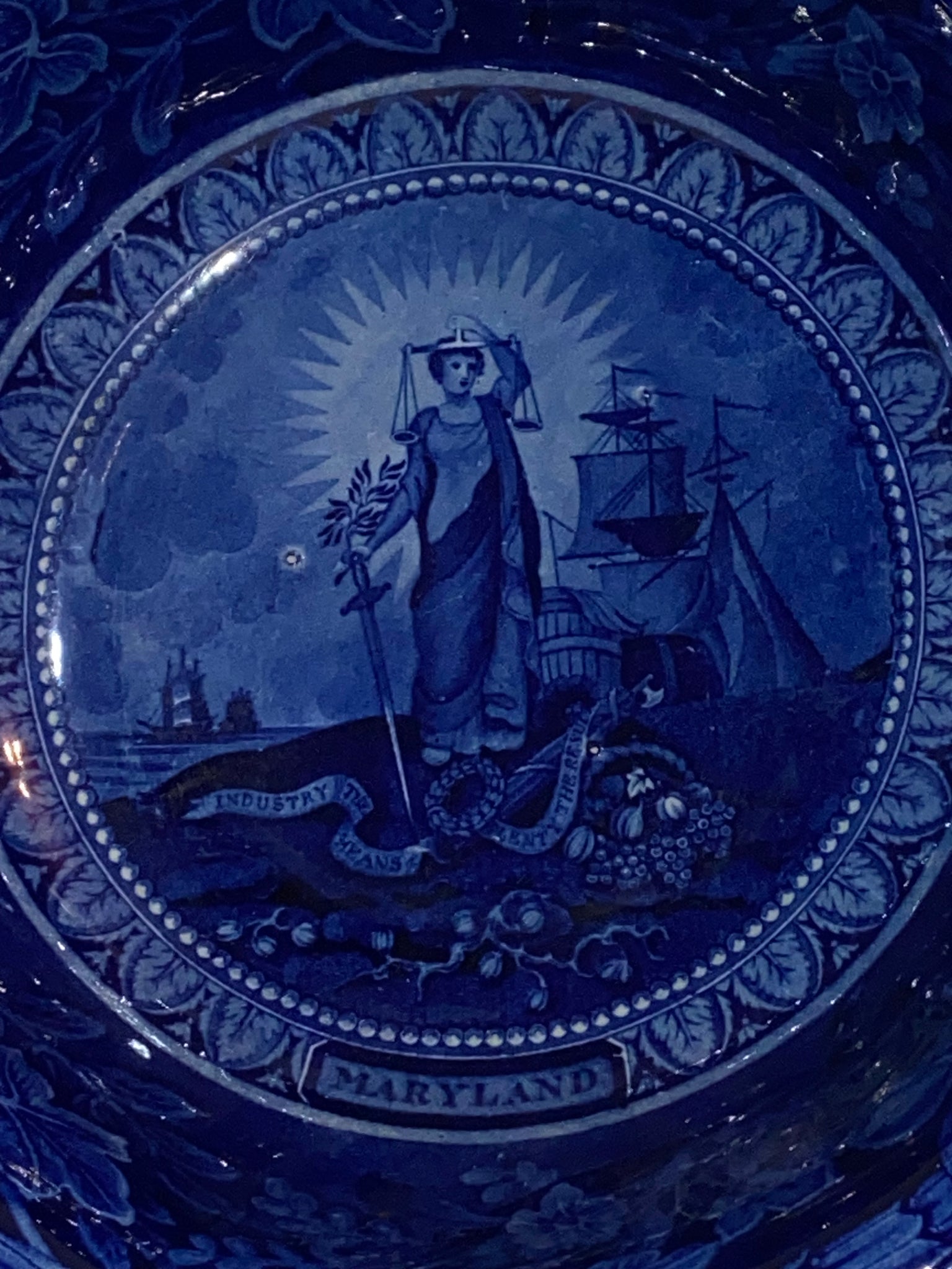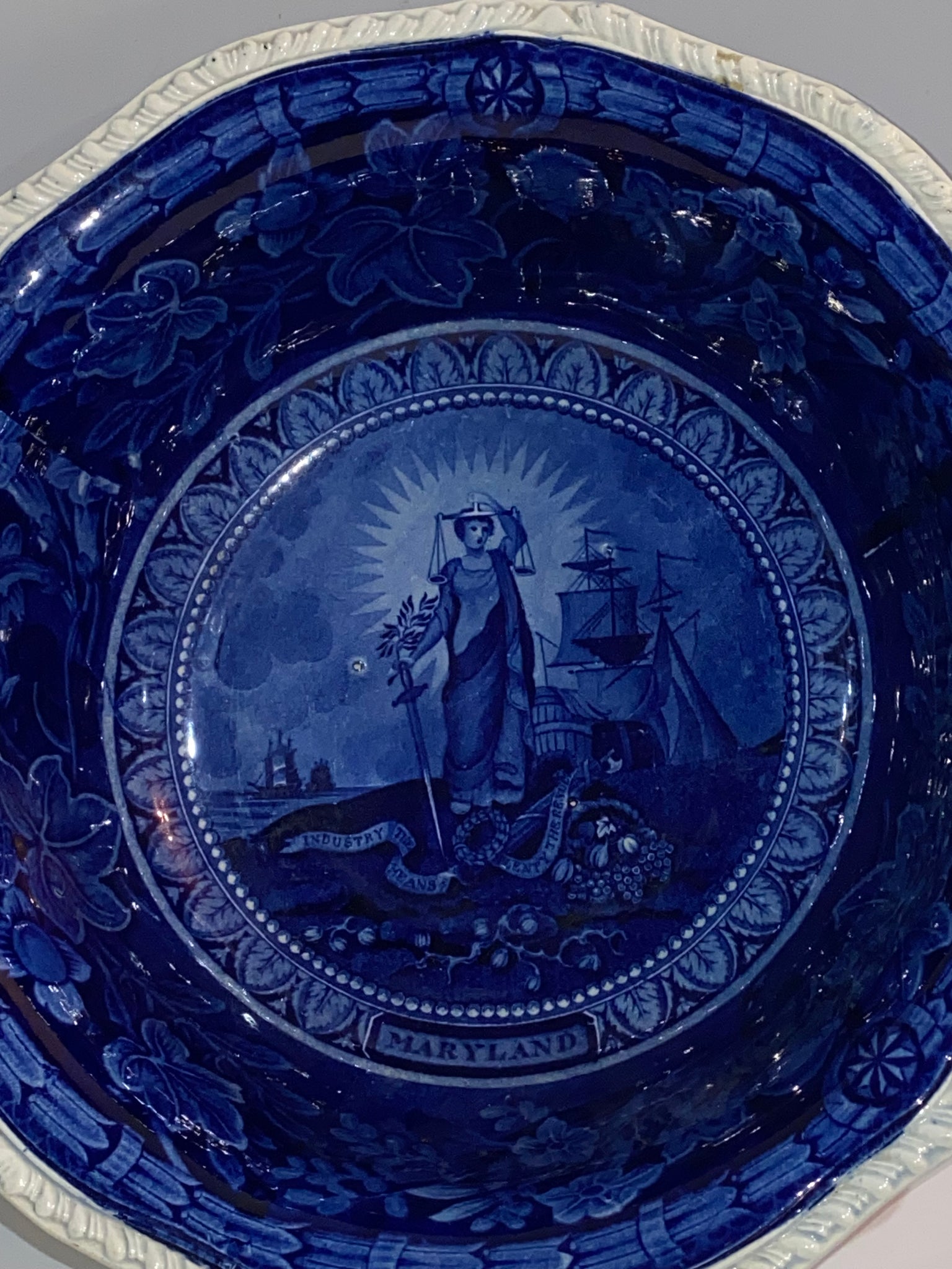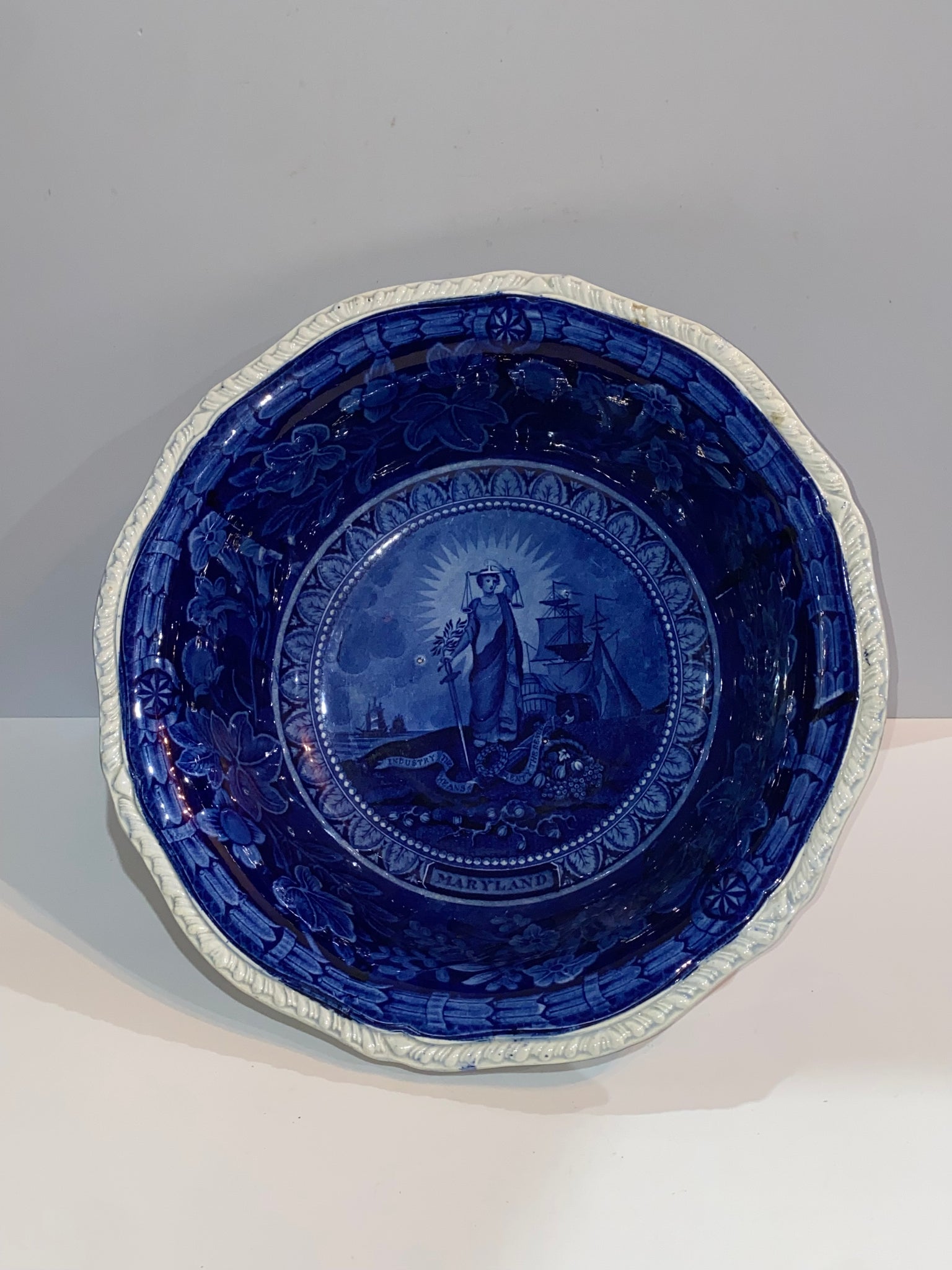 Historical Staffordshire wash bowl with the “Arms of Maryland” from Thomas Mayer’s Arms of the States series. In very nice condition with 2 chips that are on the underside. There are no cracks or repairs. The interior of the bowl has a high shiny glaze and appears virtually unused. It measures 4 1/2” tall by 13” in diameter and dates circa 1825. Ex. Buddy Zamoiski Collection.