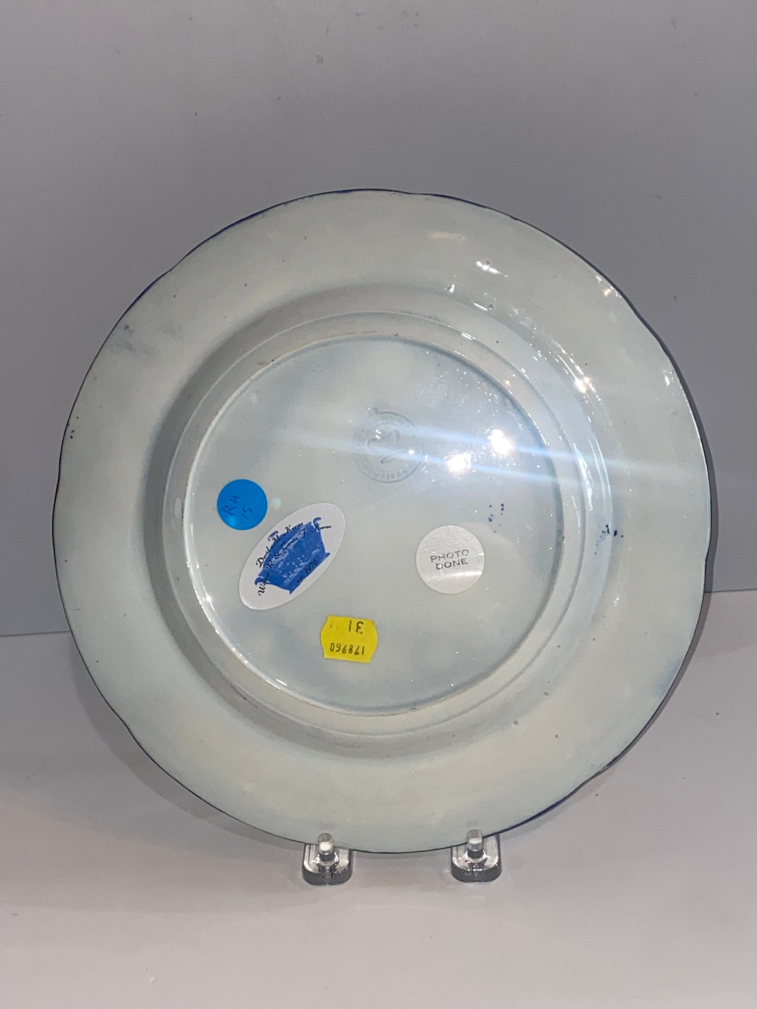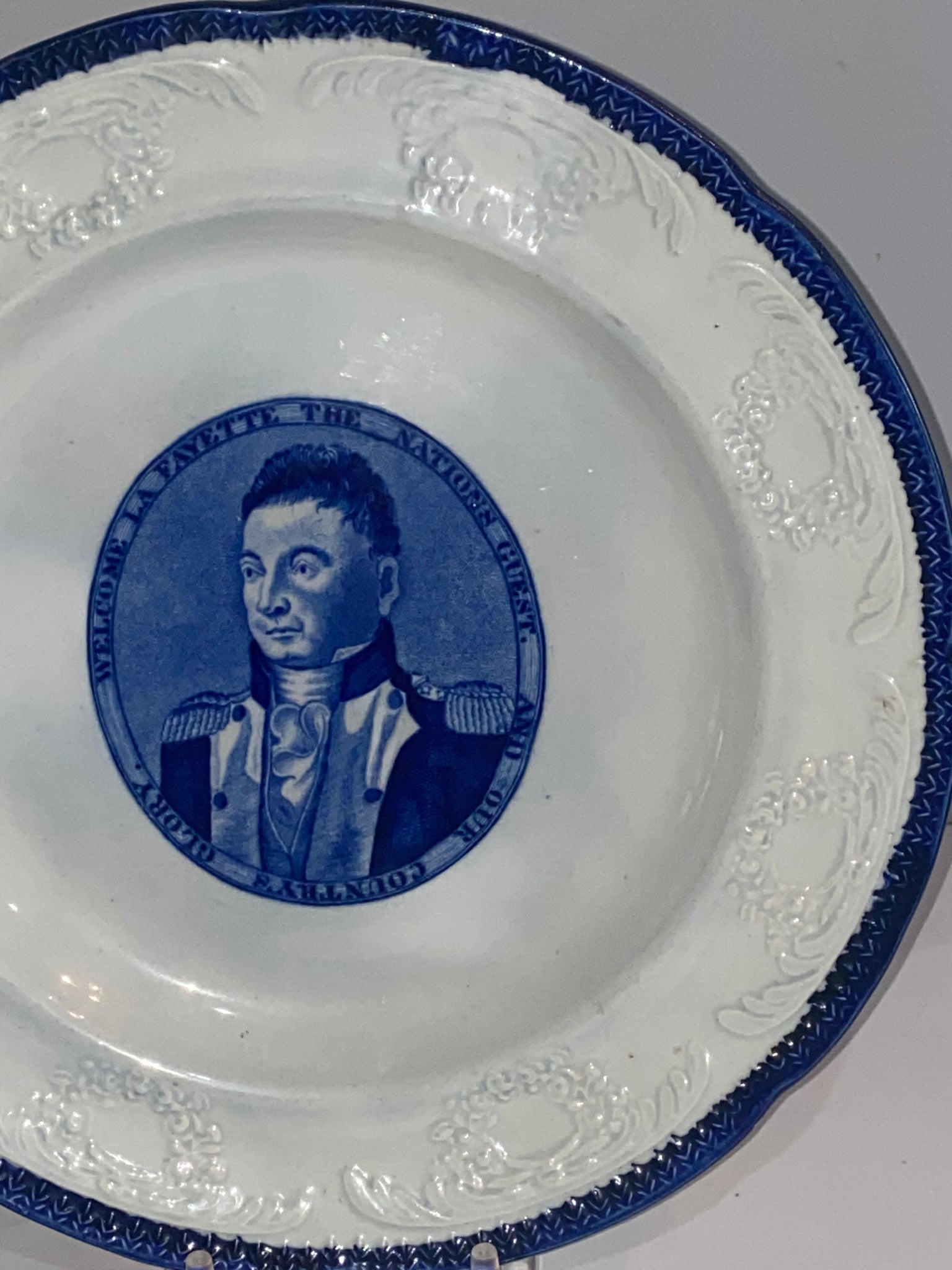 Historical Staffordshire blue dinner plate with transfer of “Welcome Lafayette The Nations Guest and our Country’s Glory”. This plate displays as perfect with a professionally restored hairline. It measures 10” in diameter and dates circa 1825.