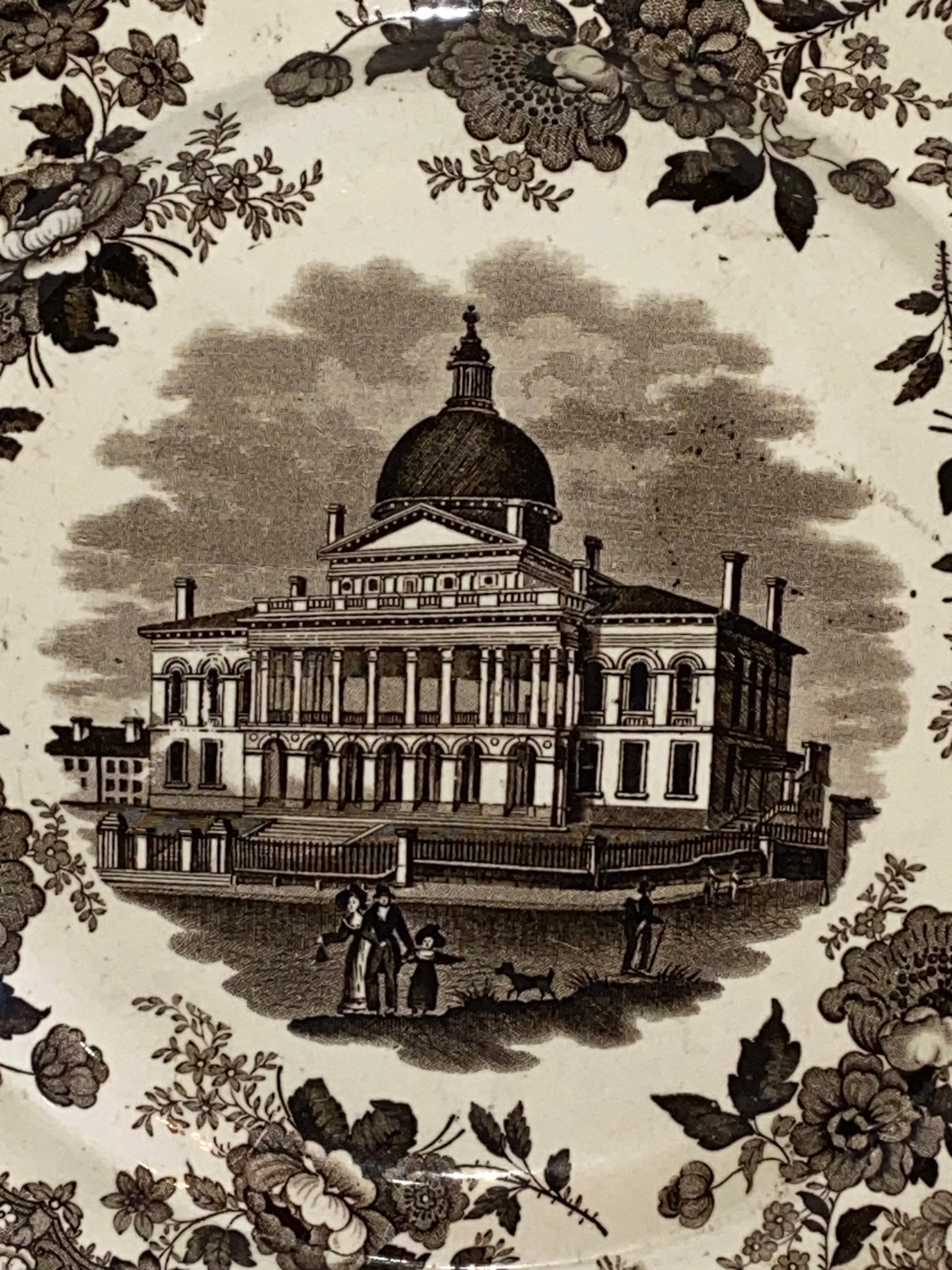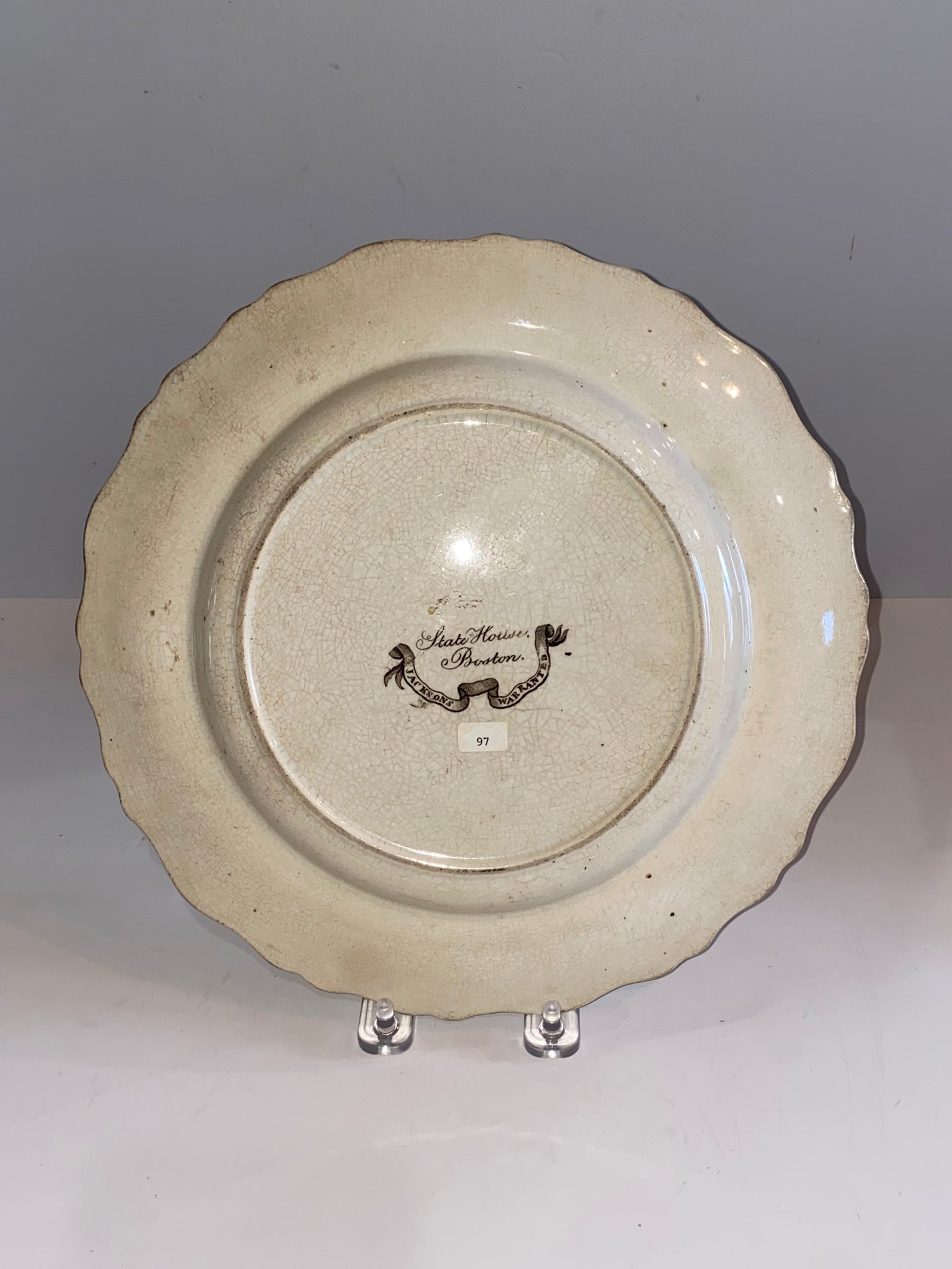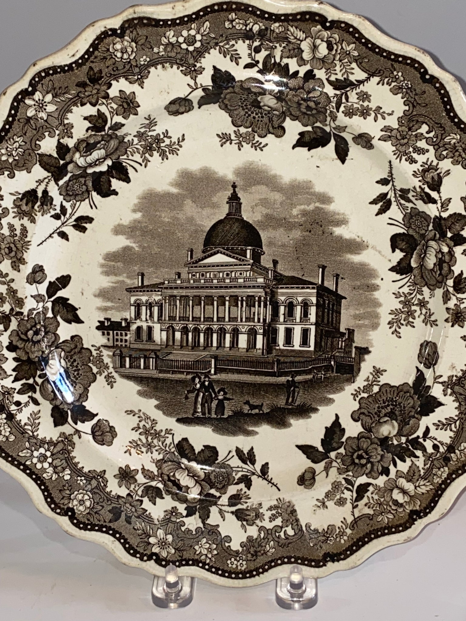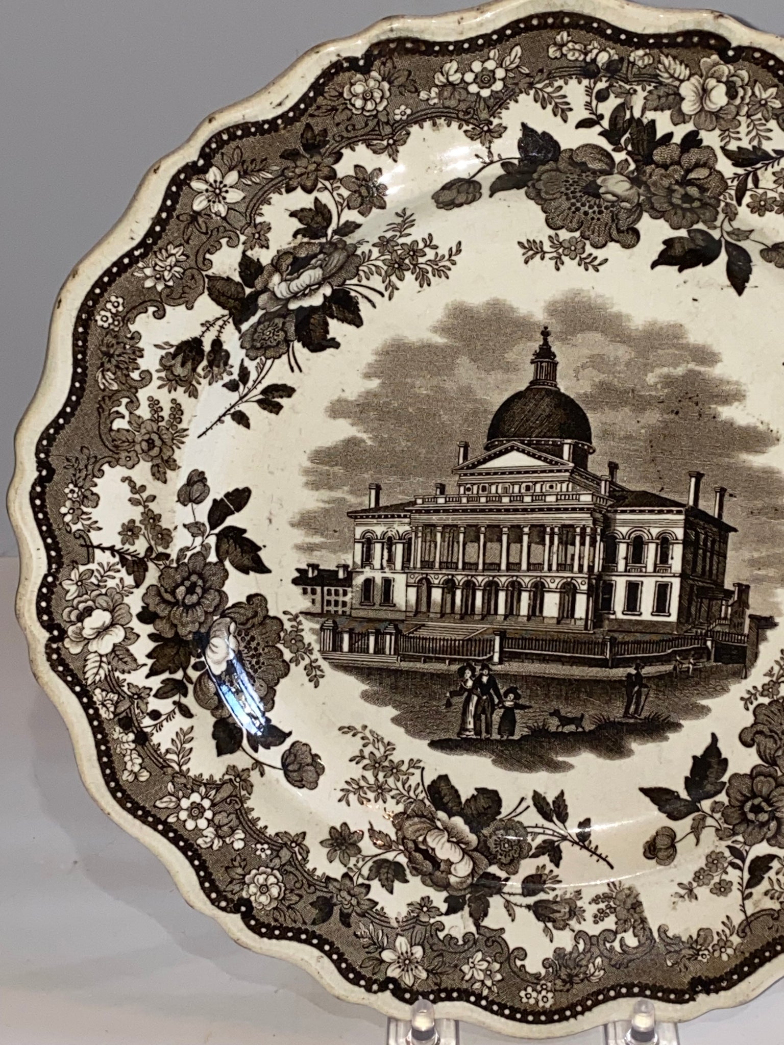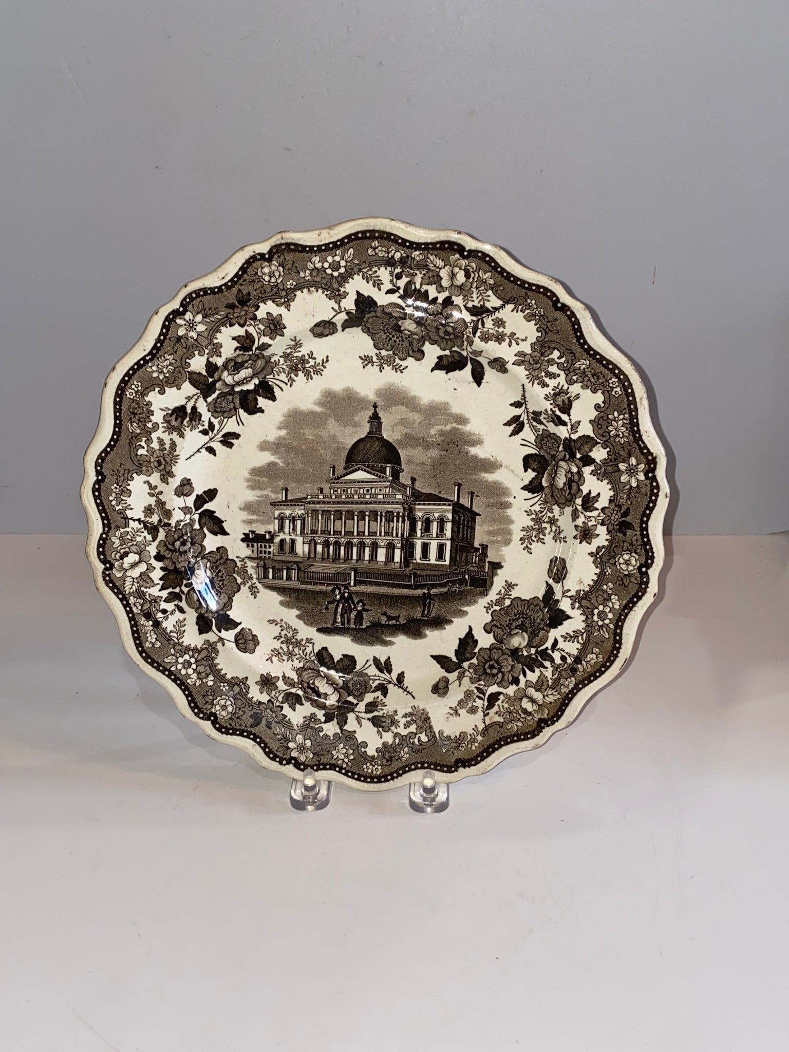 Historical Staffordshire brown transfer dinner plate with view of “The Boston State House” by Jackson. In perfect condition with no chips, cracks or repairs. Does have some minor stains that can be cleaned out. It measures 10 1/4” in diameter and dates circa 1835.