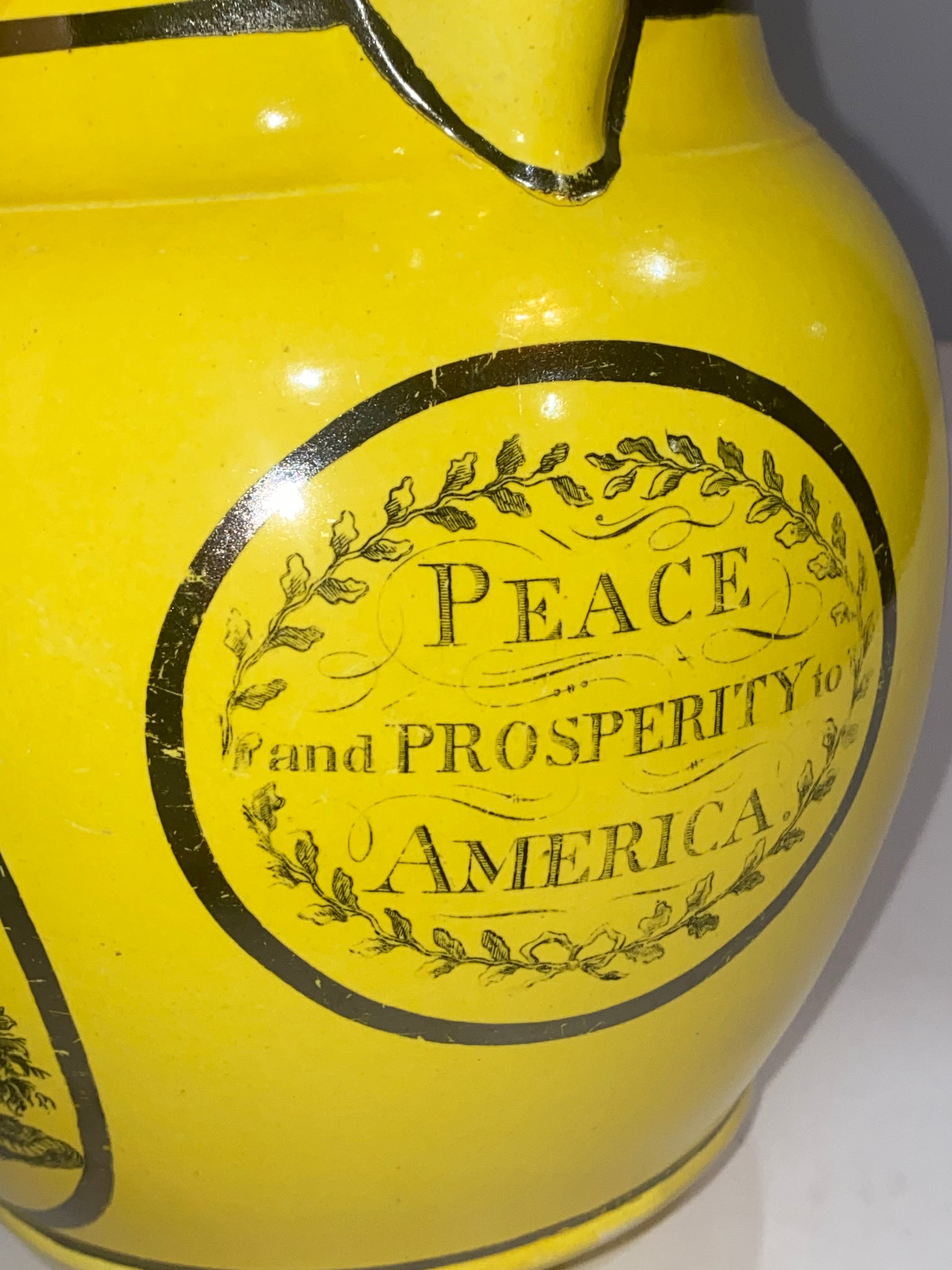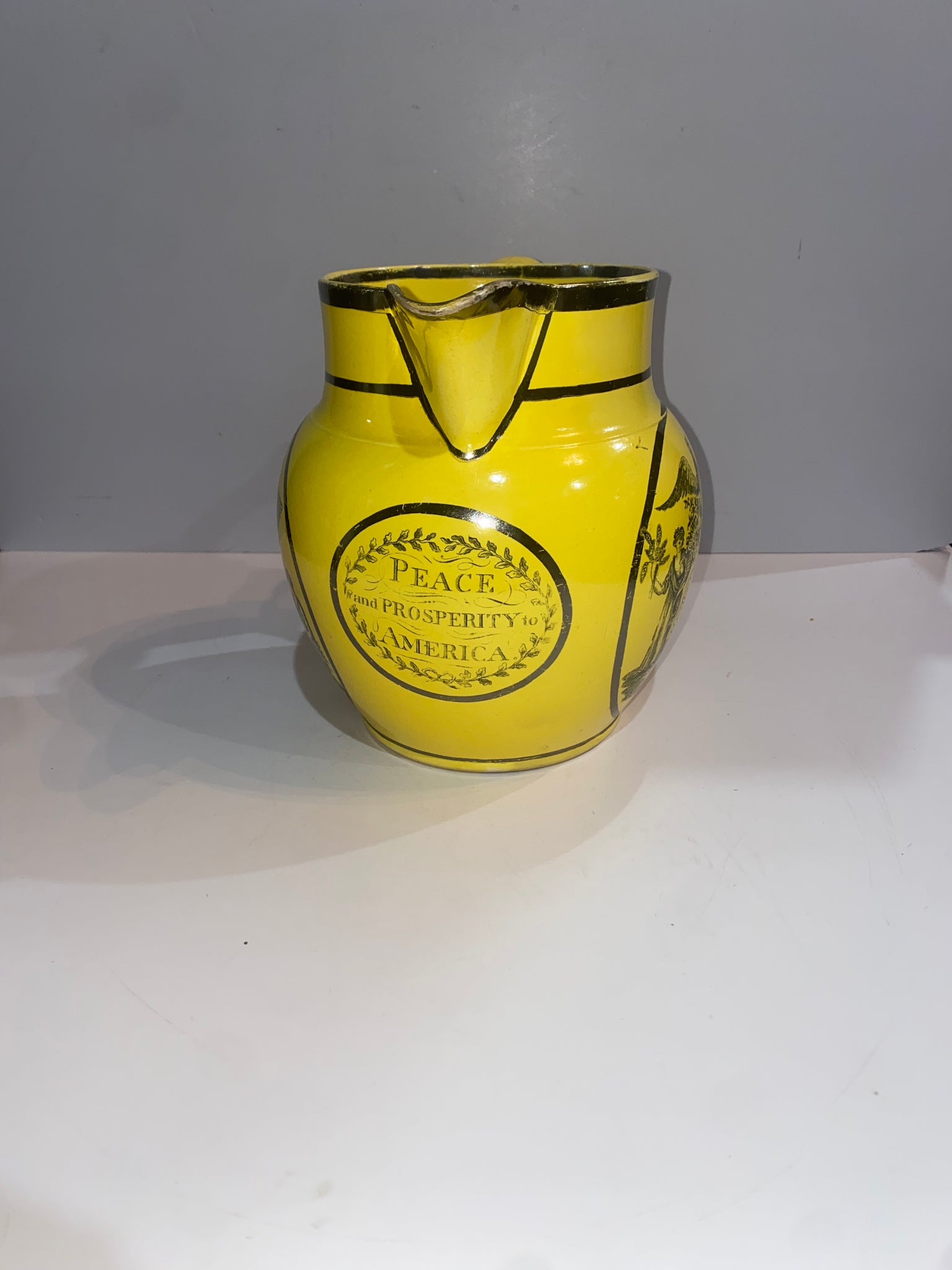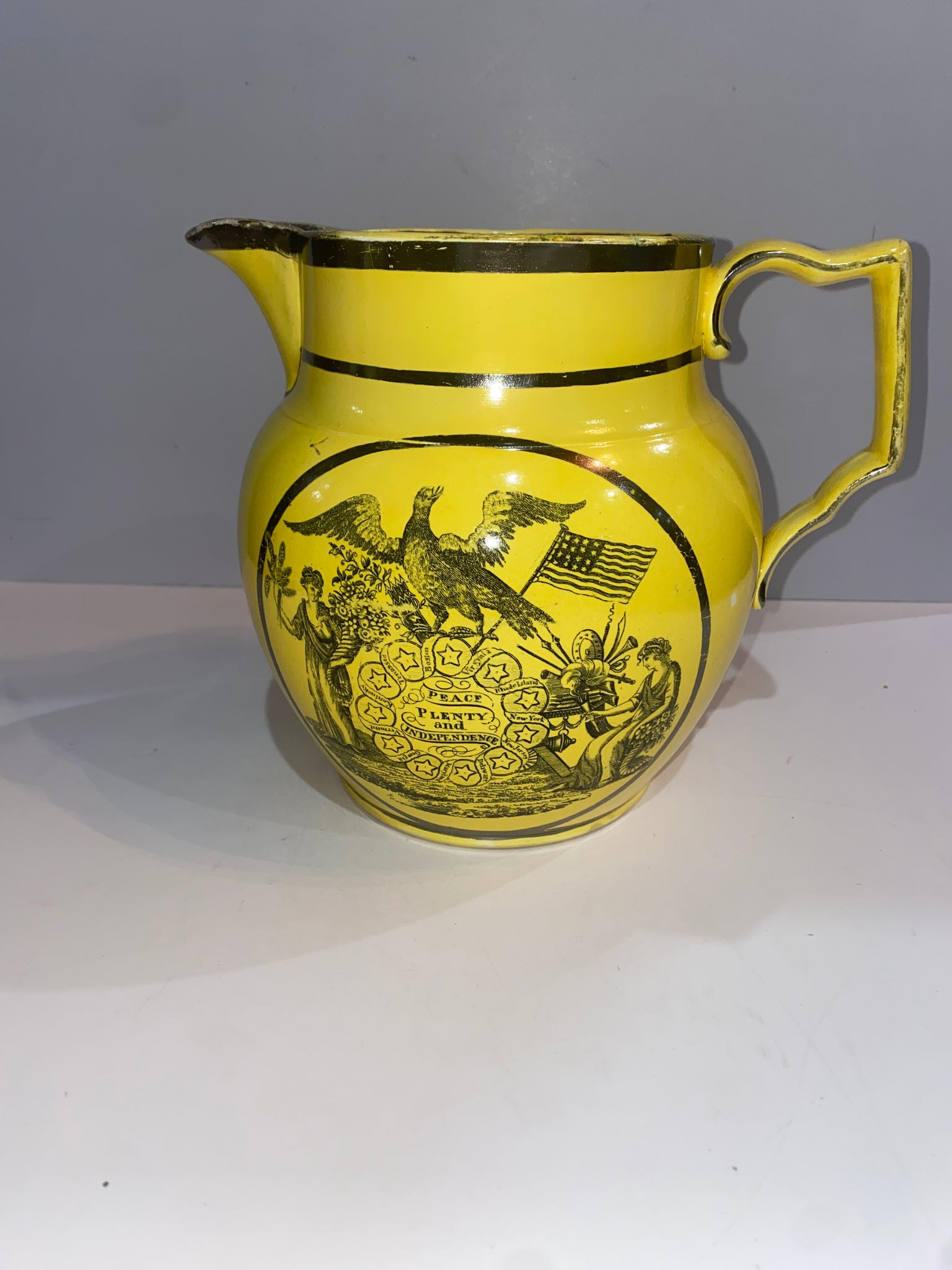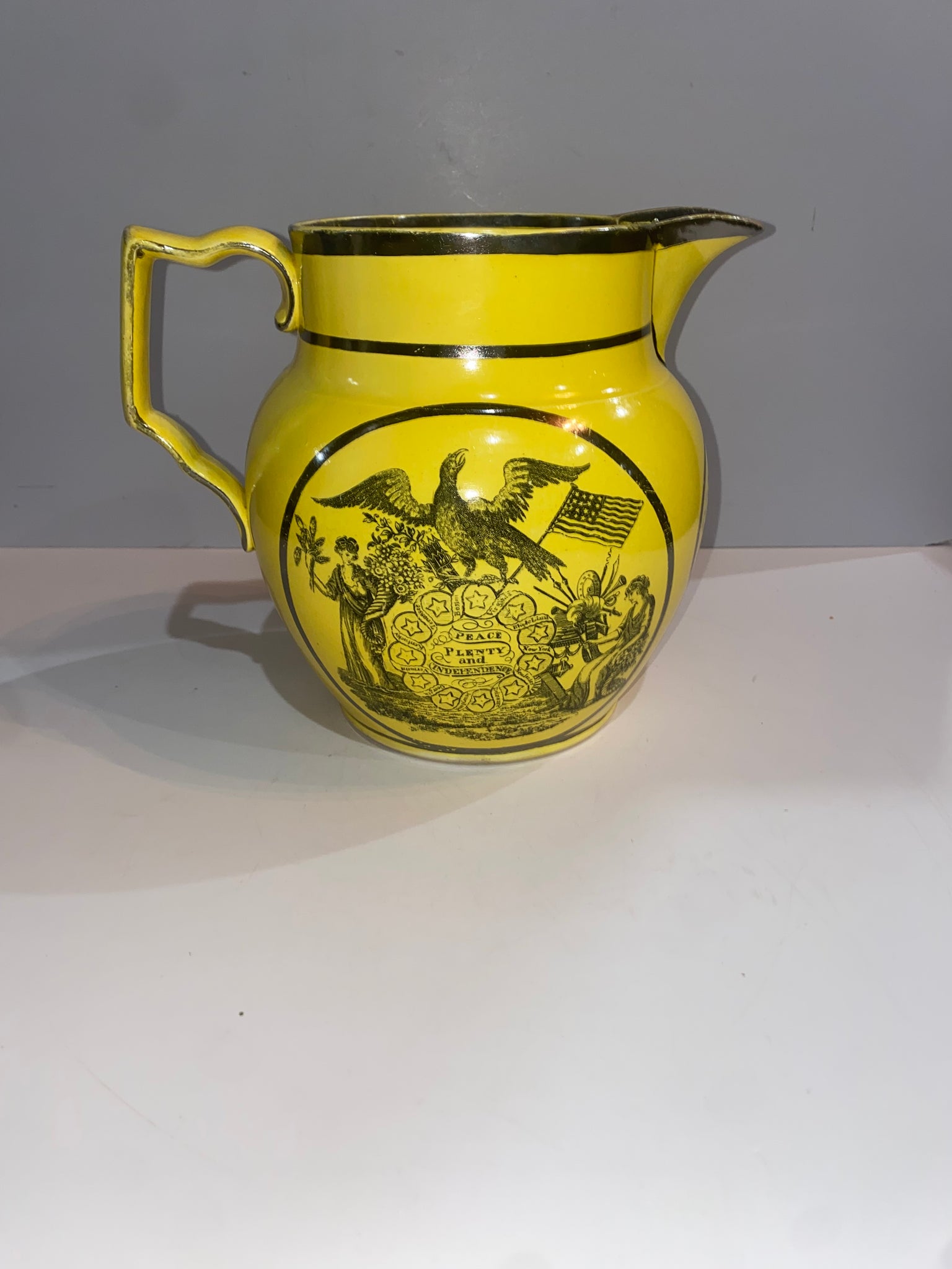 Historical Staffordshire canary pitcher with “Peace, Plenty and Independence” on both sides and under the spout “Peace and Prosperity to America”. Very neat pitcher with silver luster accents. Displays as perfect with professional repairs to some hairlines which most of were on the bottom. It measures 7 1/4” tall by 8 1/2” from the tip of the spout to the handle and it dates circa 1825.