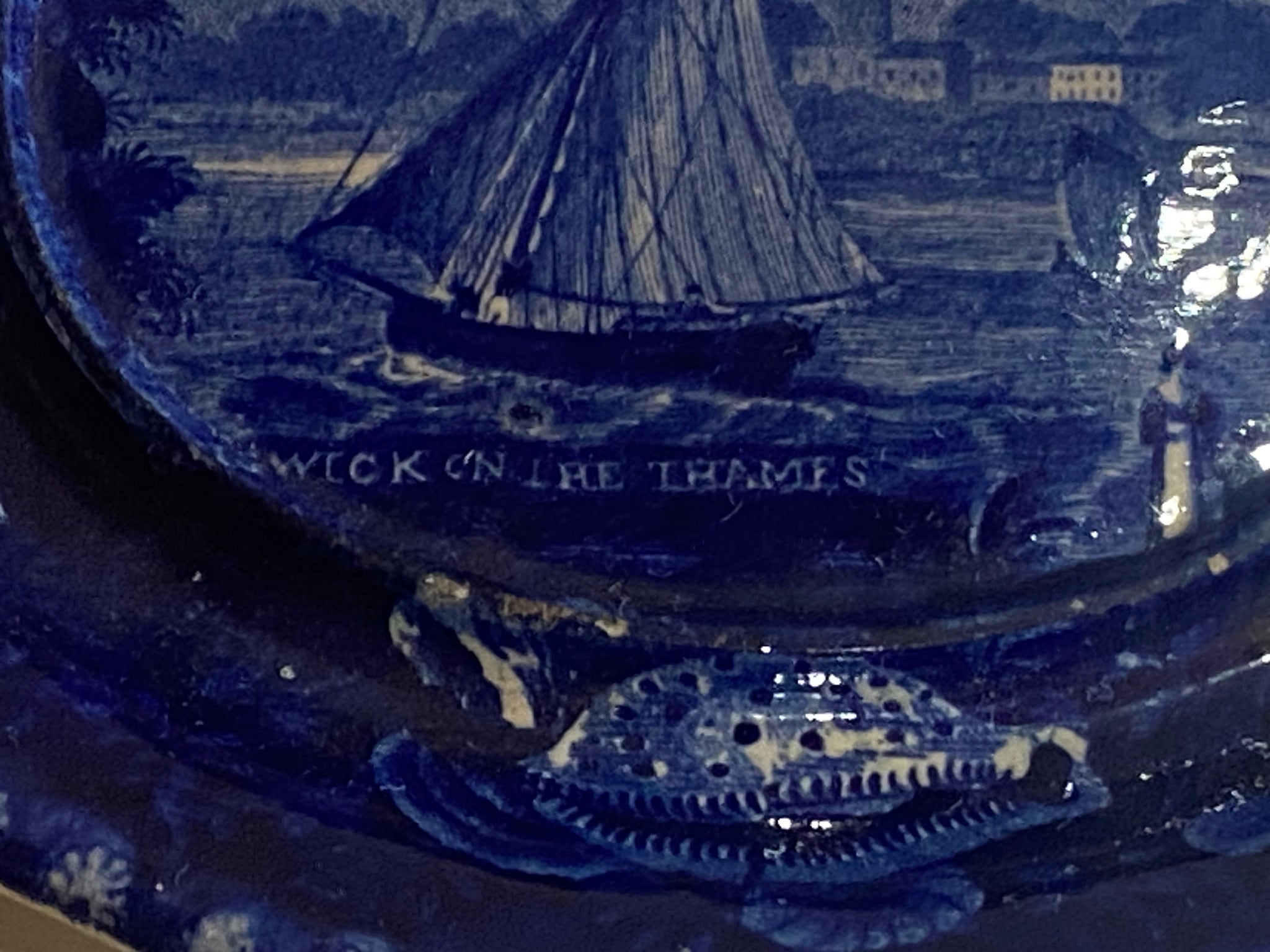 Historical Staffordshire blue gravy tureen tray with view of “Cheswick on the Thames”. In fair condition with some light staining and short hairline. It measures 6 1/4” by 8”. Made by Enoch Wood & Sons circa 1825.