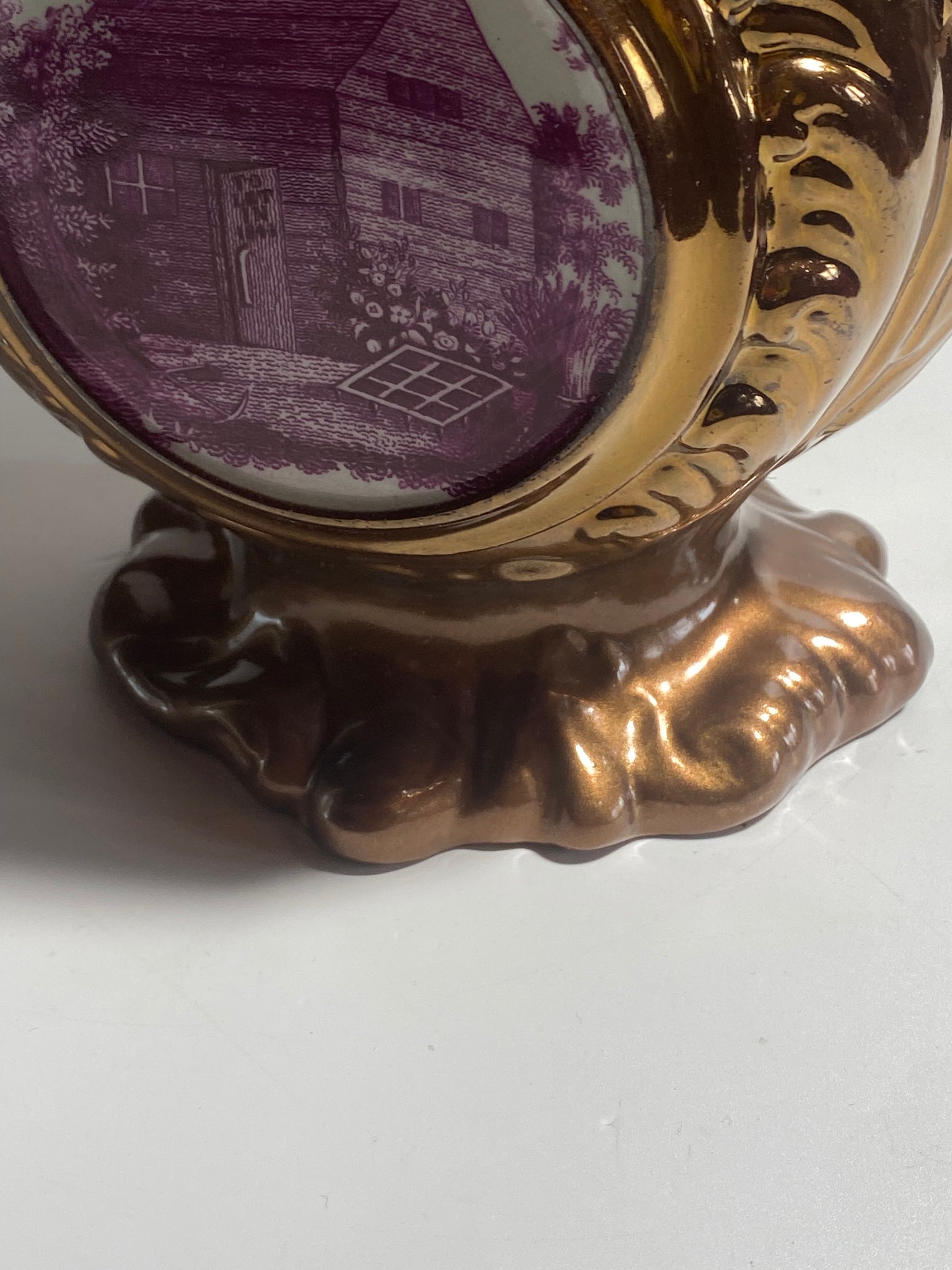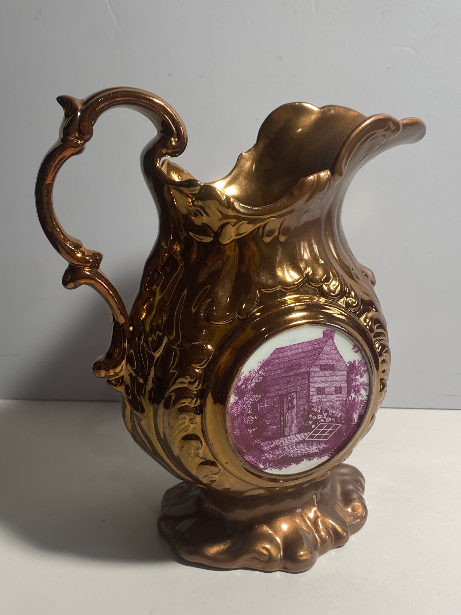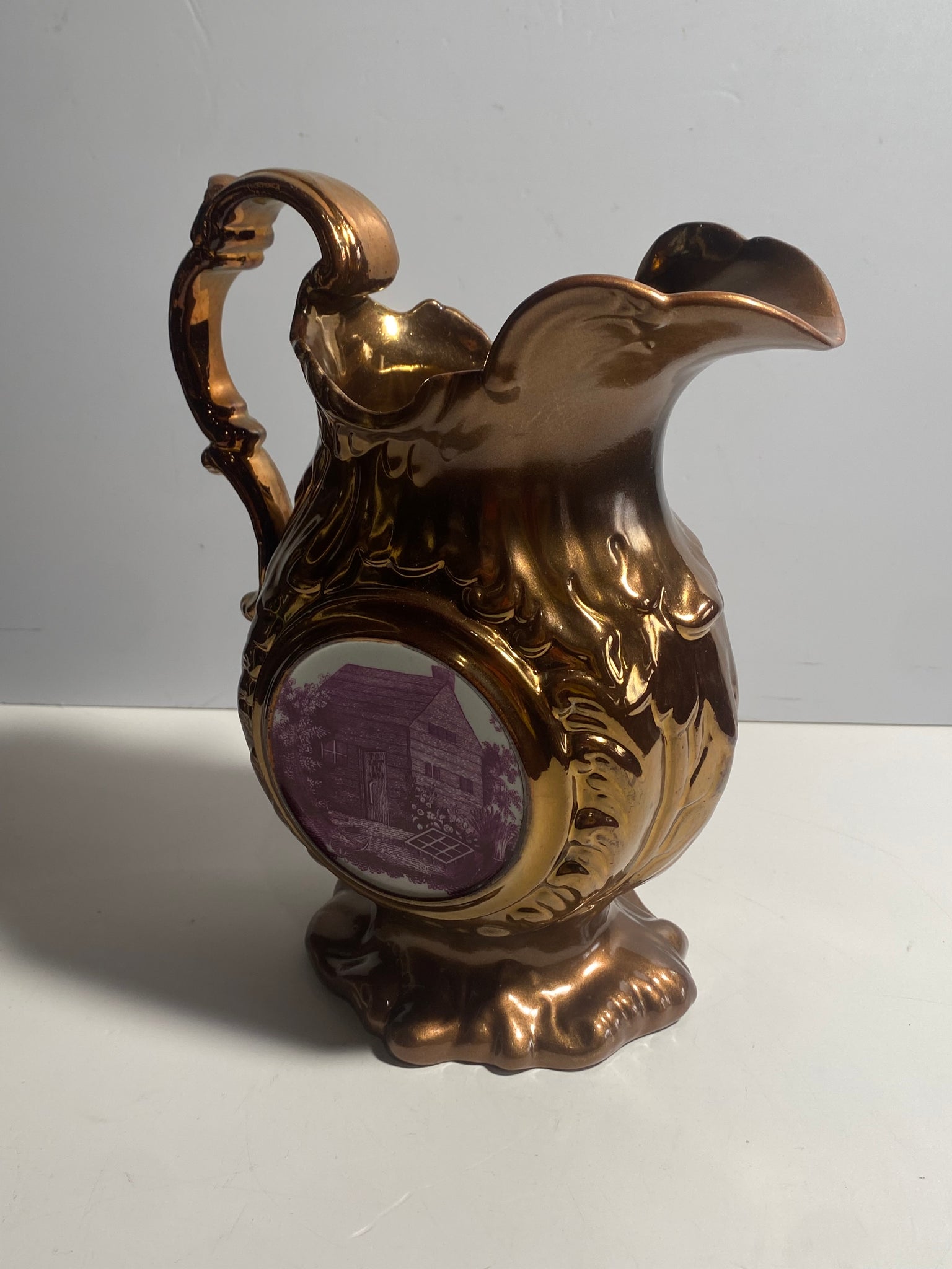 Historical Staffordshire copper luster pitcher with William Henry Harrison on one side and a log cabin on the other side. This piece displays very well with a professional repair to the foot and spout. It measures 7 3/4” from the spout to the handle by 9 1/2” tall and dates circa 1840’s.