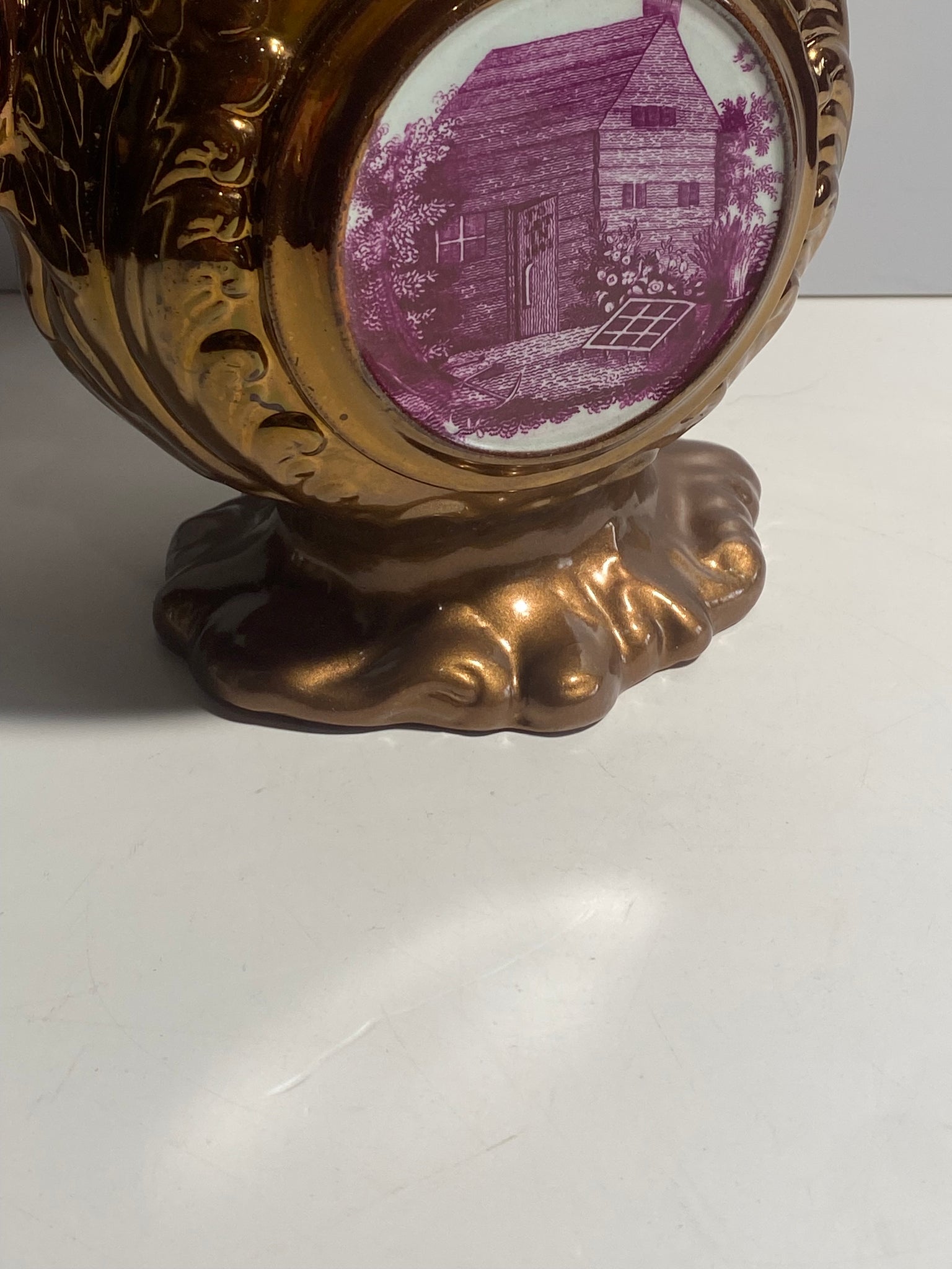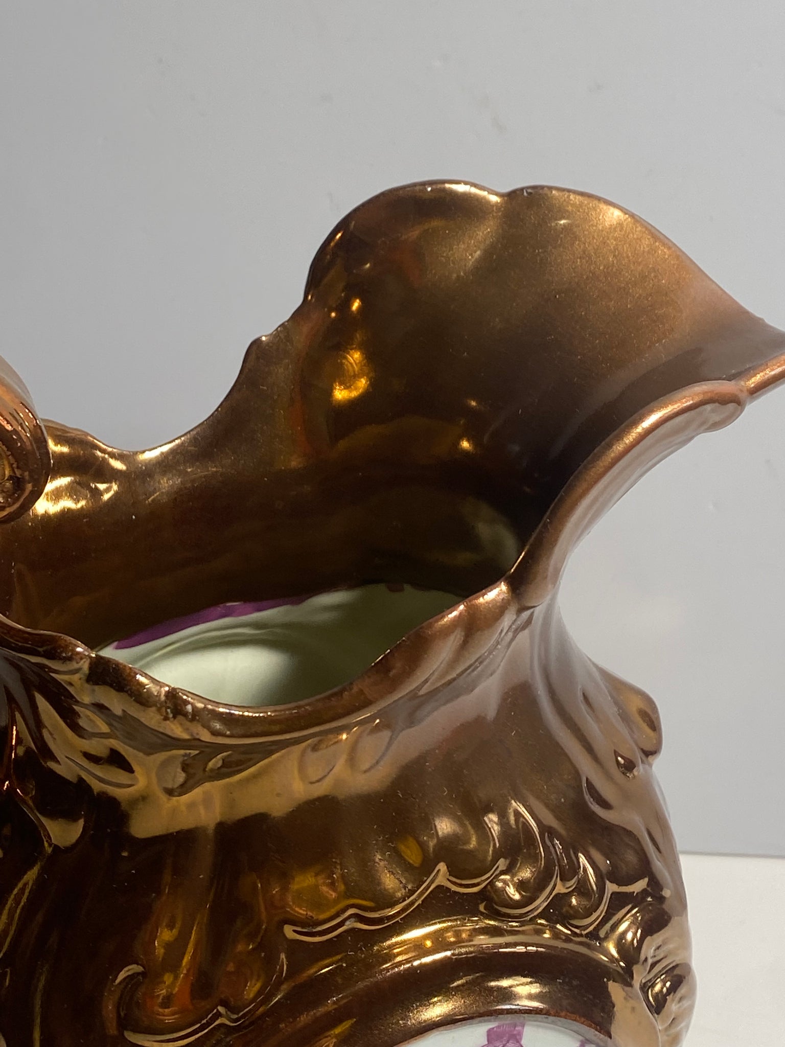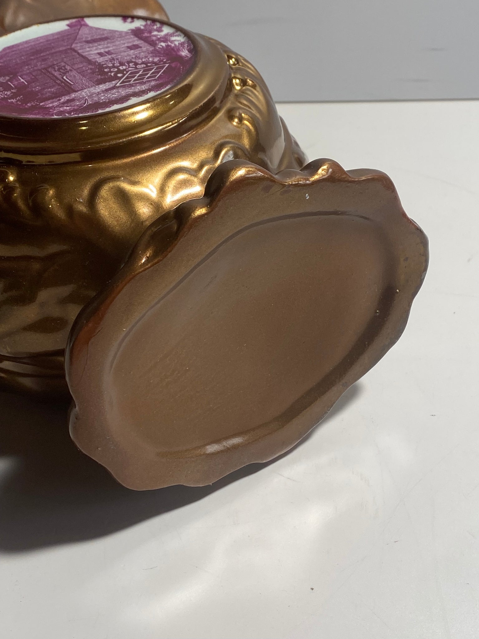 Historical Staffordshire copper luster pitcher with William Henry Harrison on one side and a log cabin on the other side. This piece displays very well with a professional repair to the foot and spout. It measures 7 3/4” from the spout to the handle by 9 1/2” tall and dates circa 1840’s.