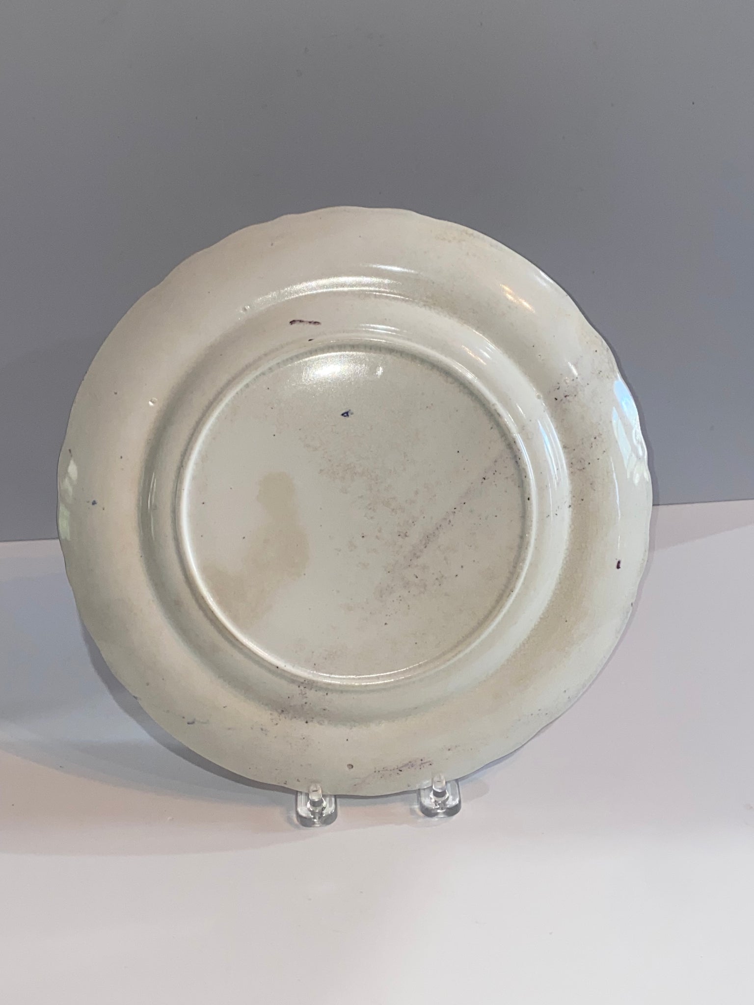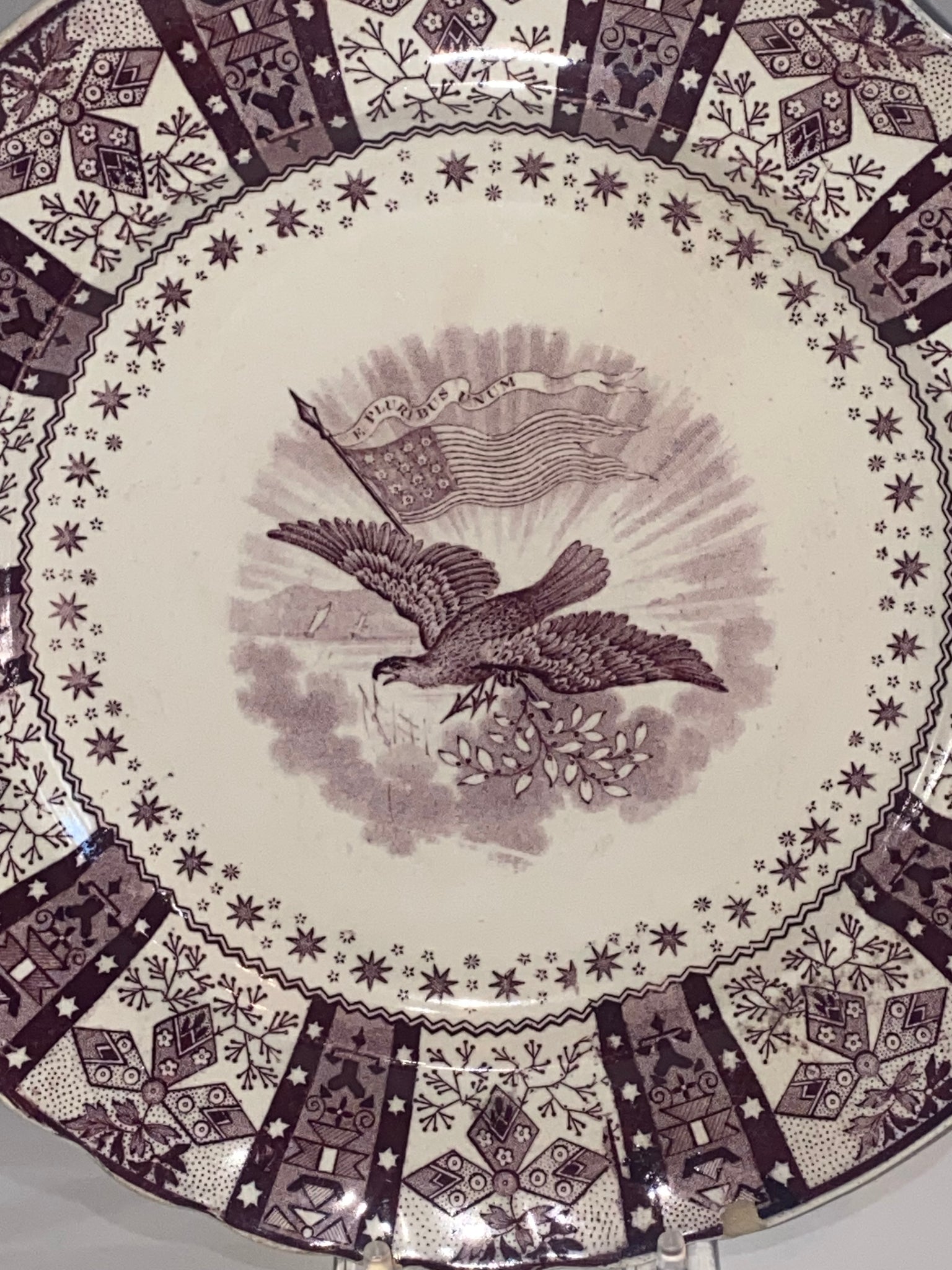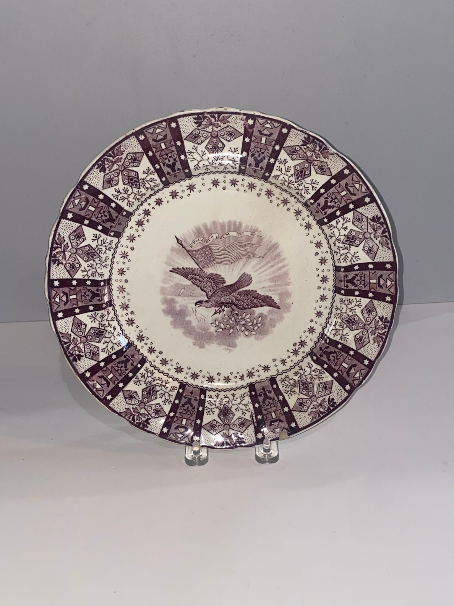 Historical Staffordshire Mulberry transfer plate with Eagle and American Flag. In good condition with one minor small chip on the rim. It measures 10 1/2” in diameter and dates circa 1835.