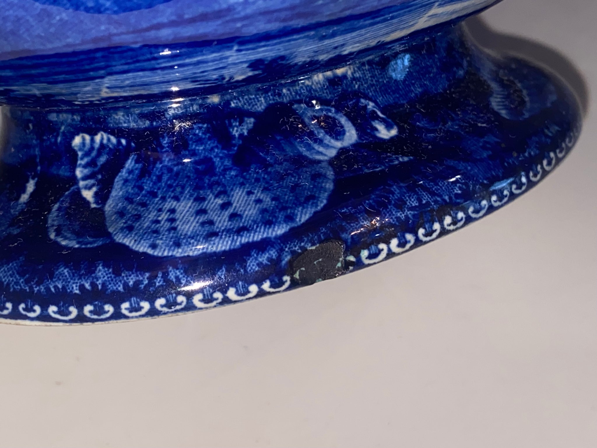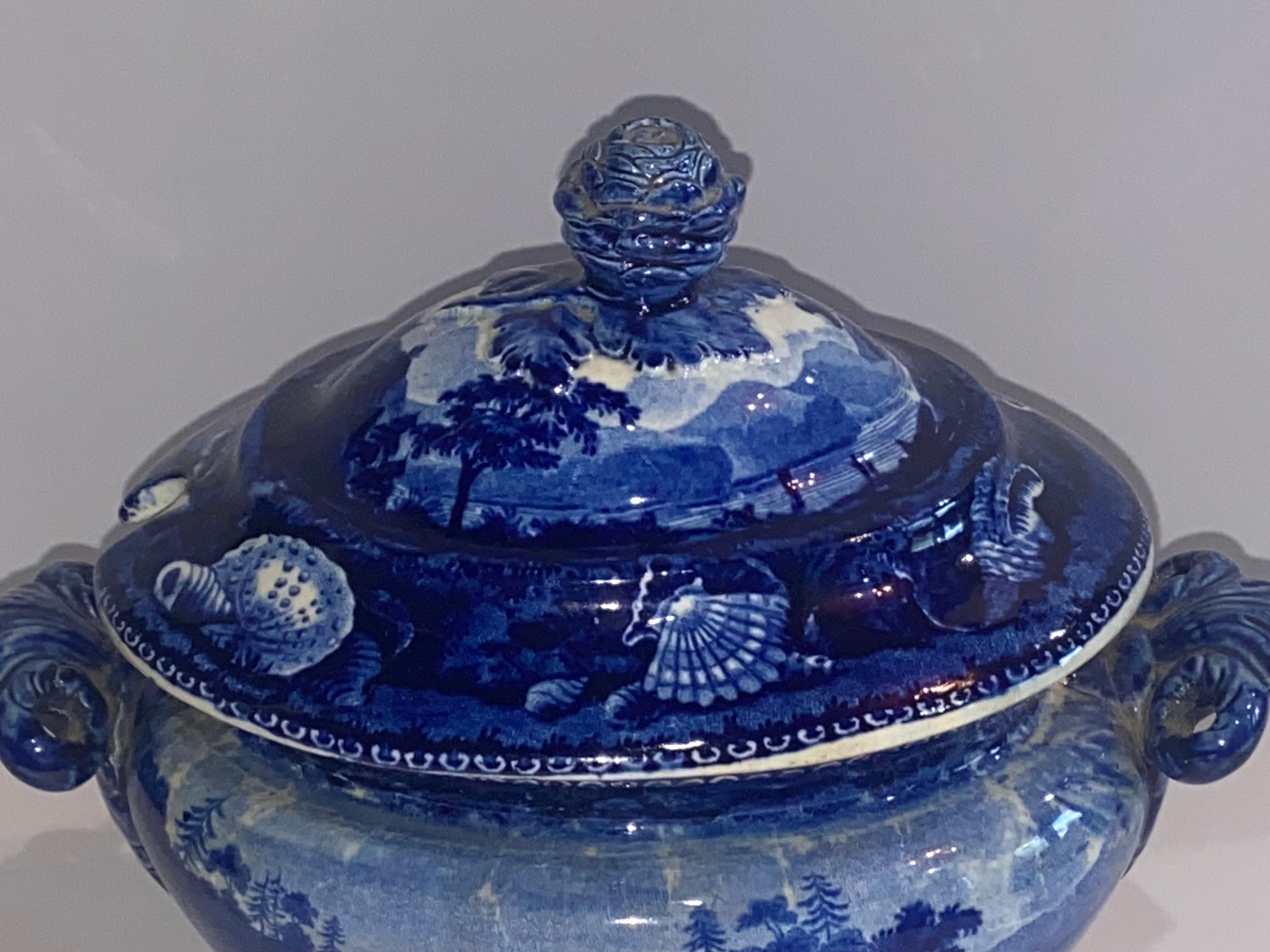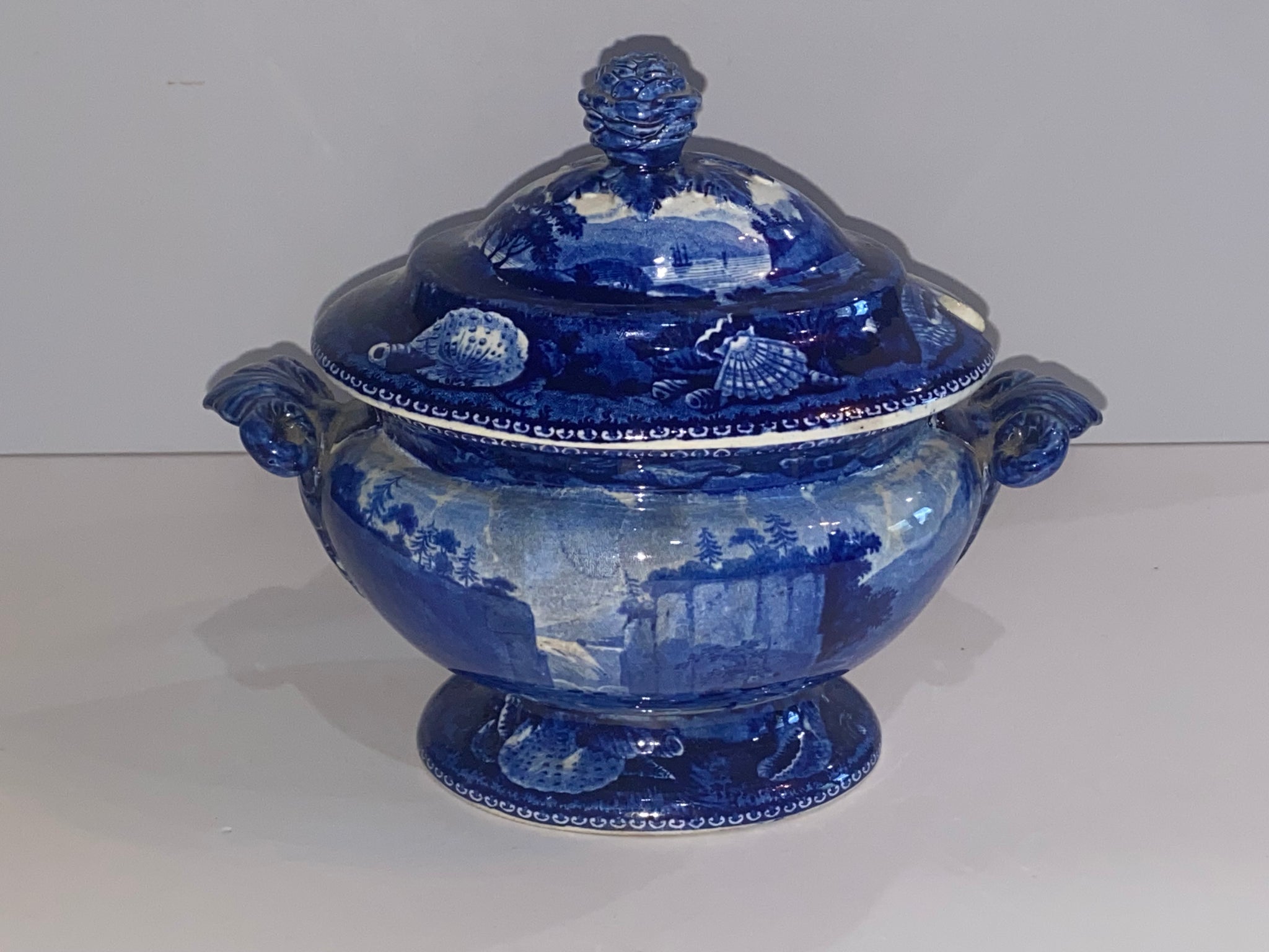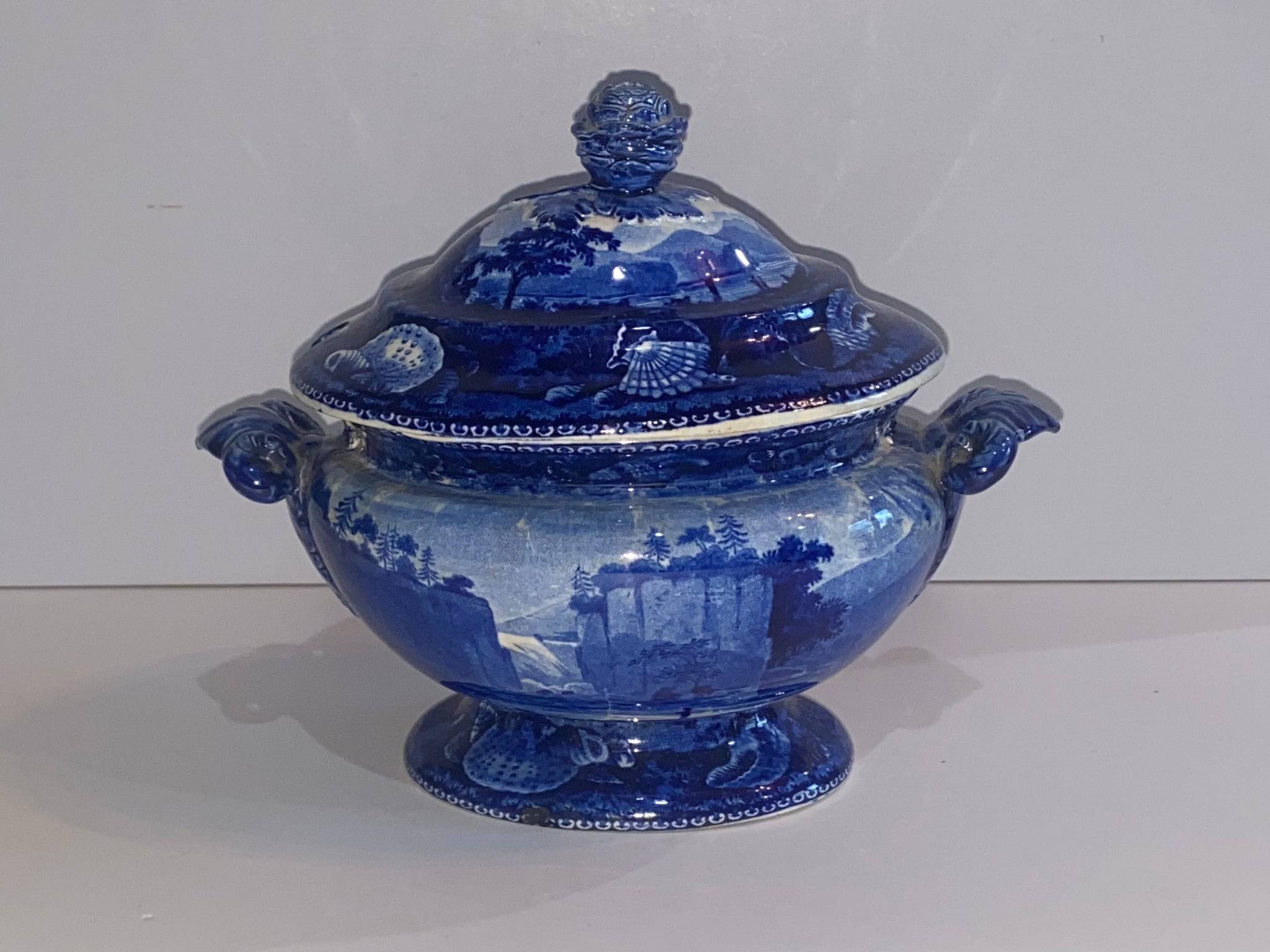 Historical Staffordshire blue gravy tureen with view of Passaic Falls State of New Jersey. Made by Enoch Wood & Sons circa 1825. In very nice condition with just a tiny flake on the foot that is colored in. The base would benefit from a professional cleaning as well but is certainly fine the way it is. Hard to find these hollow pieces in such good condition.